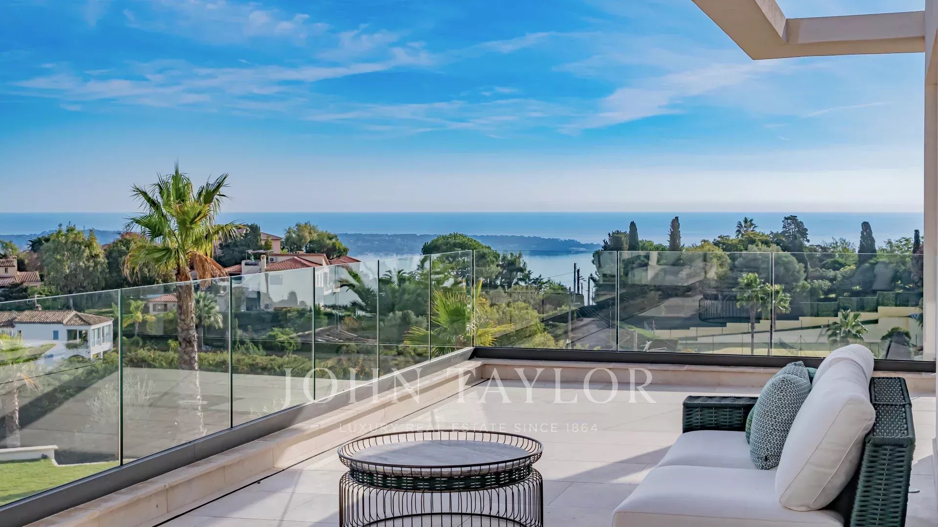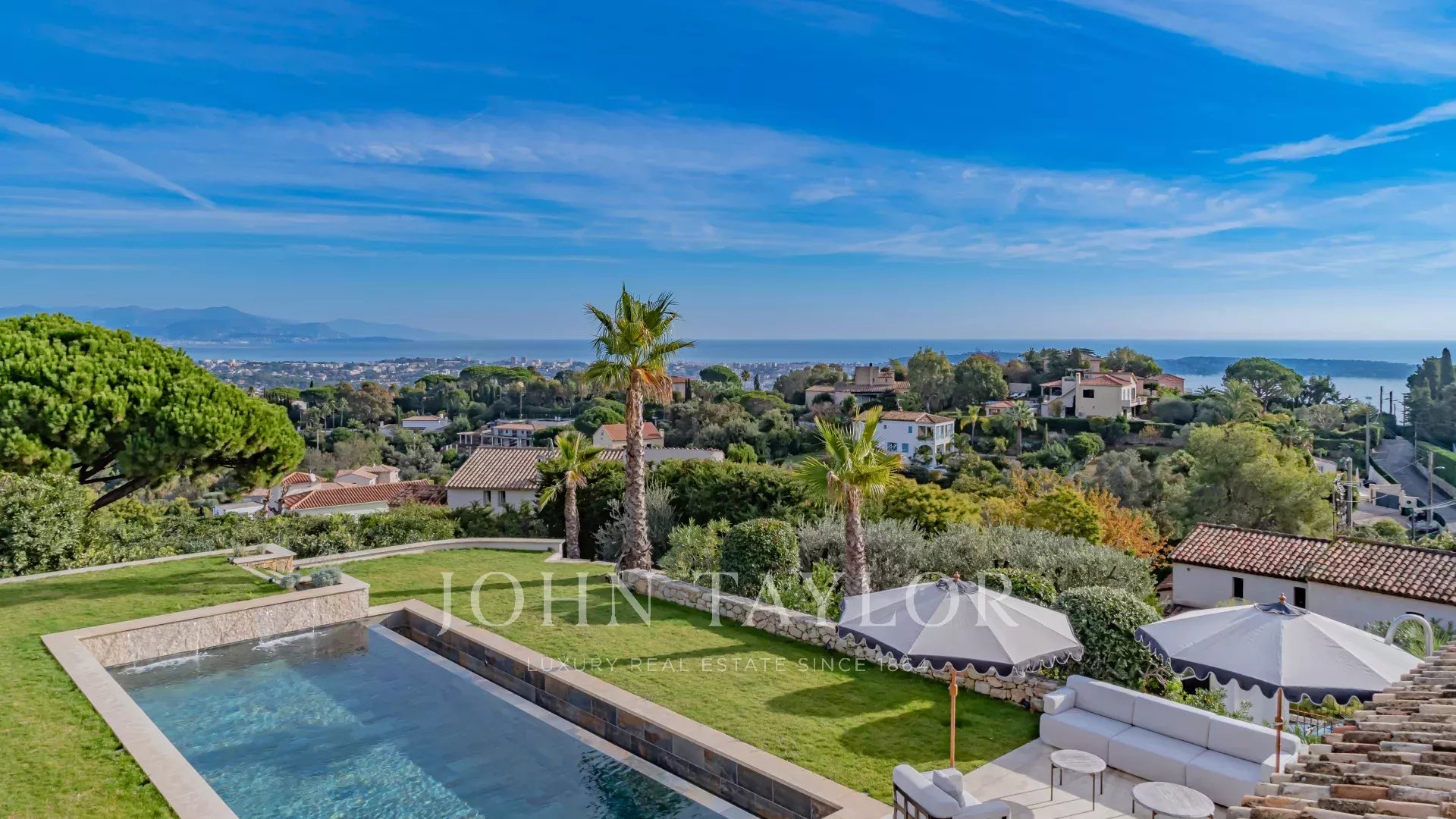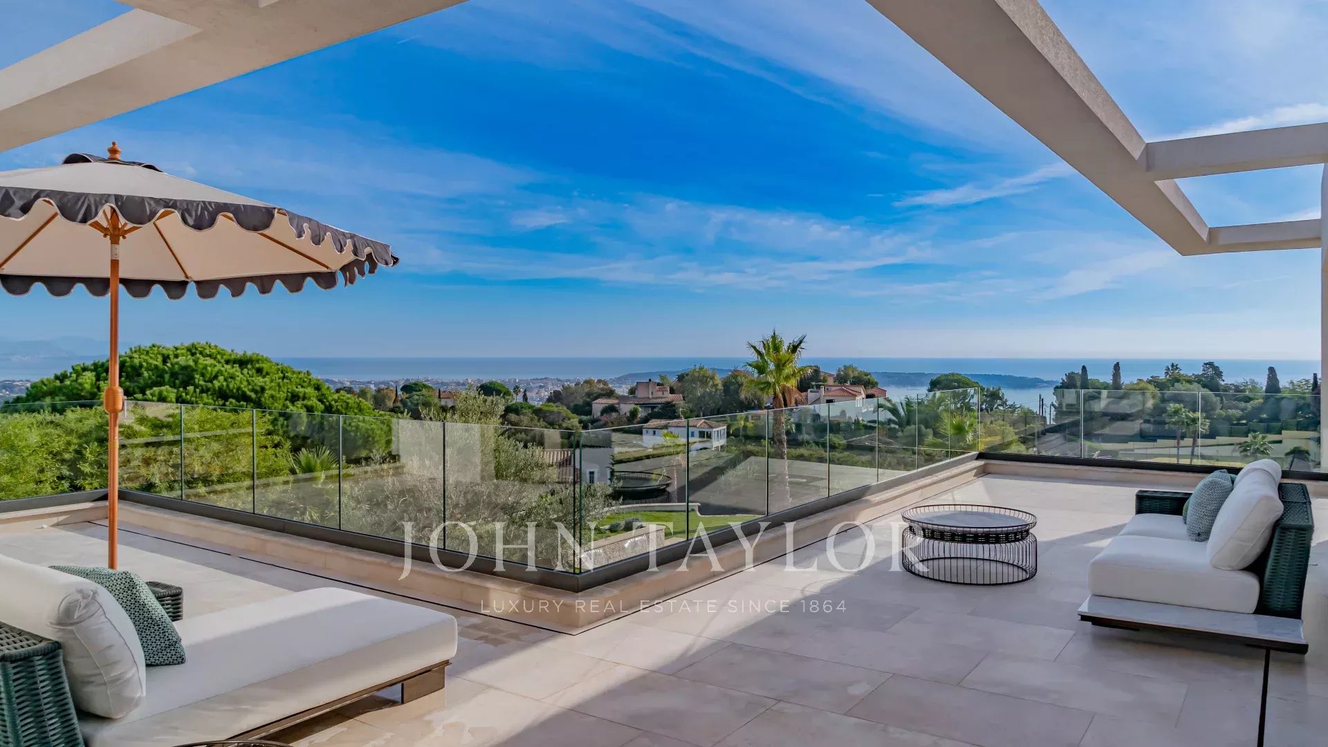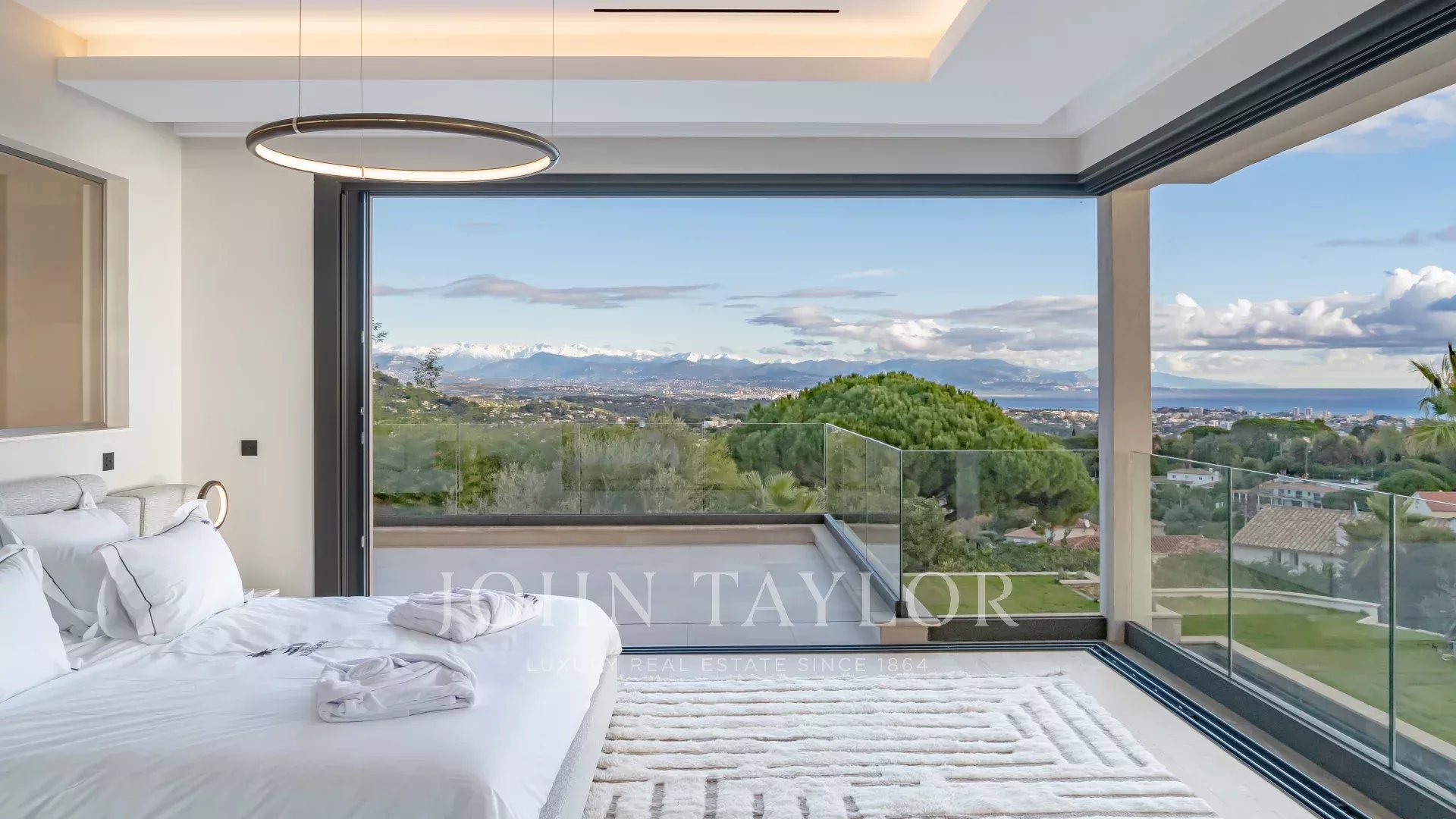 In the prestigious, highly quiet, residential area of Super Cannes, this contemporary villa of approx. 382 sq.m is set in a gated estate. Erected on a 2,090 sq.m plot in a dominant position, the property enjoys a sublime view of Cap d'Antibes, the Alps and the Italian mountains.
