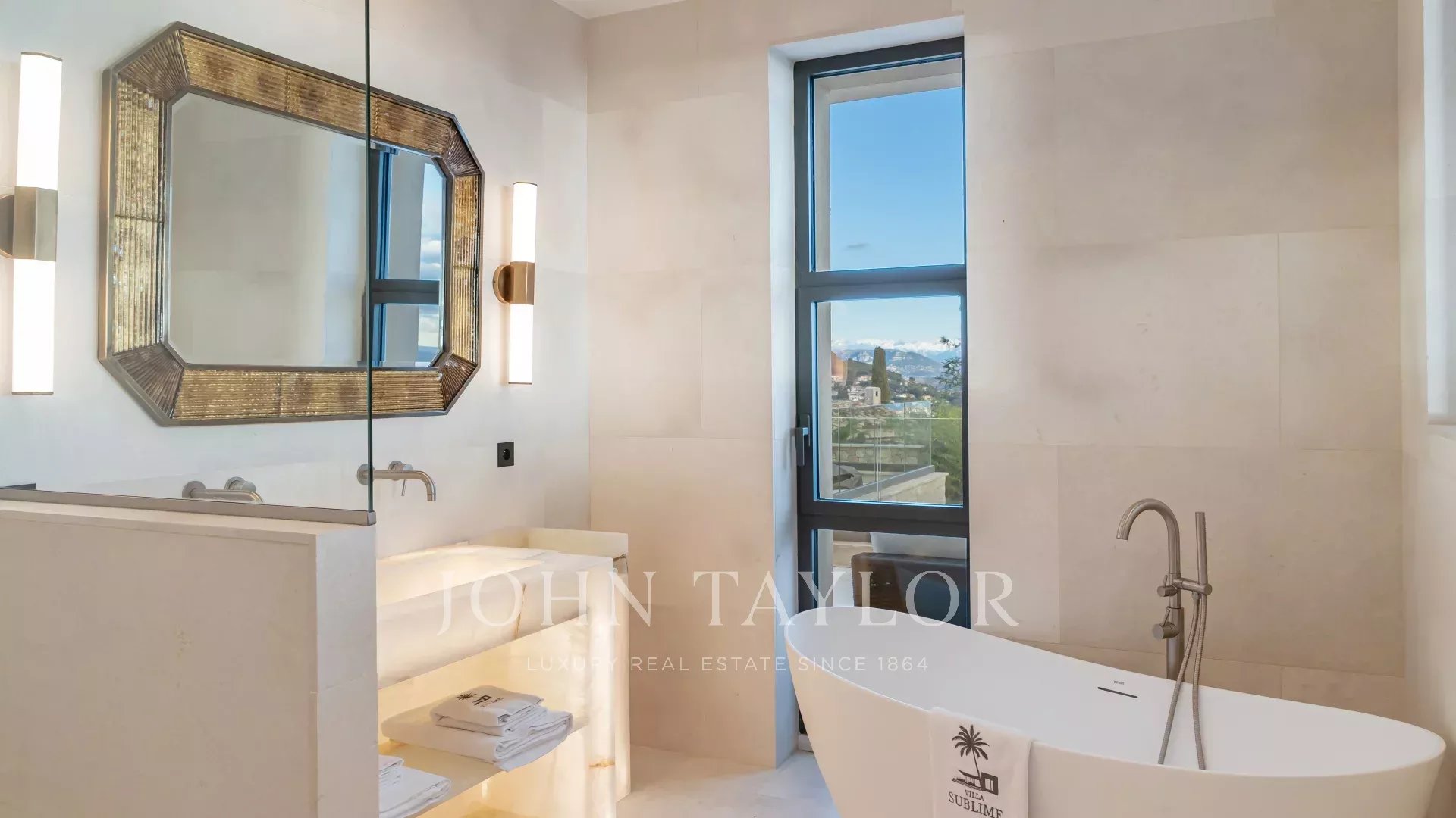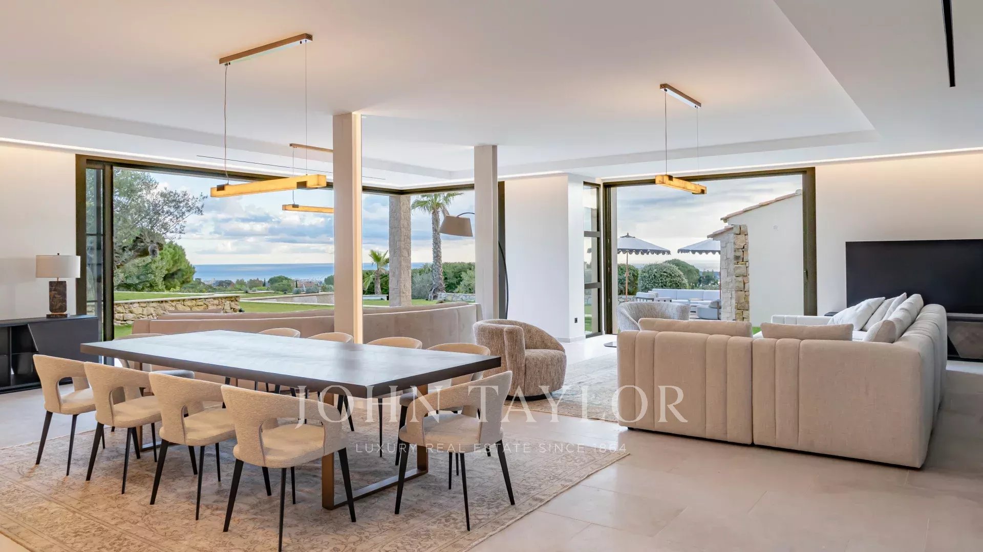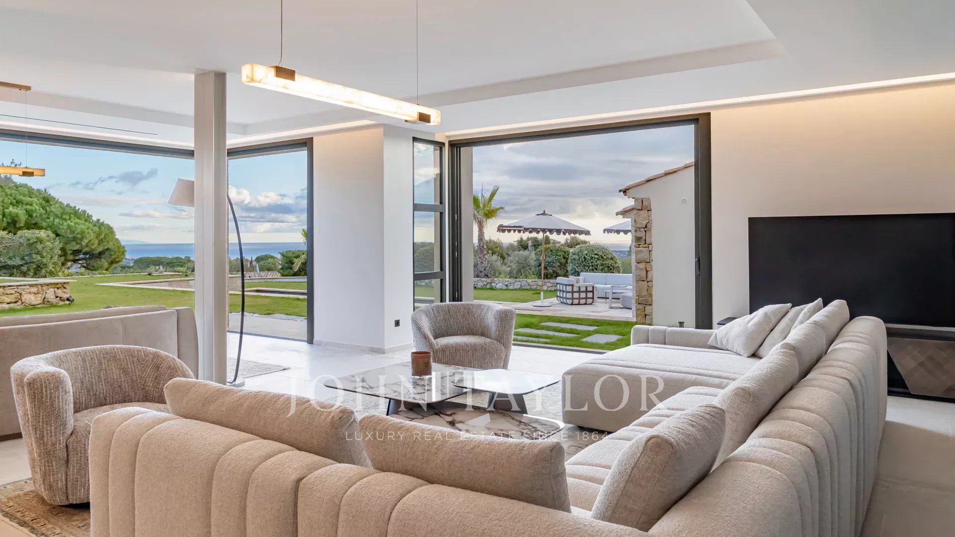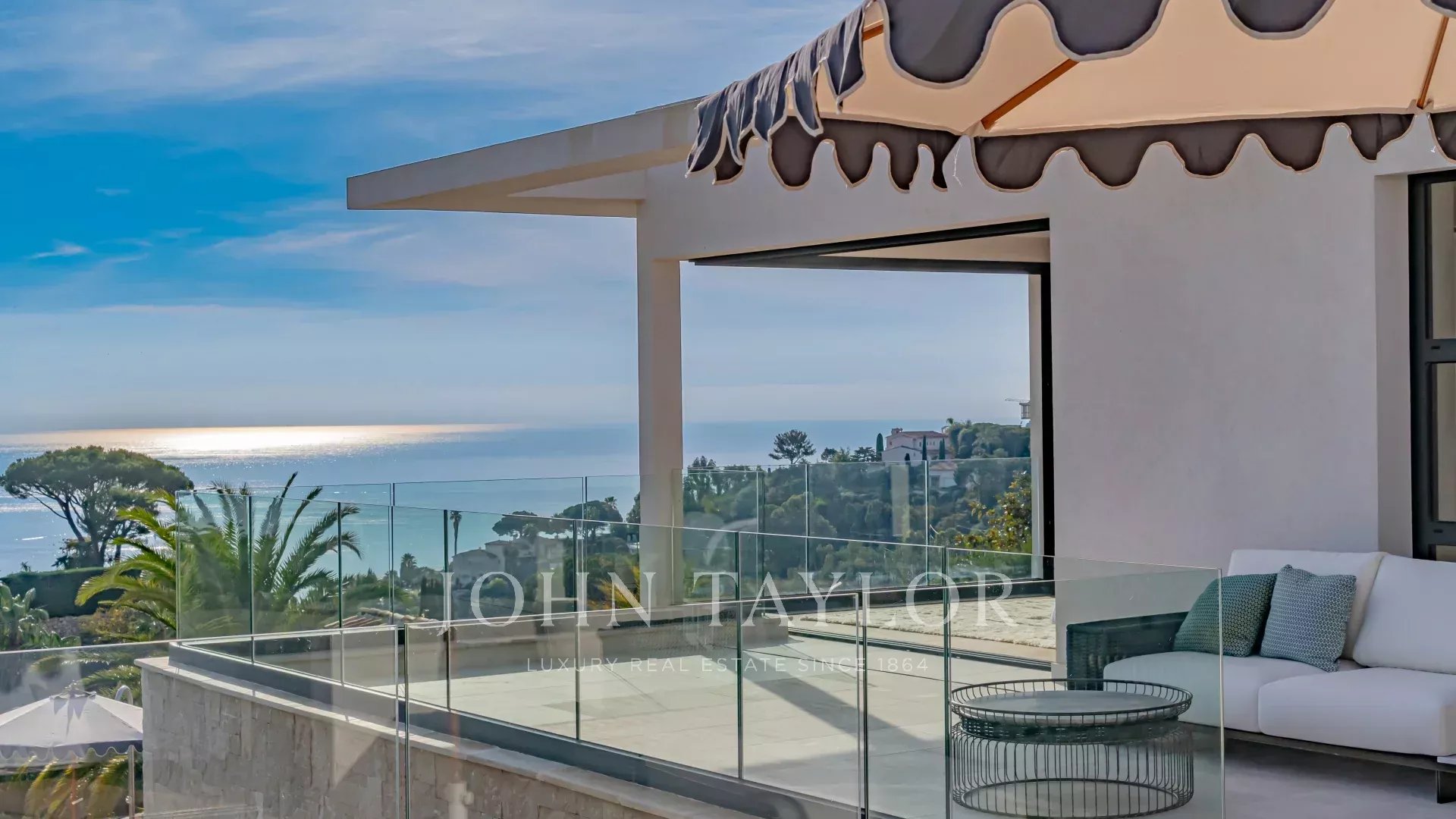 In the prestigious, highly quiet, residential area of Super Cannes, this contemporary villa of approx. 382 sq.m is set in a gated estate. Erected on a 2,090 sq.m plot in a dominant position, the property enjoys a sublime view of Cap d'Antibes, the Alps and the Italian mountains.