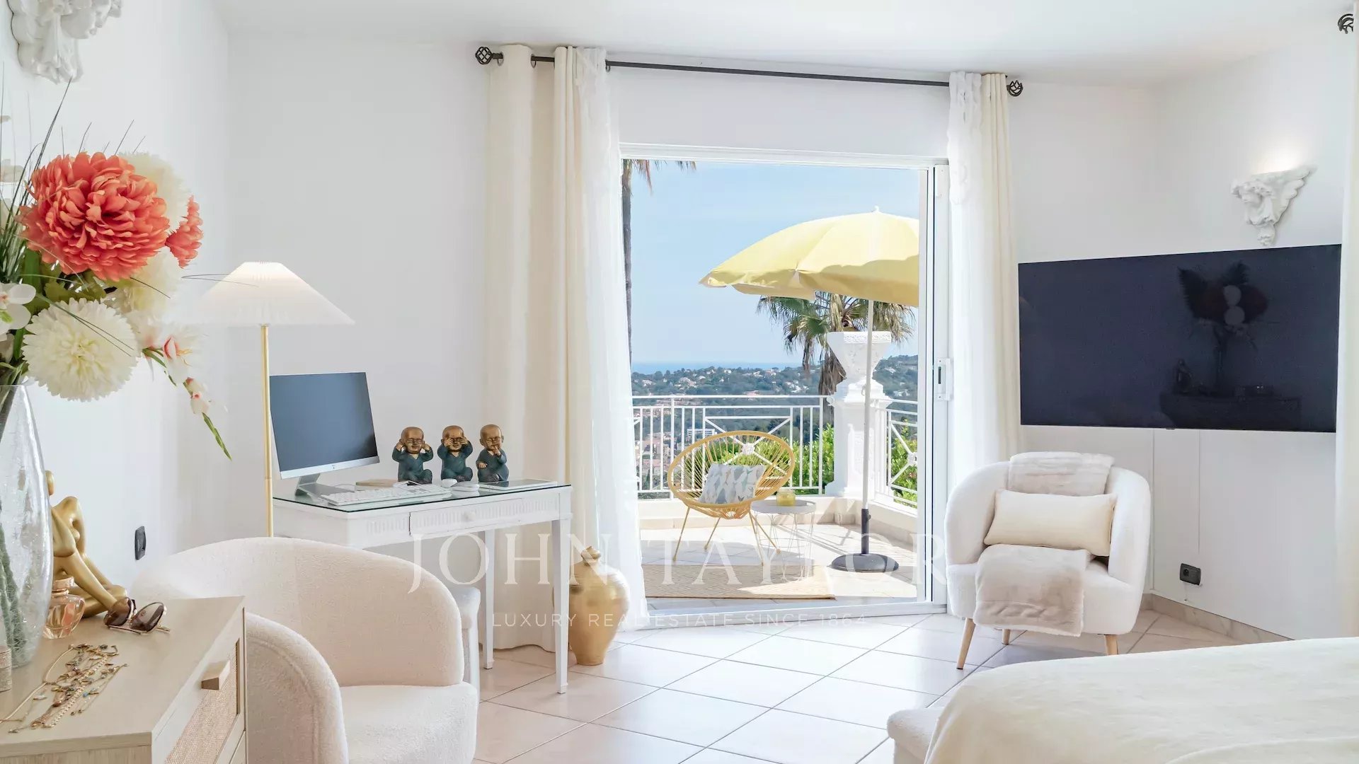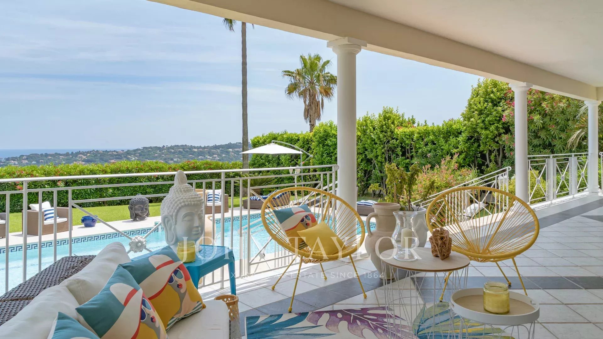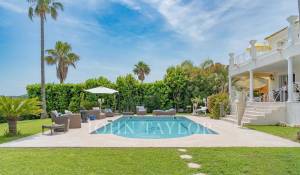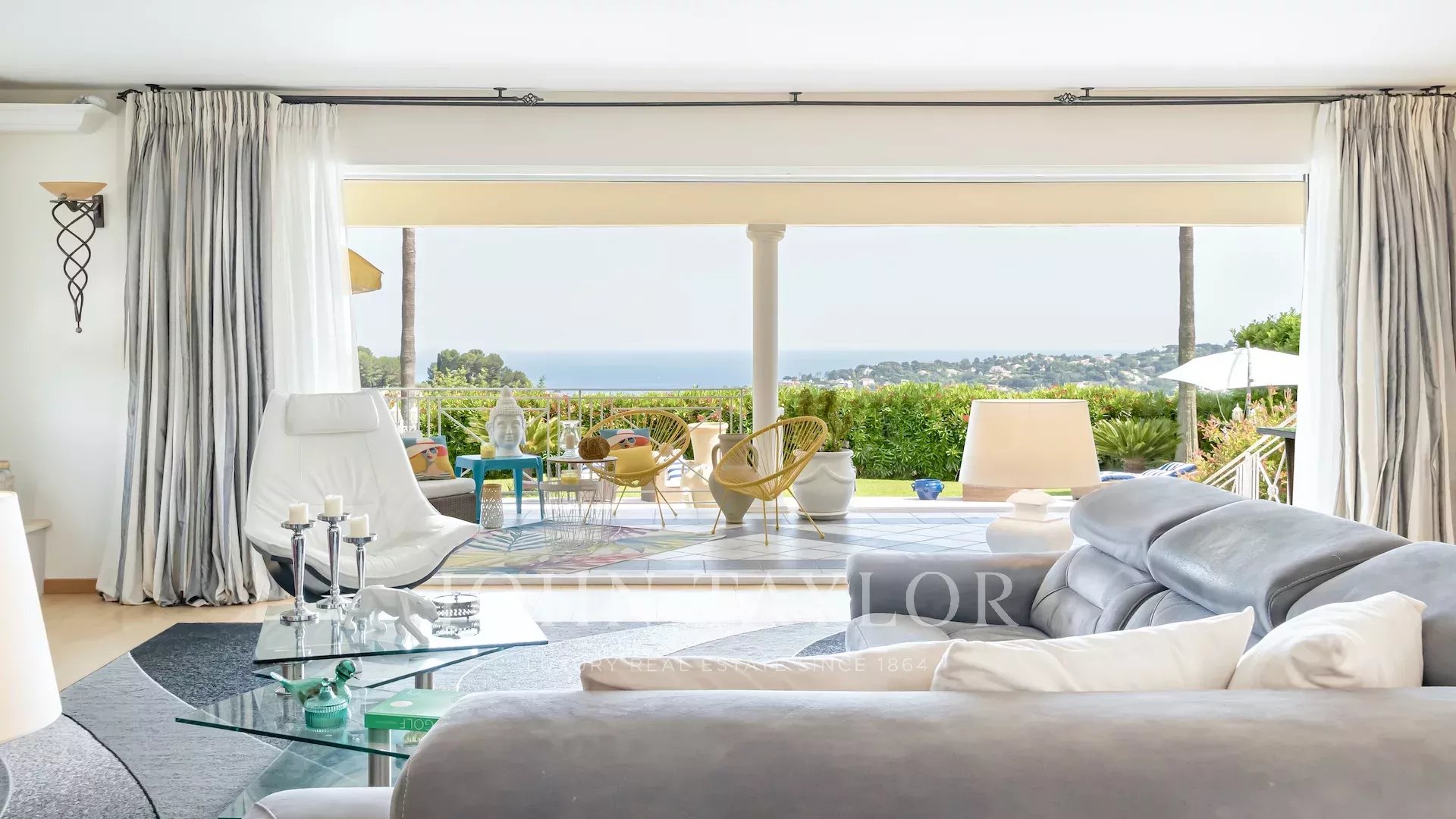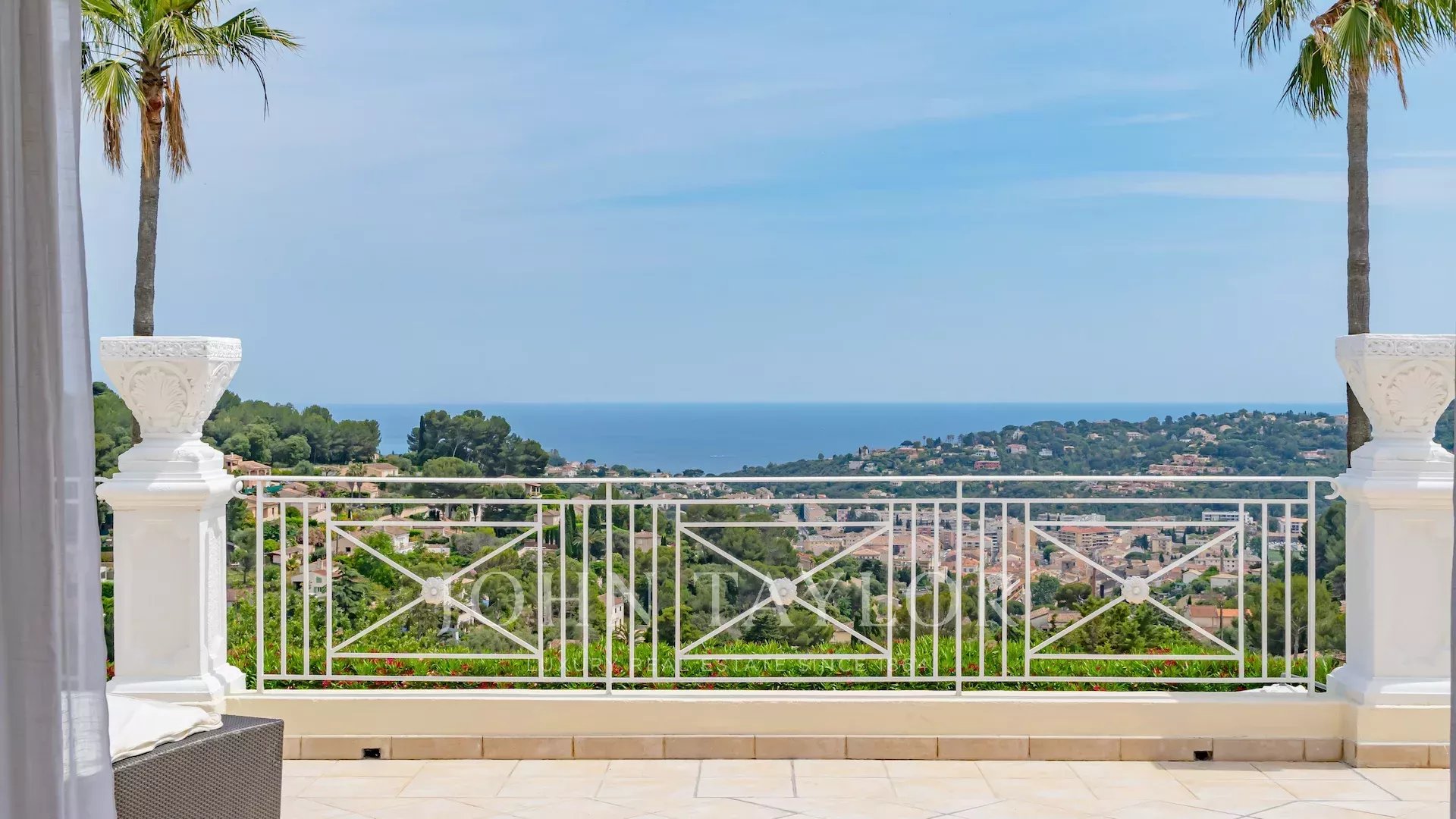 Located on the heights of Vallauris in a quiet, gated estate, this beautiful, fully-renovated villa offers top-quality amenities and an unobstructed view of the sea and rolling green hills.