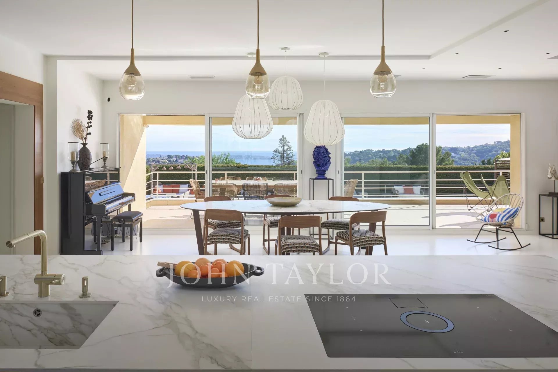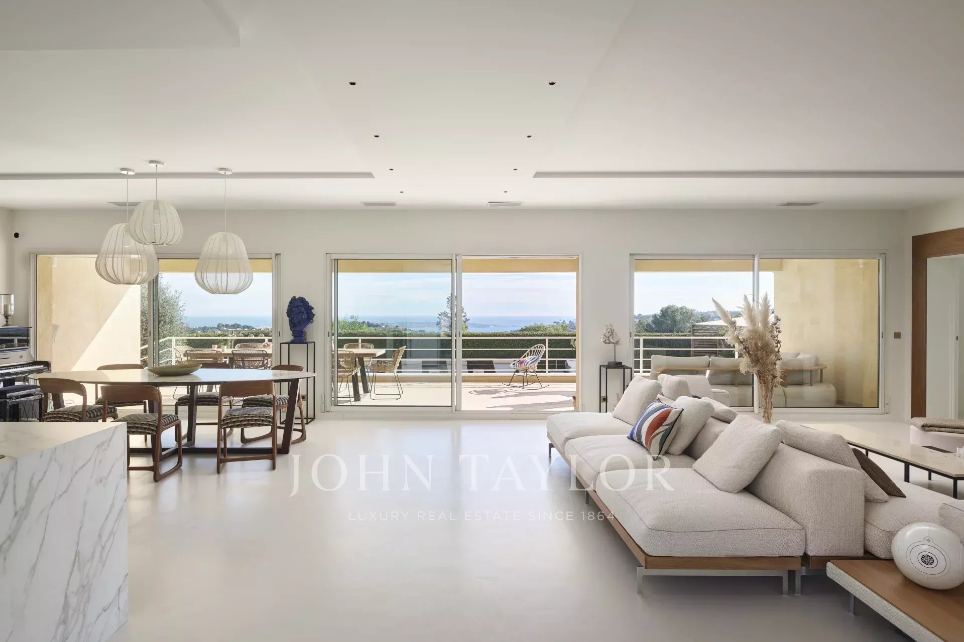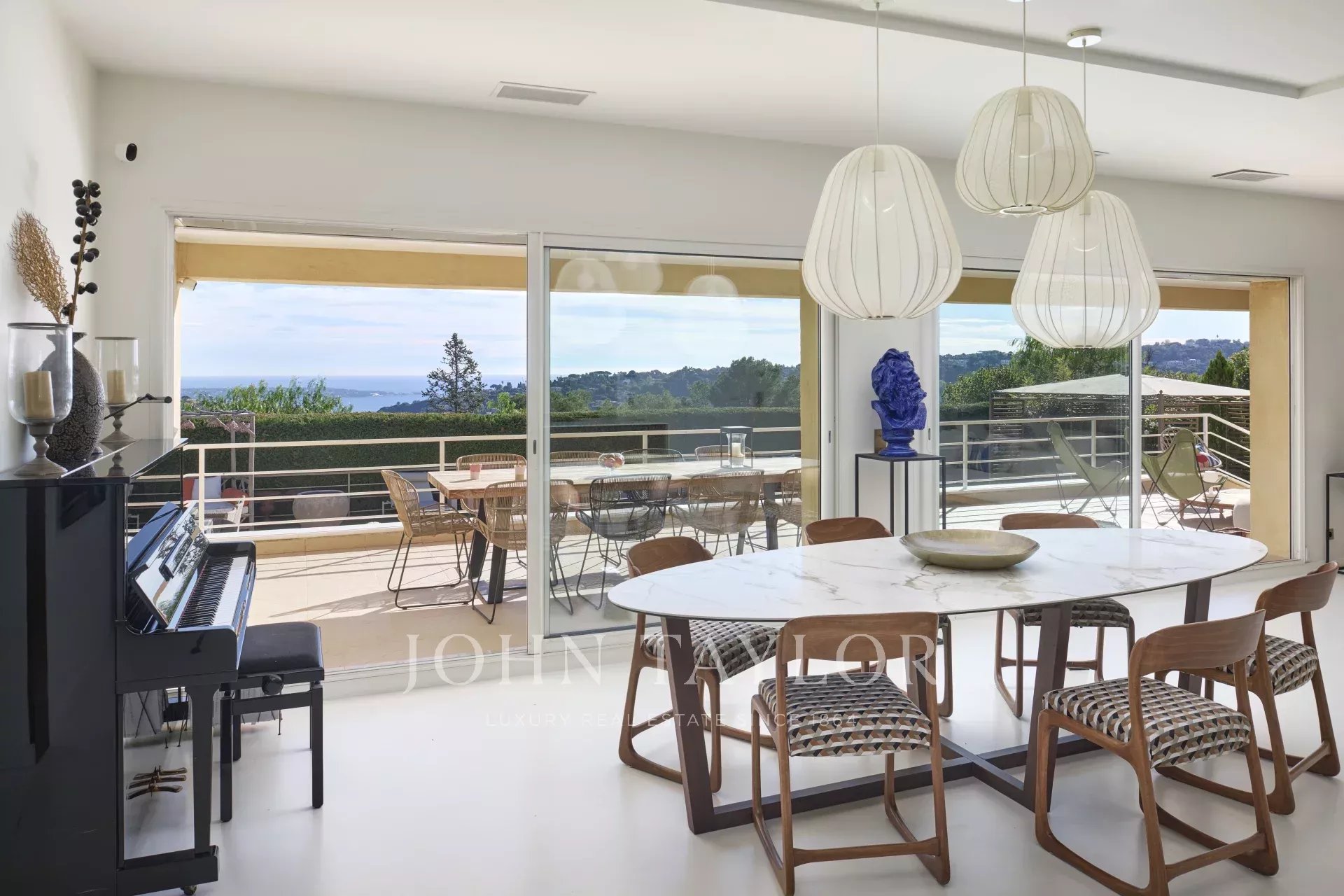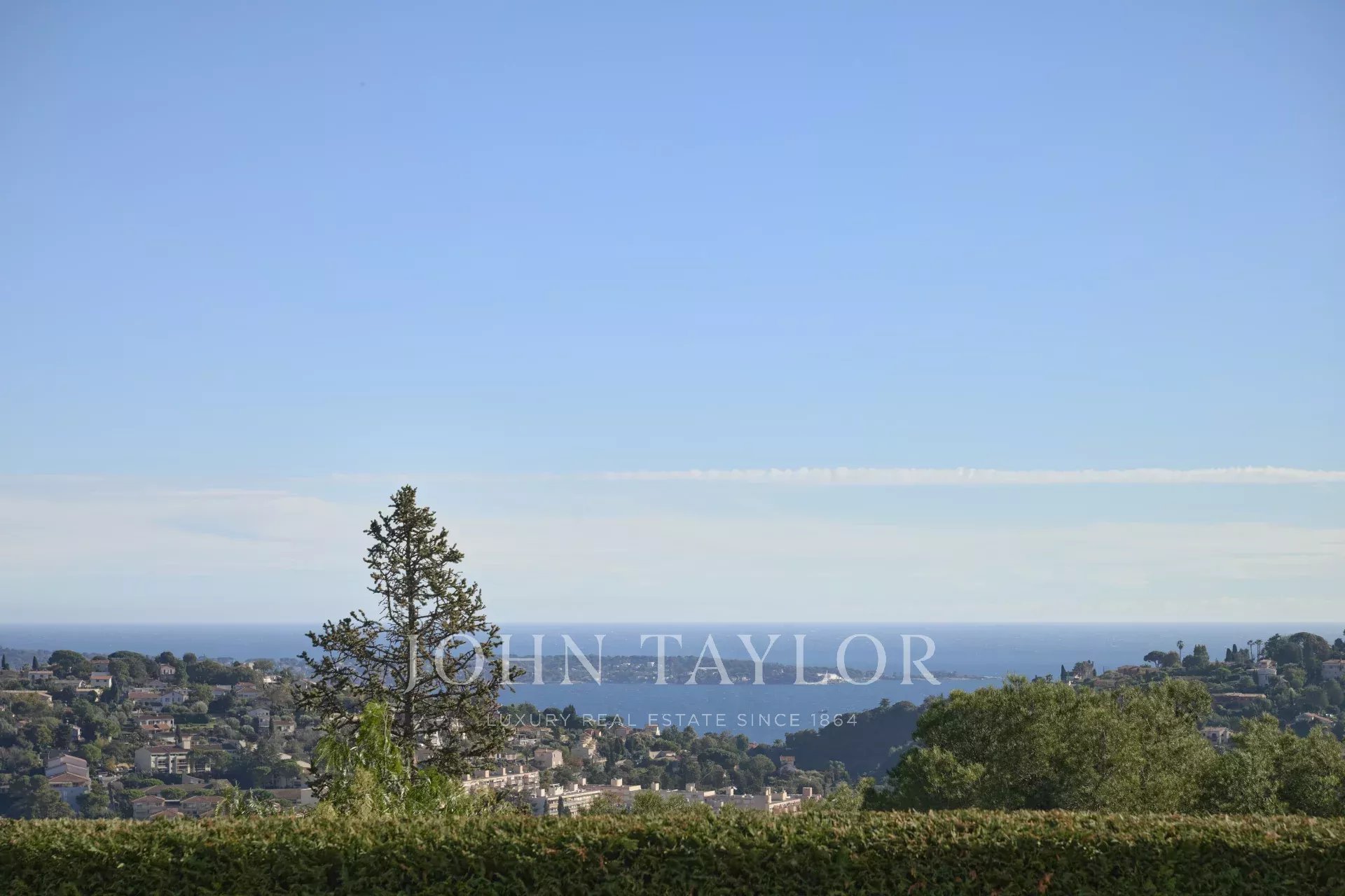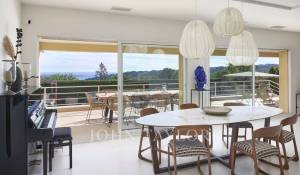 In the hills above Vallauris, just a short distance from the main roads and the center of Cannes, this attractive, modern single-storey villa offers panoramic views of the sea, Cap d'Antibes and the mountains.