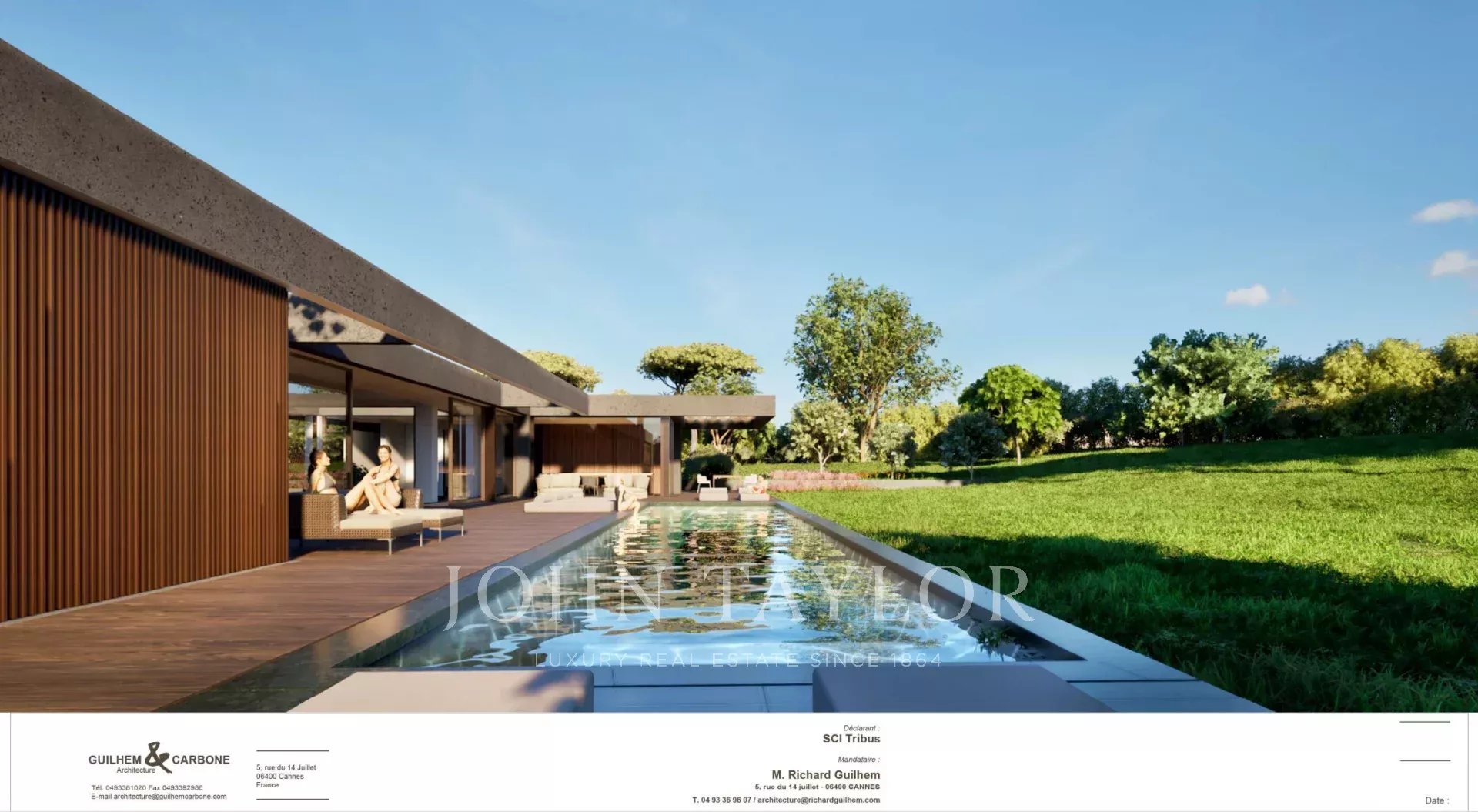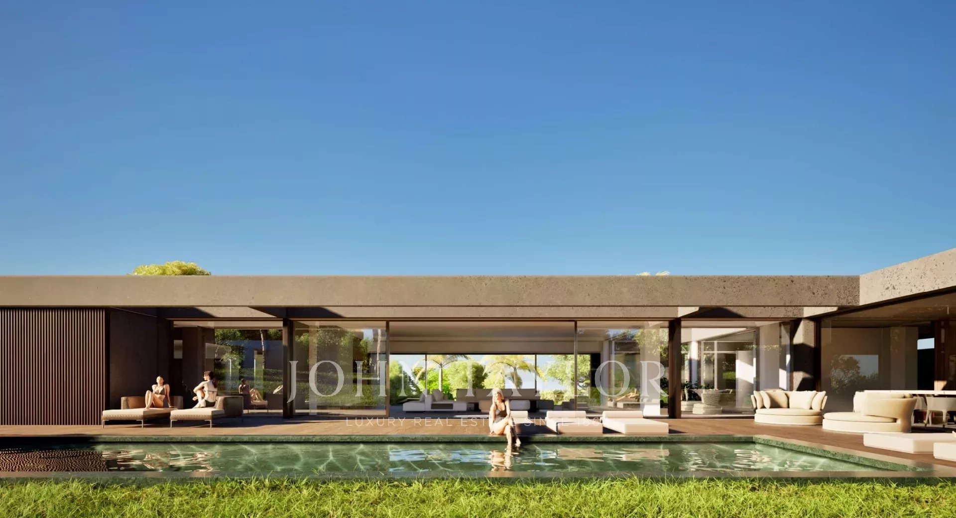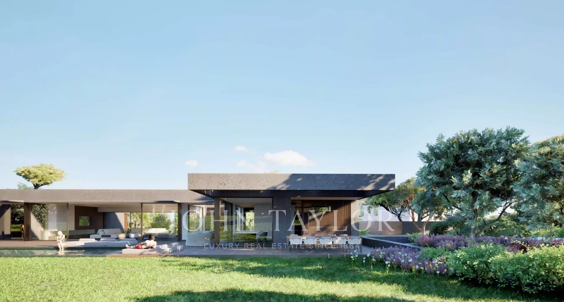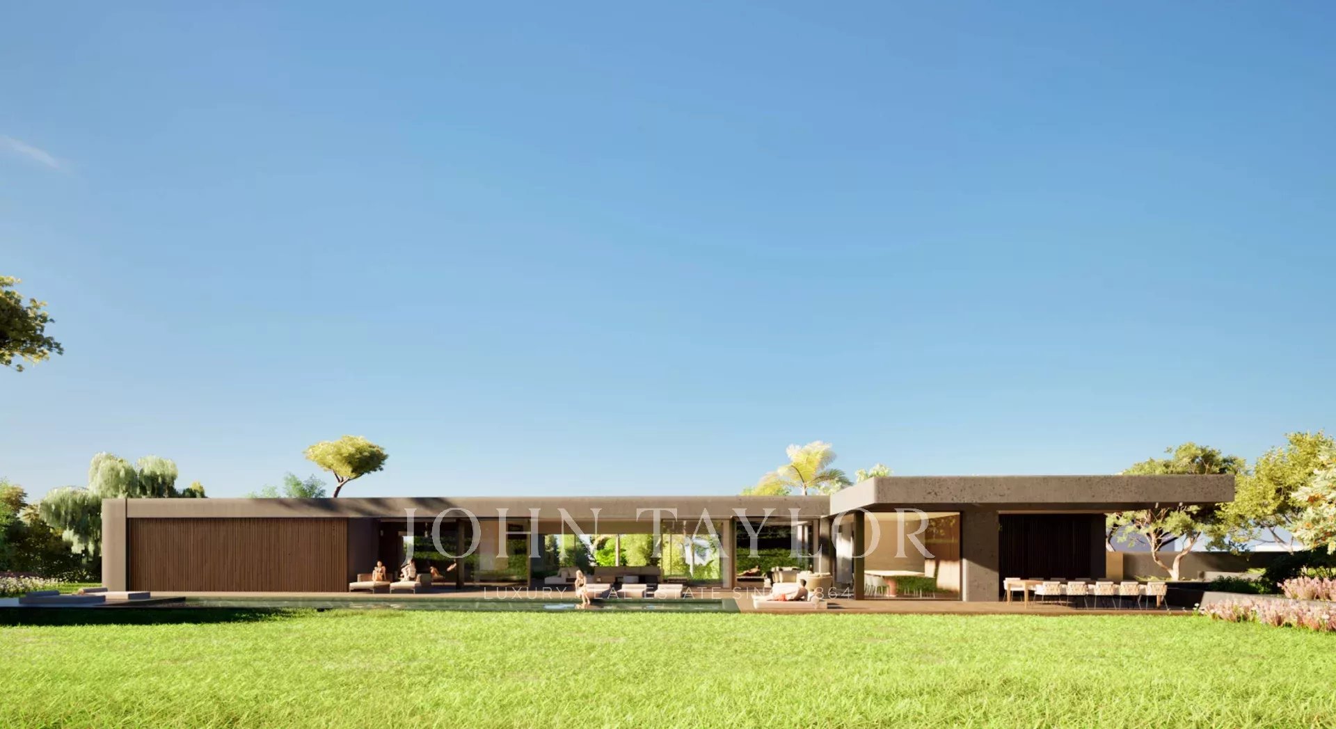 A swimming pool of 14 m X 5m and large terraces overlooking a flat garden facing south.