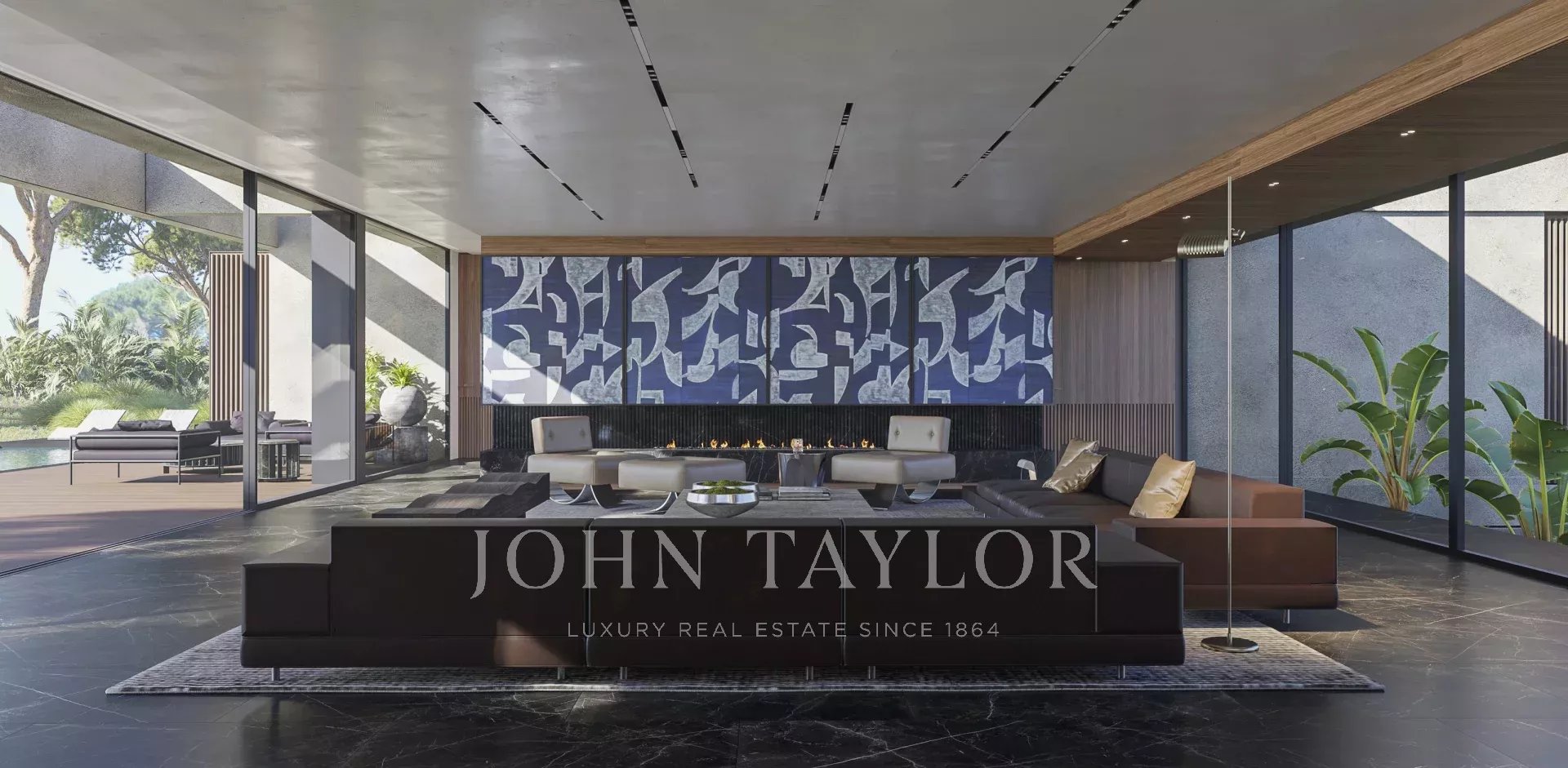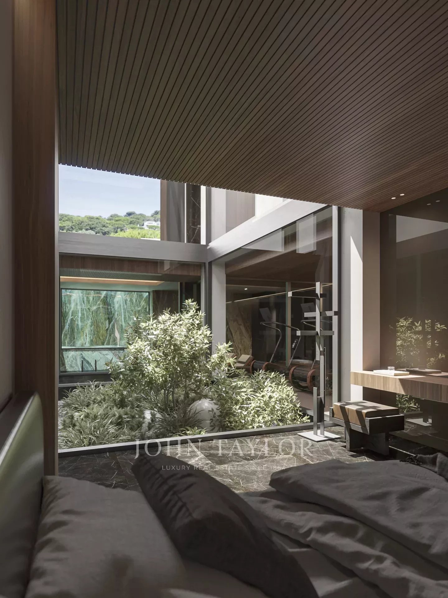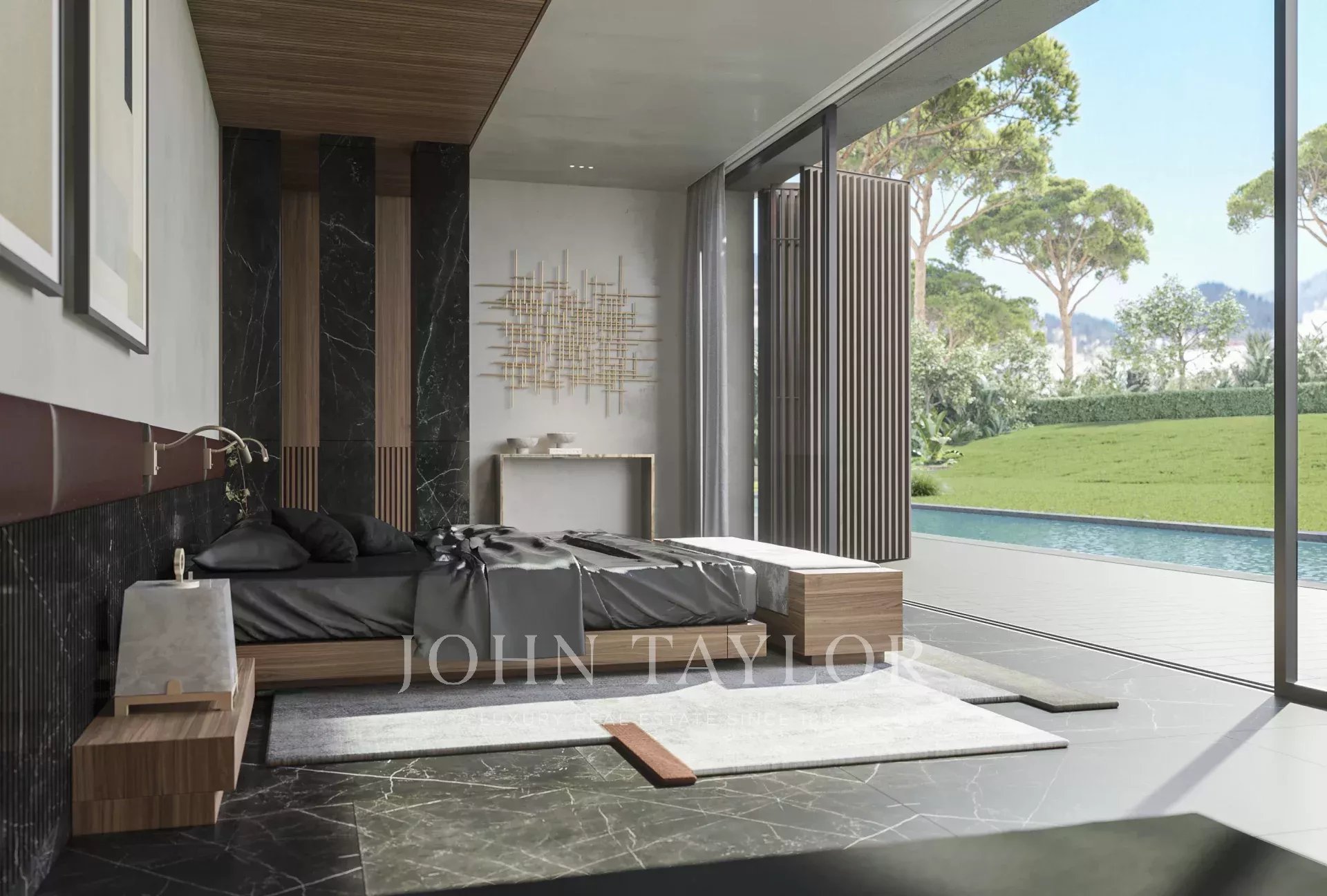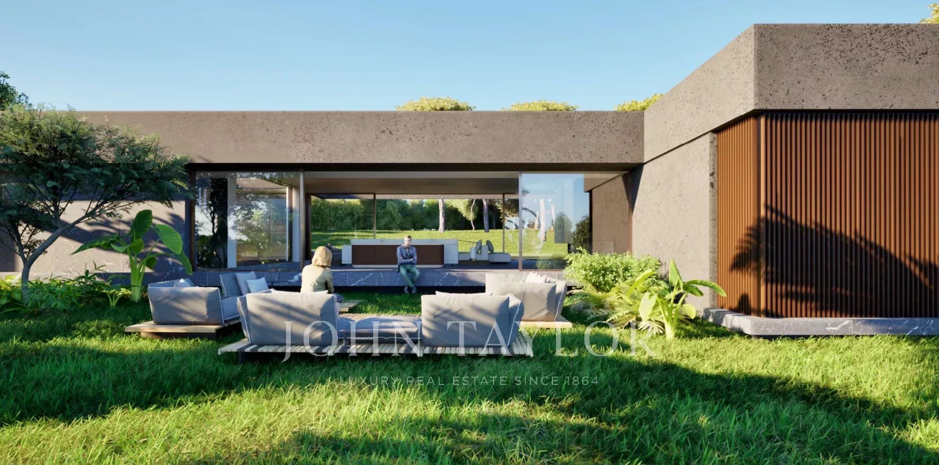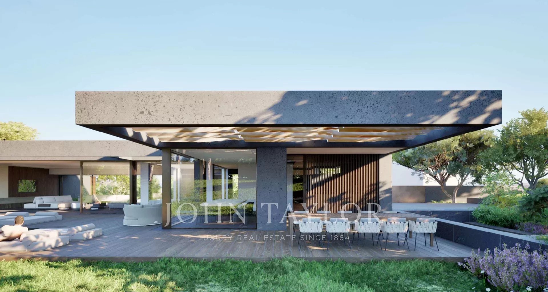 A swimming pool of 14 m X 5m and large terraces overlooking a flat garden facing south.