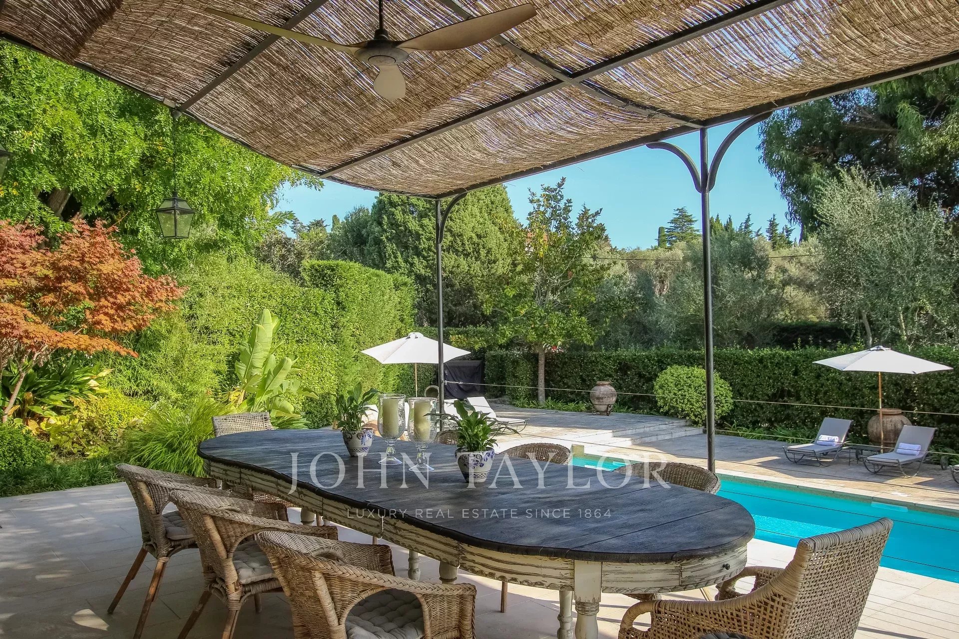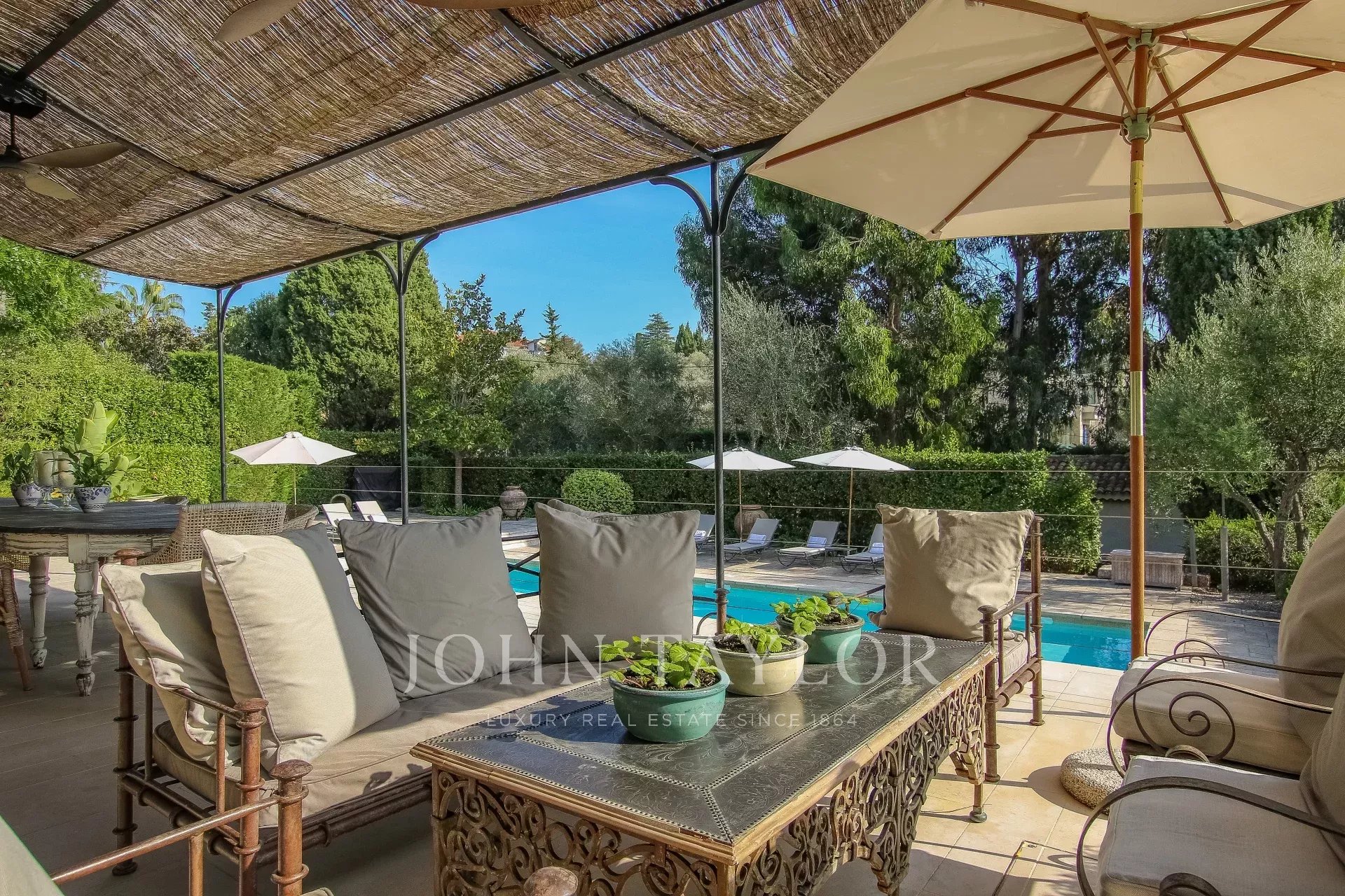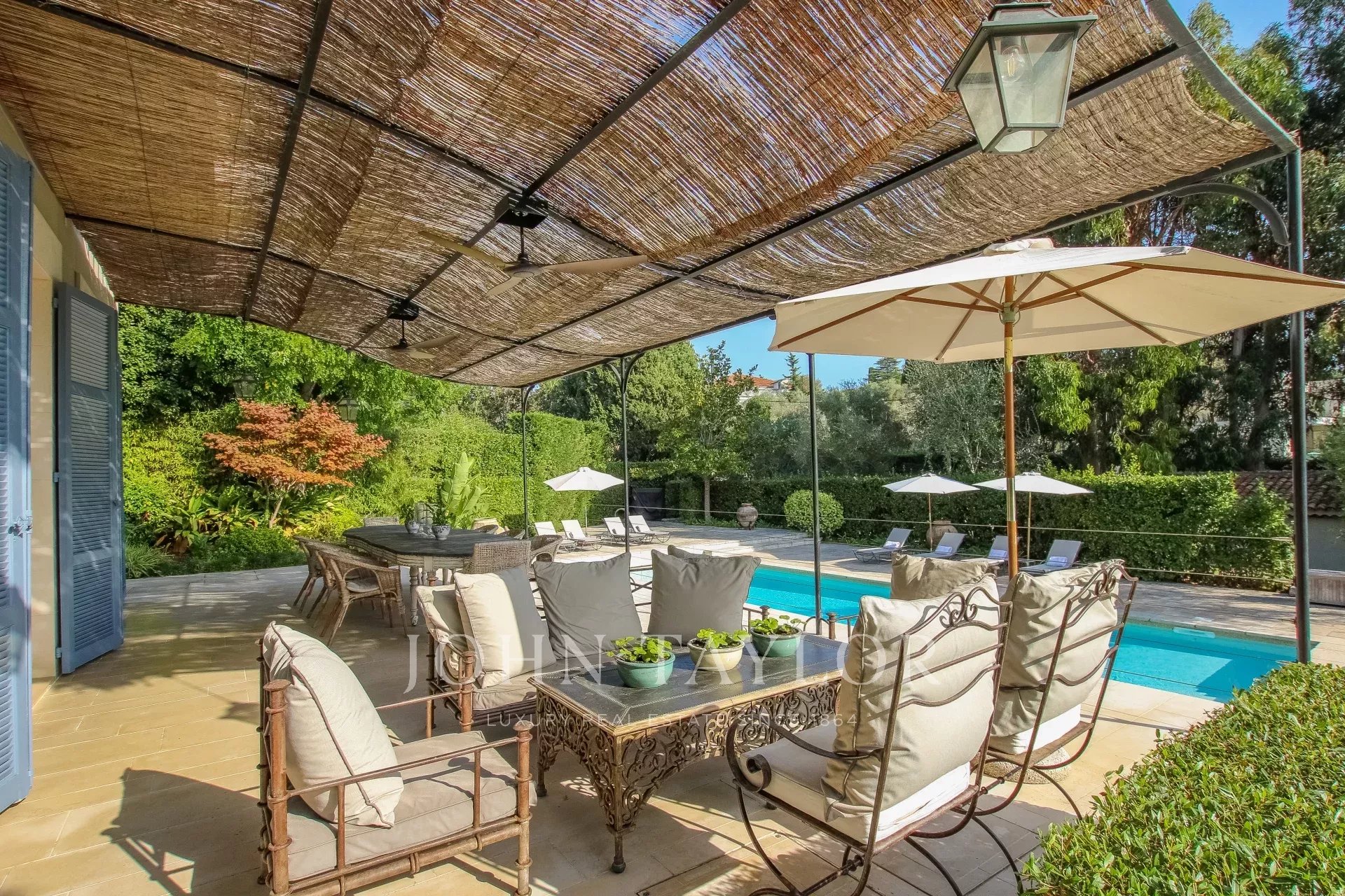 Covered terrace with summer dining area and sofas overlooking the garden and pool
