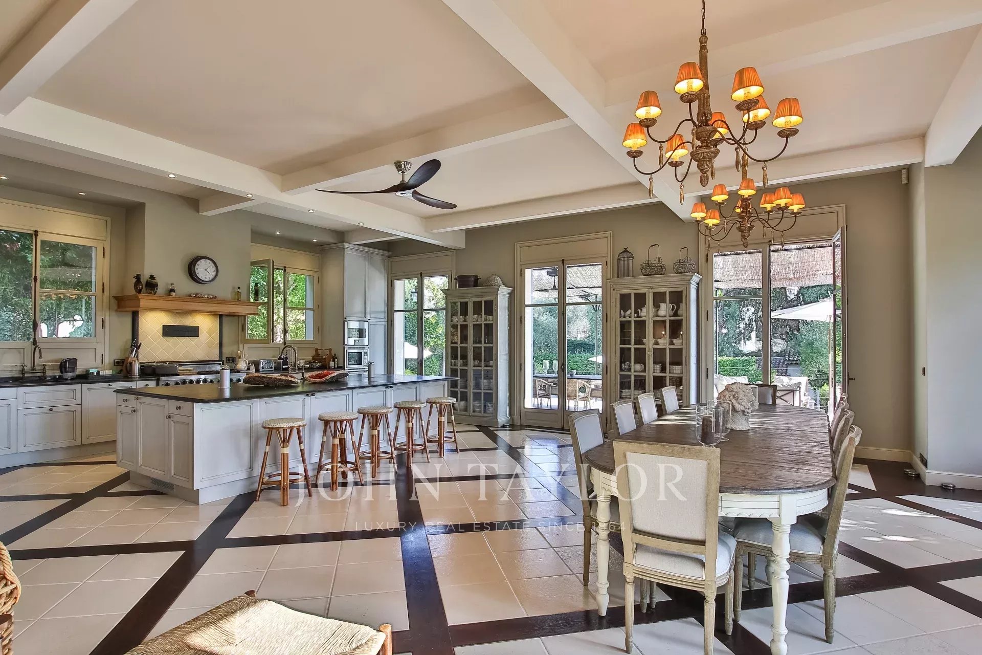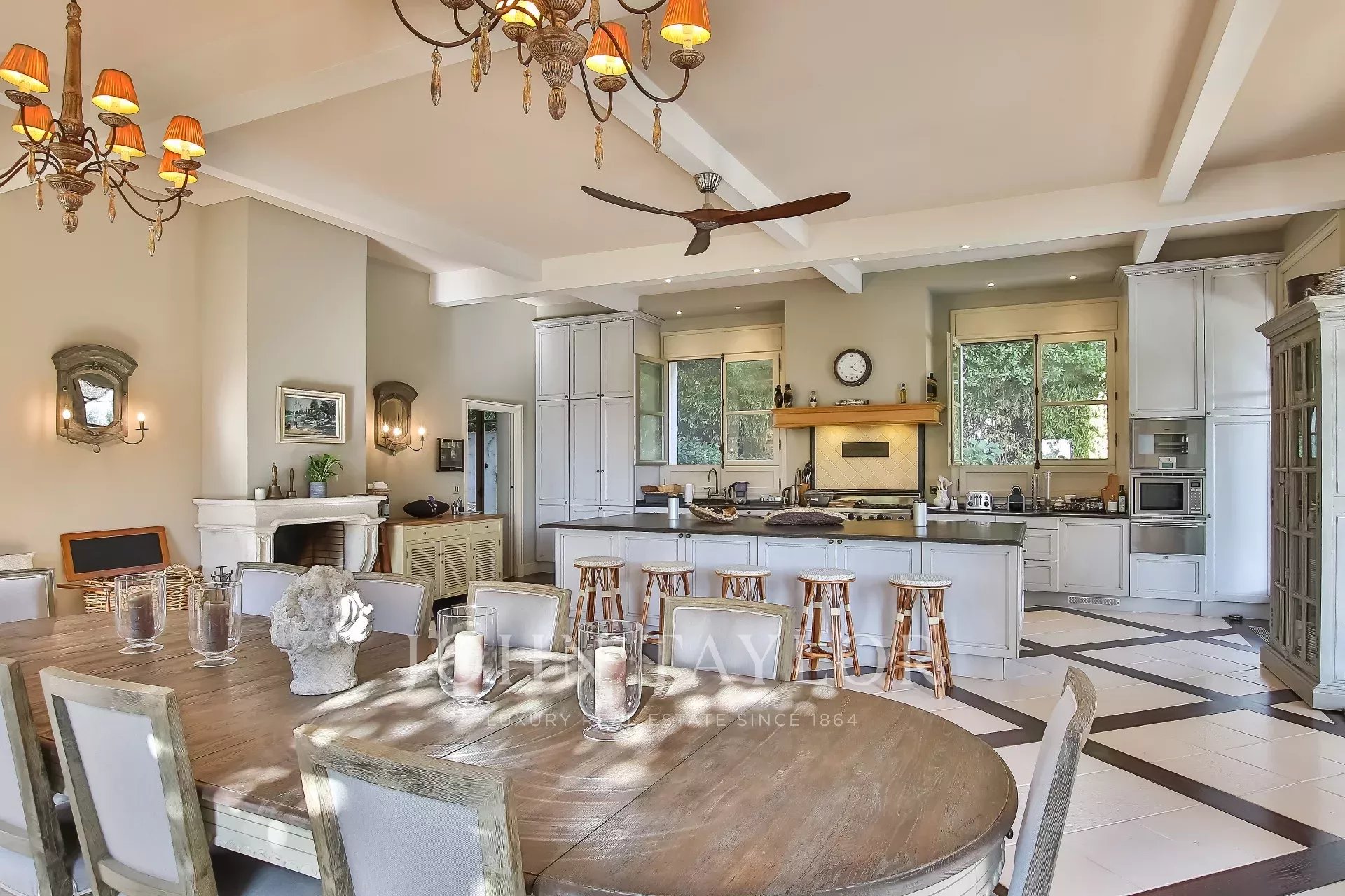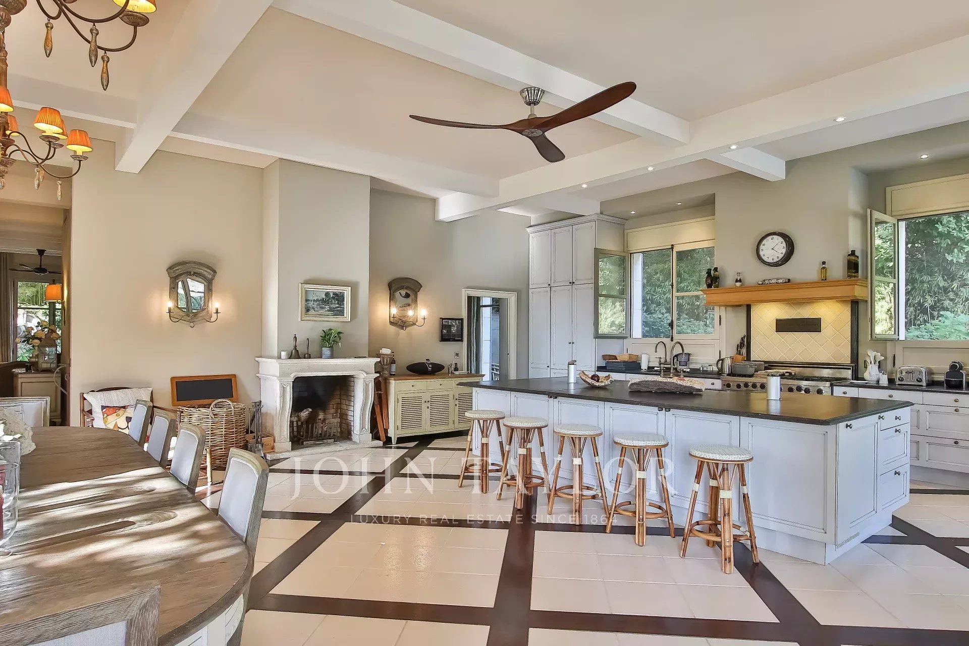 Open kitchen of 80 sqm fully equipped with dining area, fireplace, overlooking the covered terrace and the swimming pool