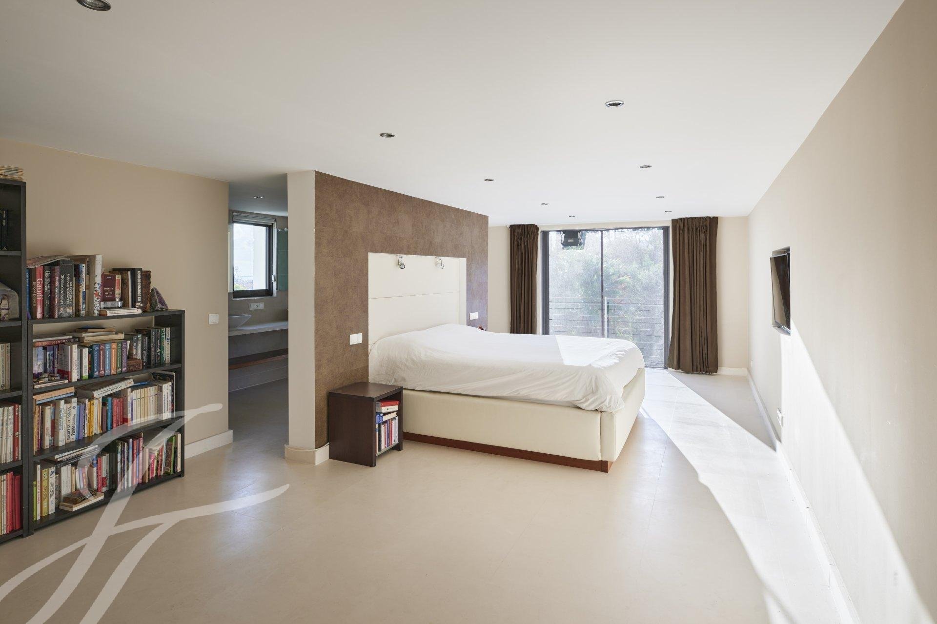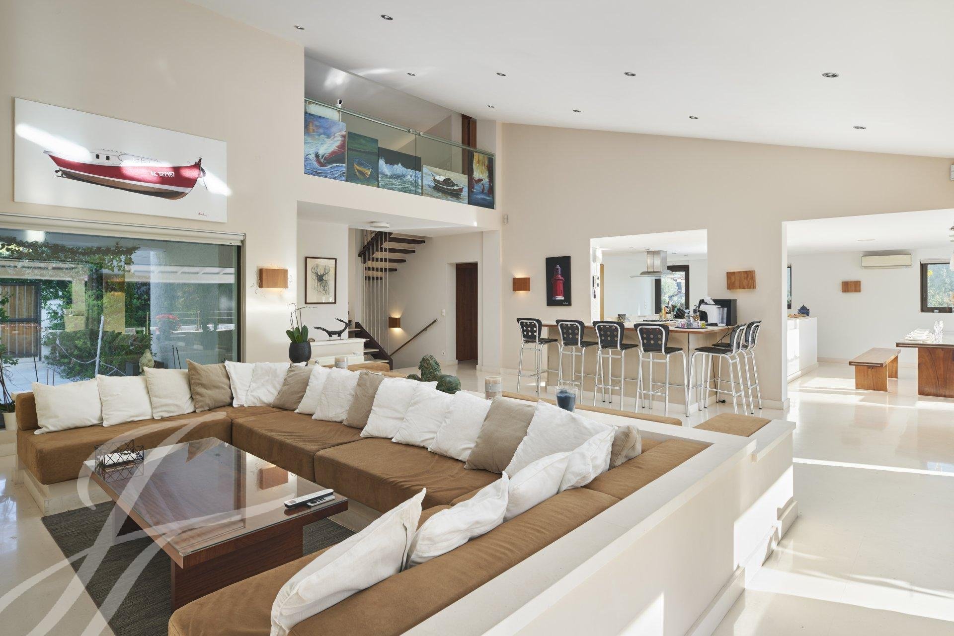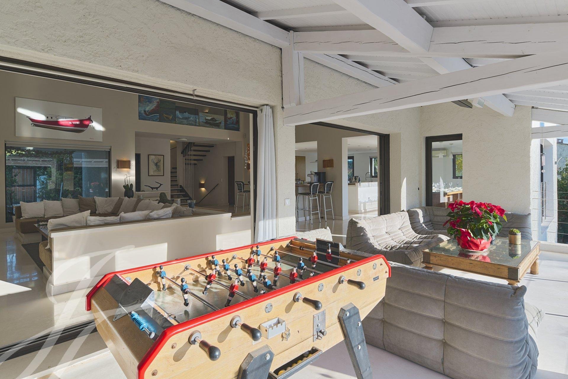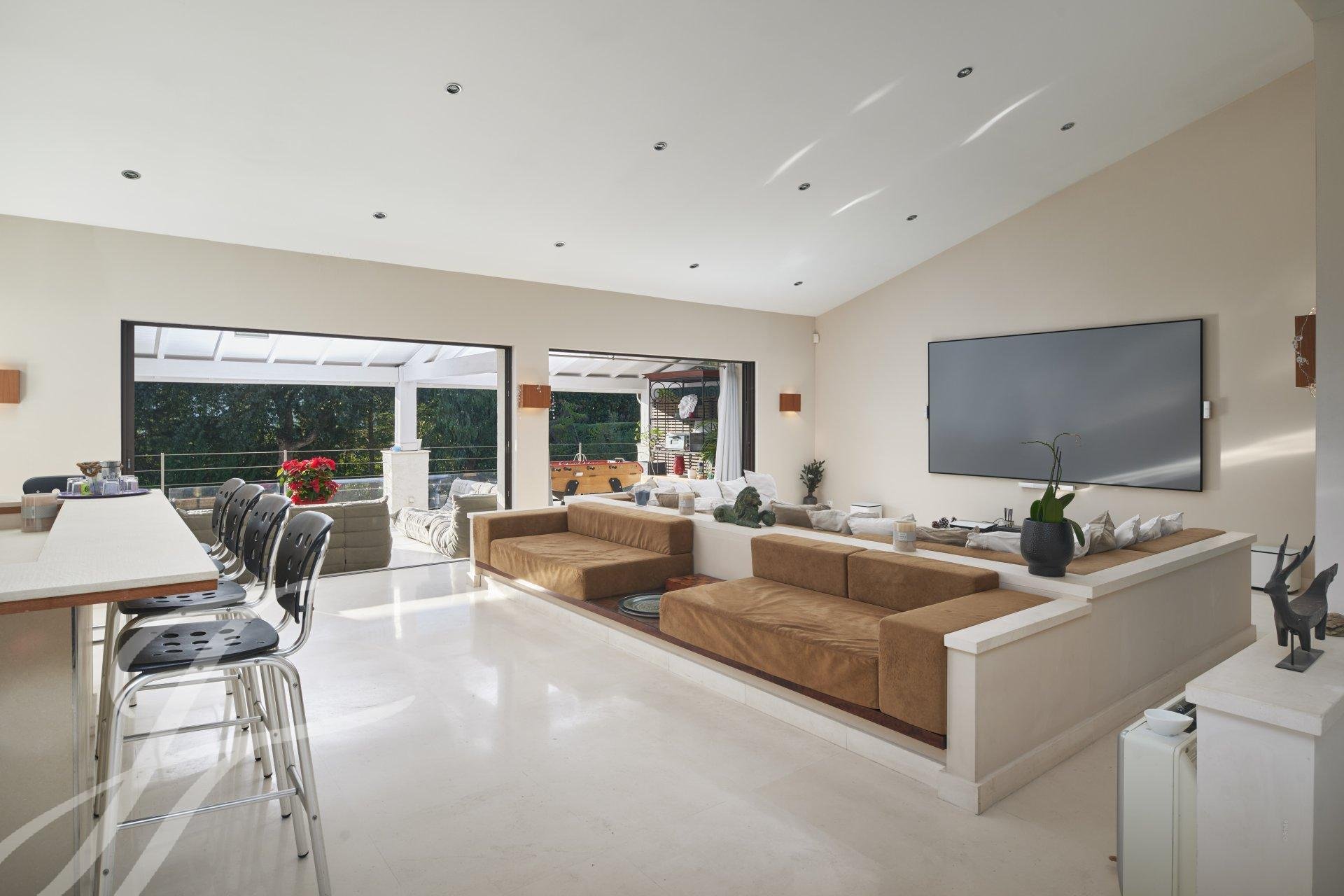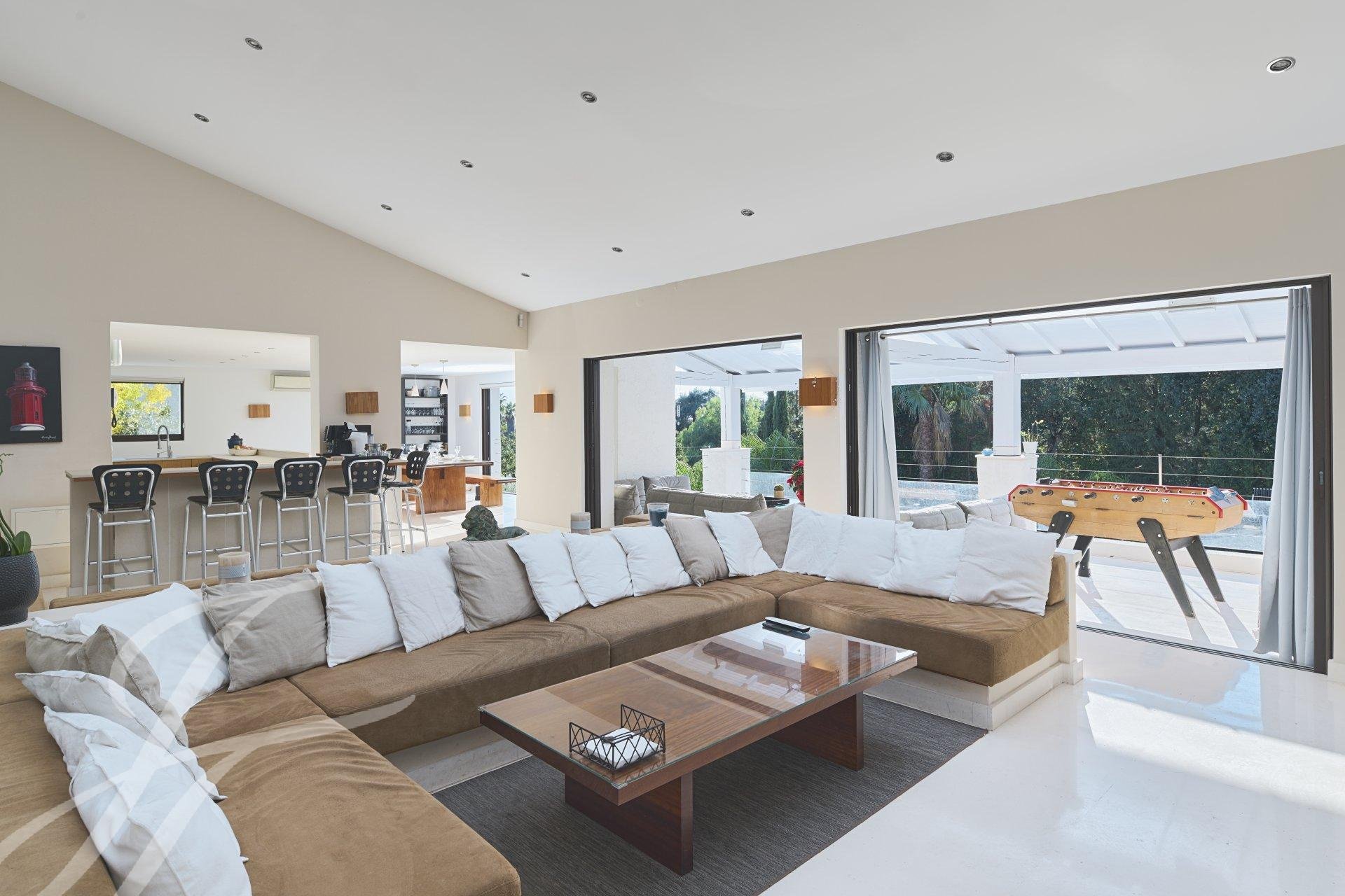 and a living room opening onto a large outdoor terrace overlooking the swimming pool. At this