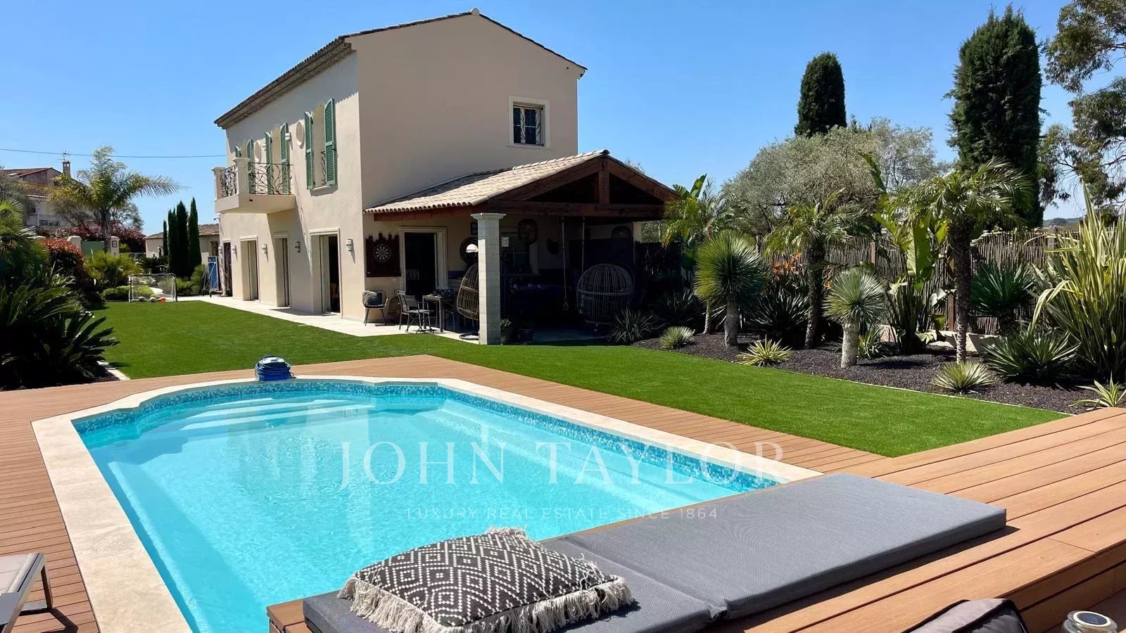 At the end of a cul-de-sac, sheltered from view, we offer you a charming Provencal villa on a flat plot of land with sea and mountain views, located in the residential area of "Les Rastines".