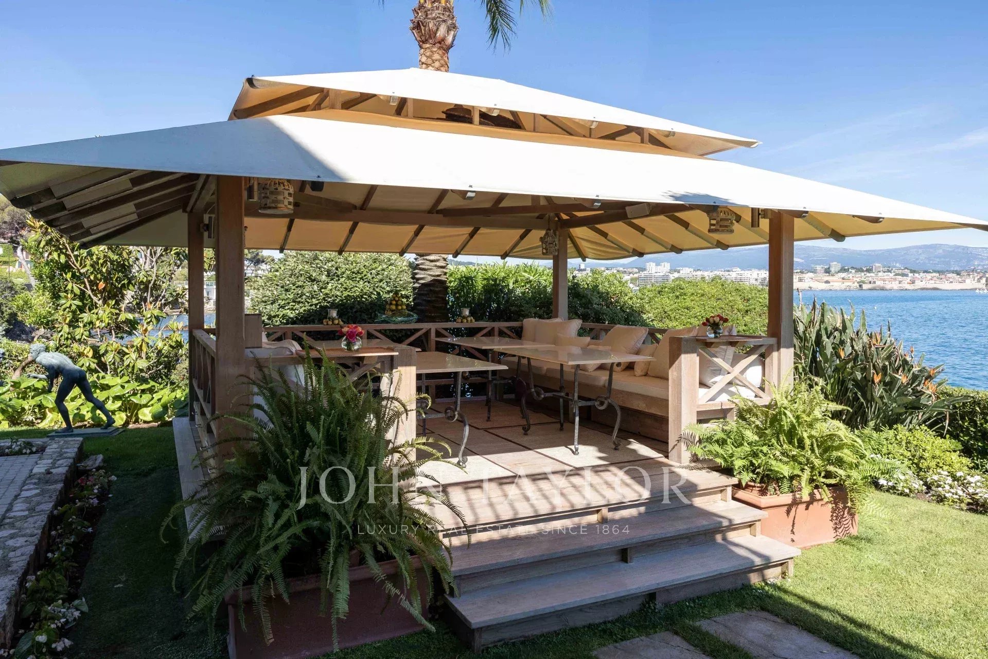 It offers breathtaking sea views from Antibes to Italy, with the snow-capped Alps in the background.