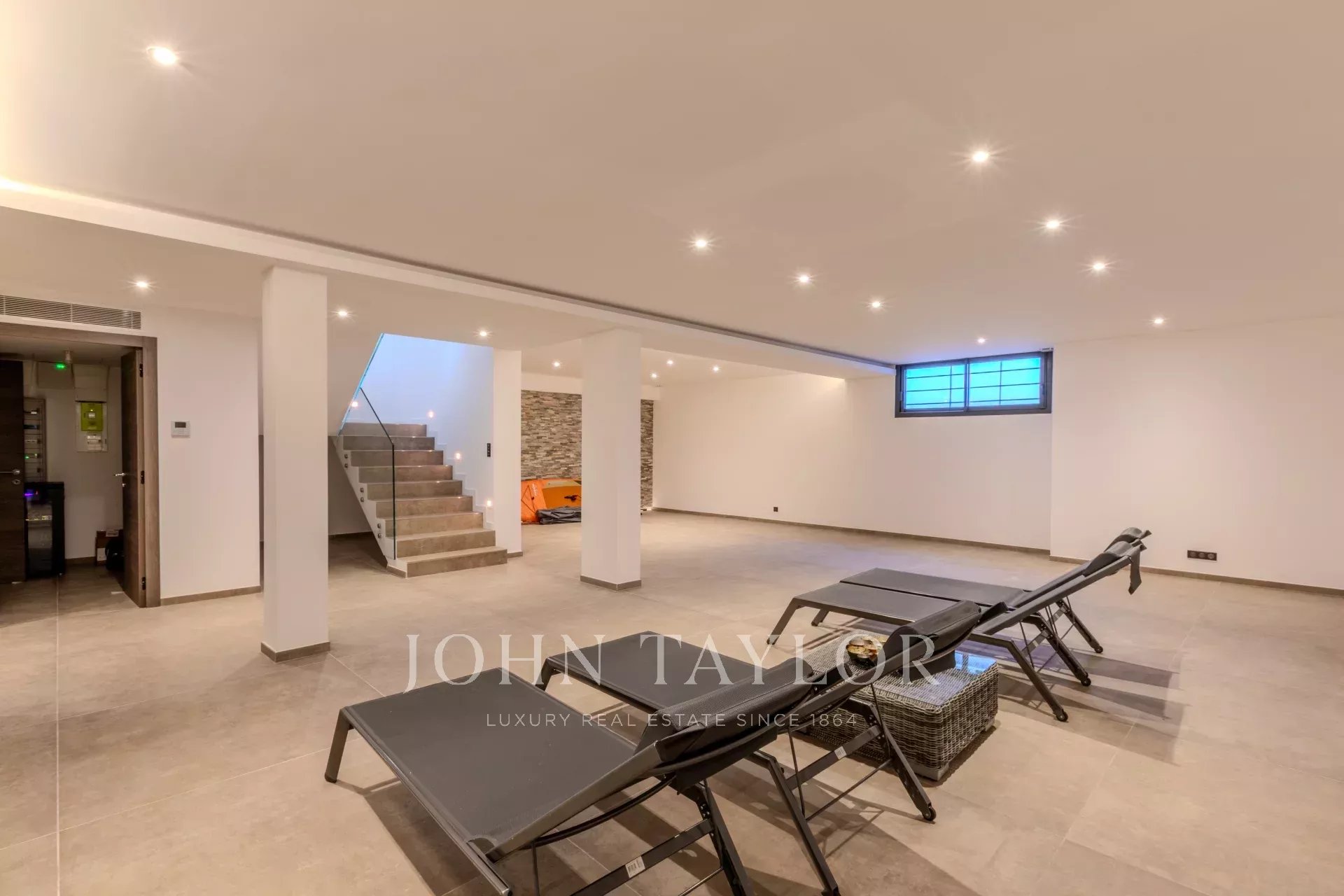 A large room that can be used as a spa or cinema, technical rooms and a shower room.
