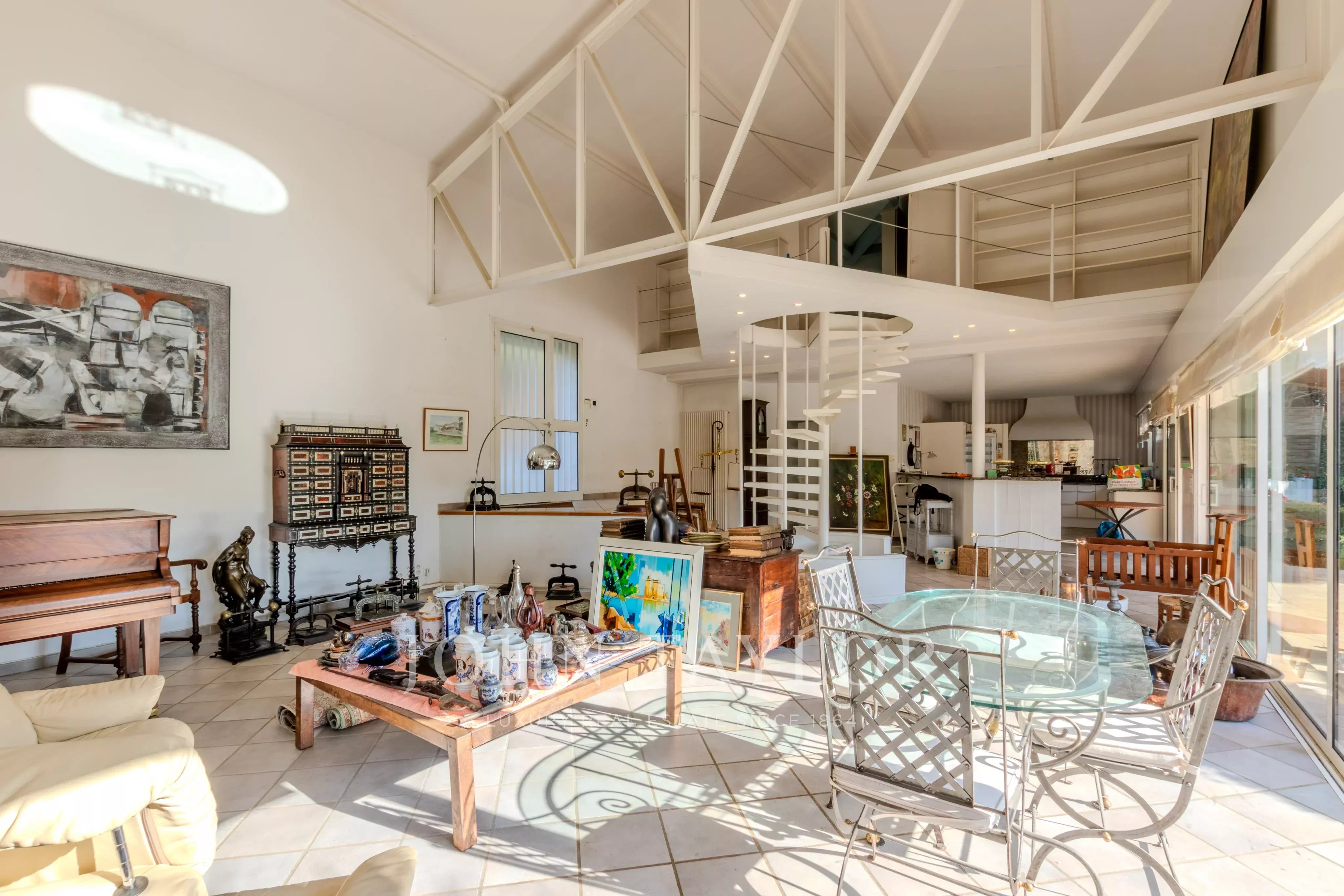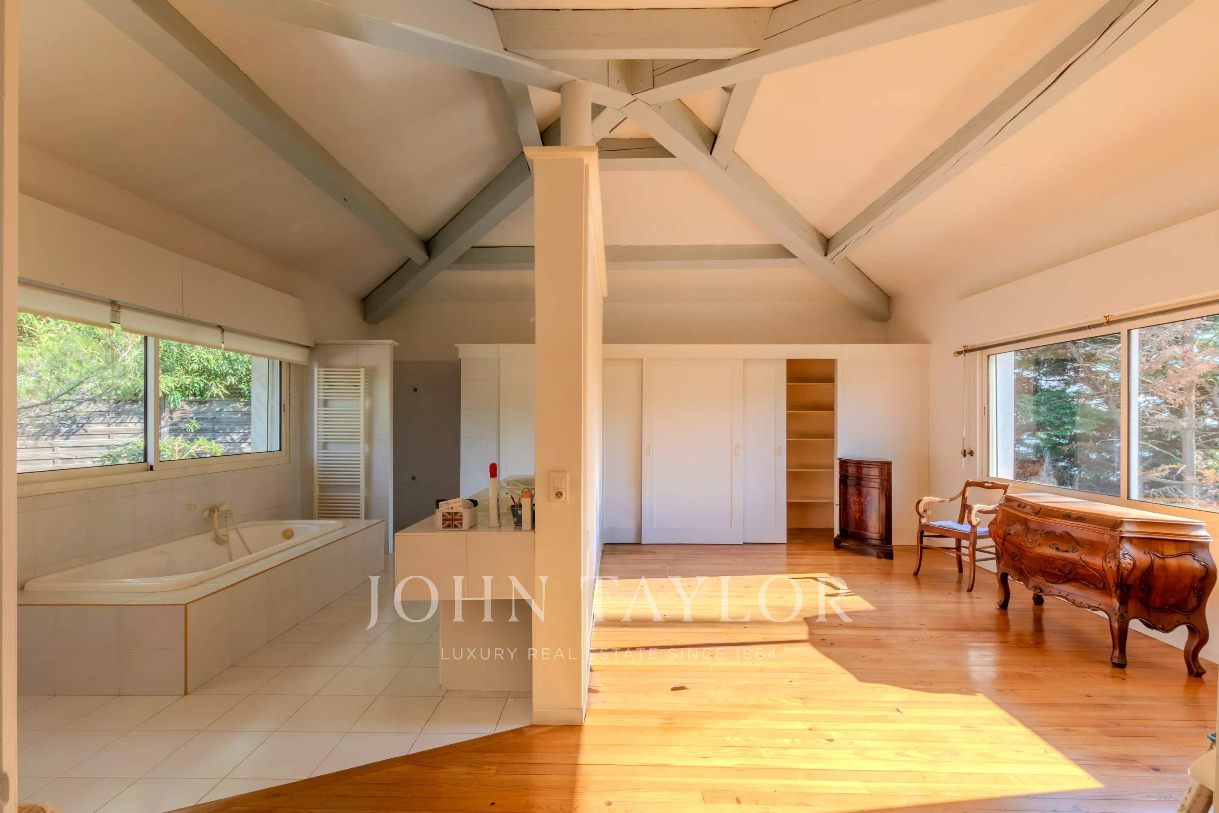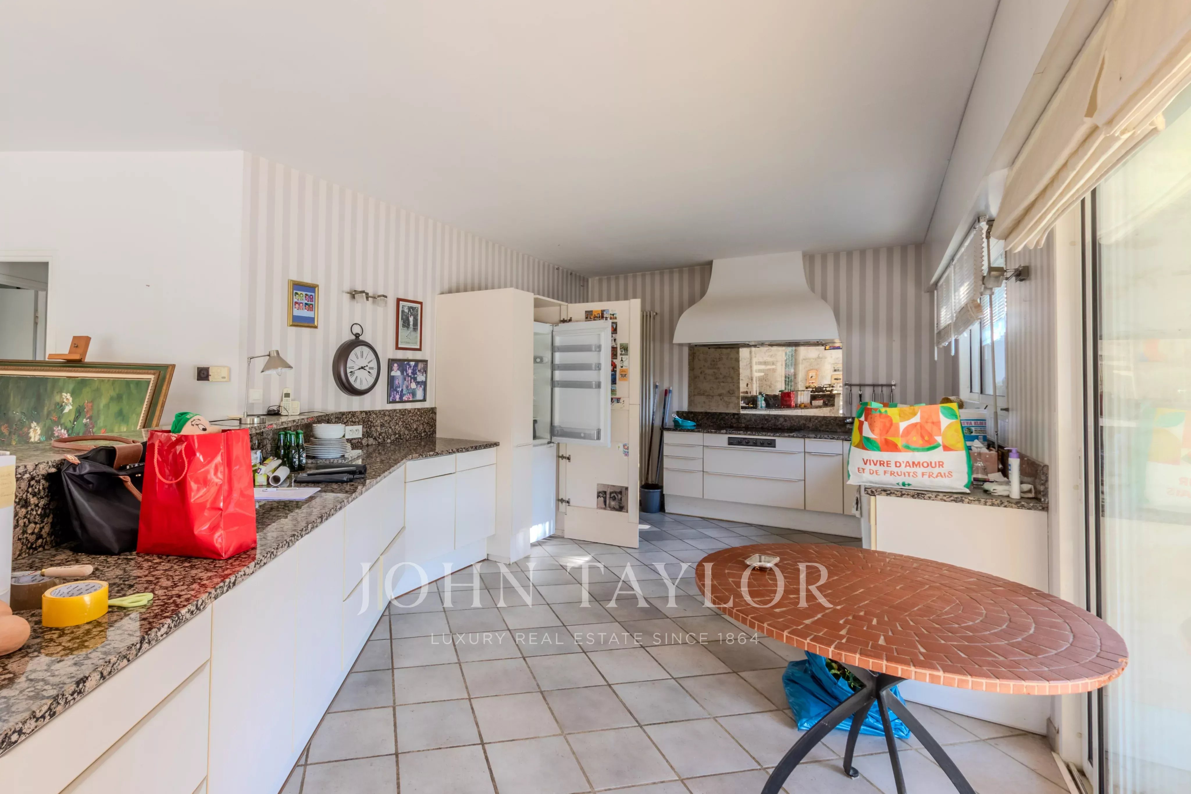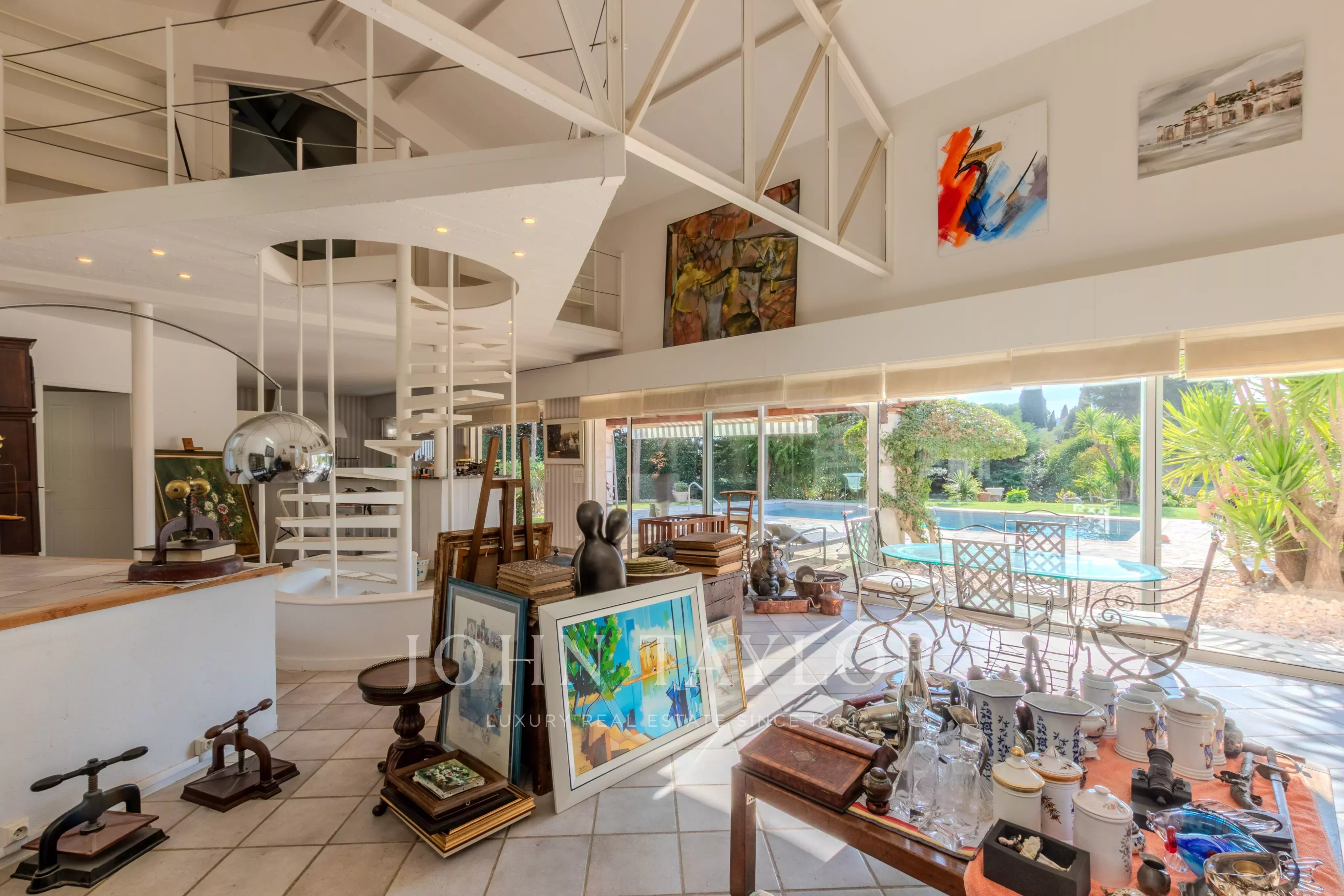 Nestled in a lush and peaceful setting in Antibes, this villa is charming for its generous volumes and light-filled living spaces. The large living room opens generously onto a functional open-plan kitchen totaling 83m², complemented by a laundry room with a gas boiler. Large bay windows offer breathtaking views of the pool and garden, inviting you to enjoy the Mediterranean climate all year round.