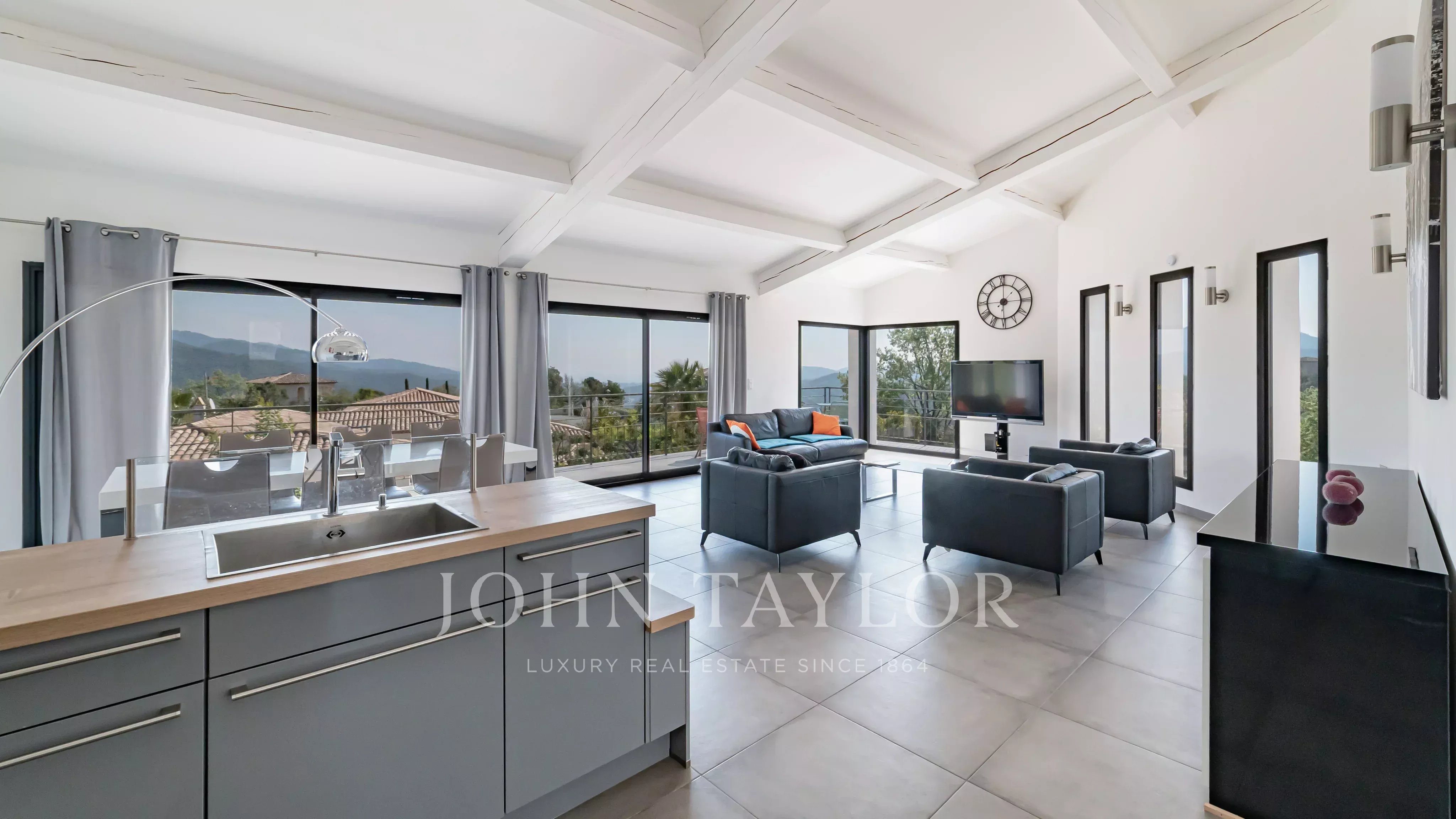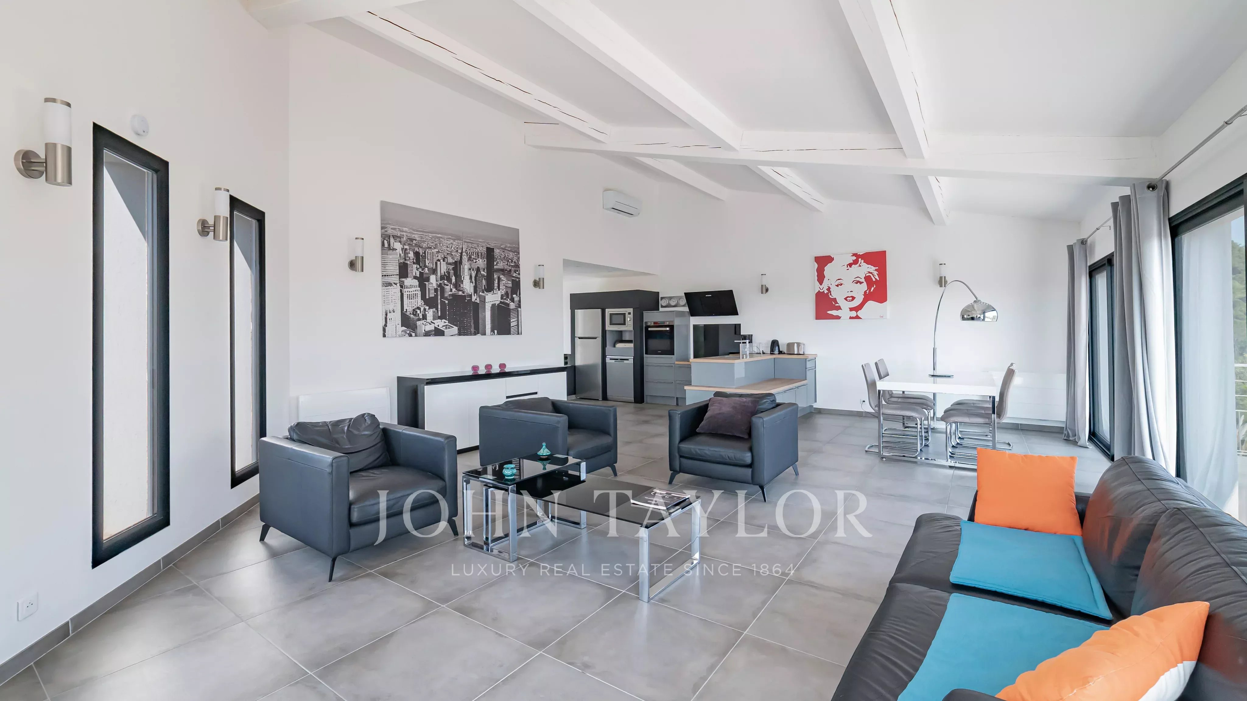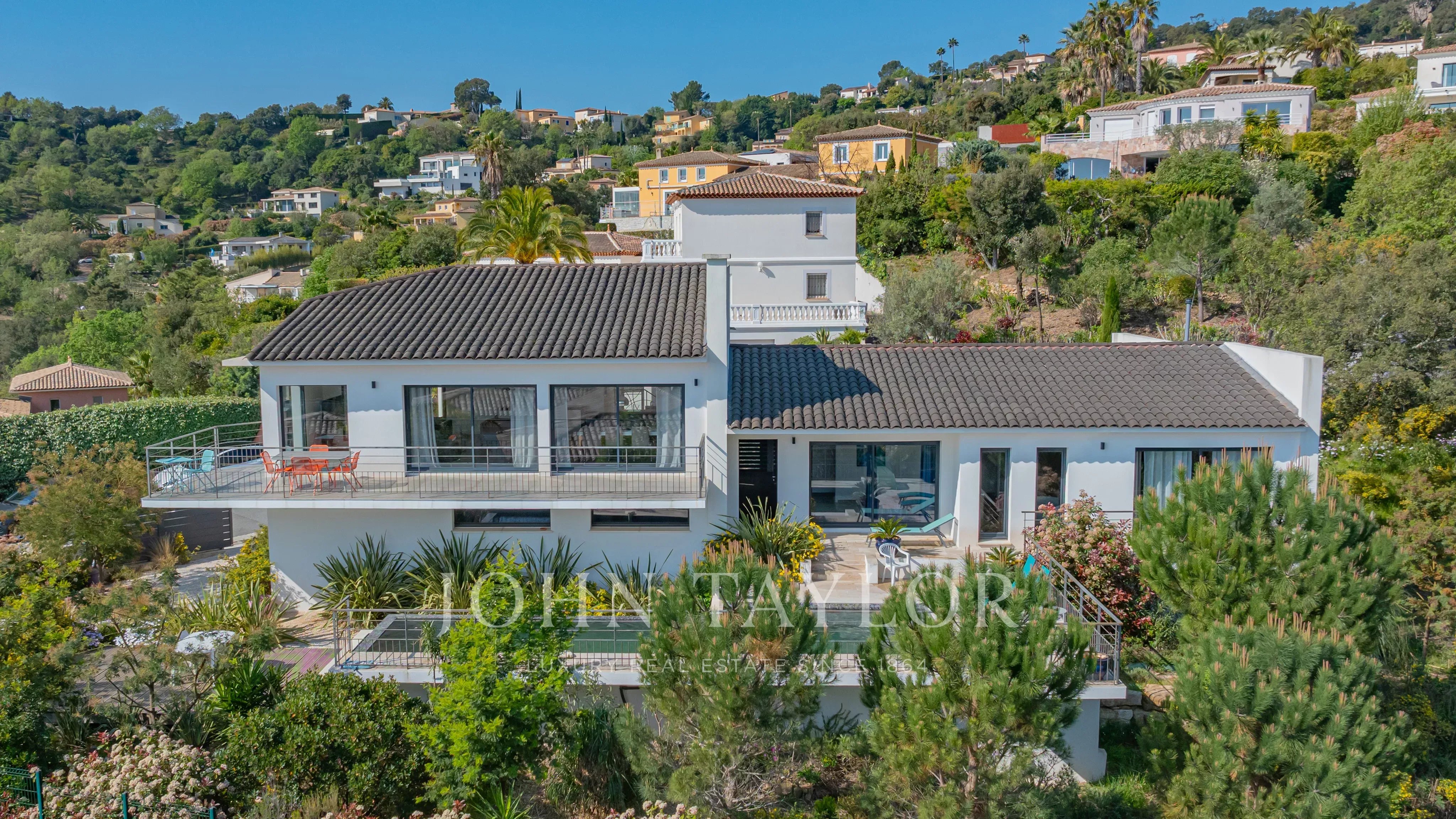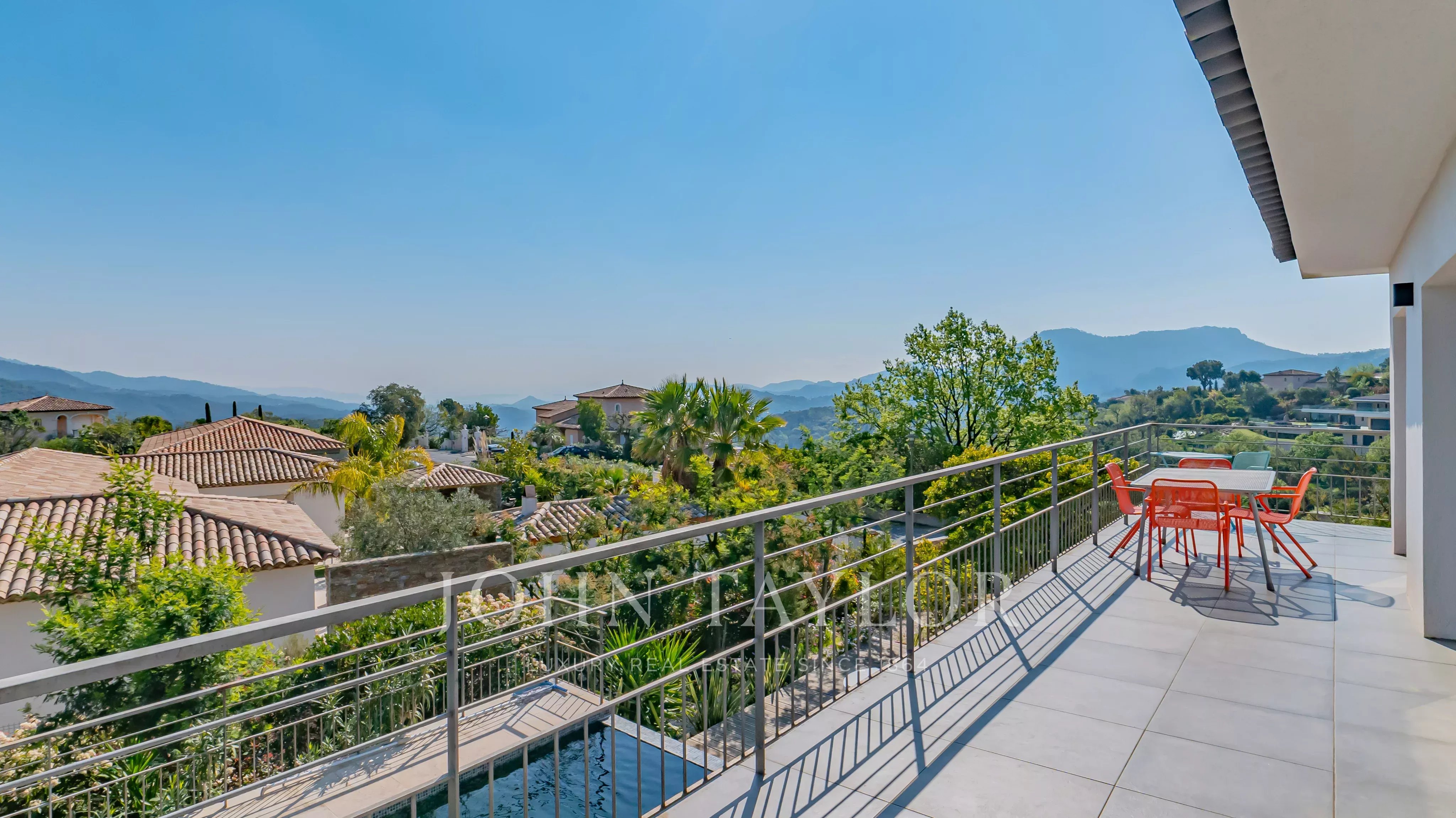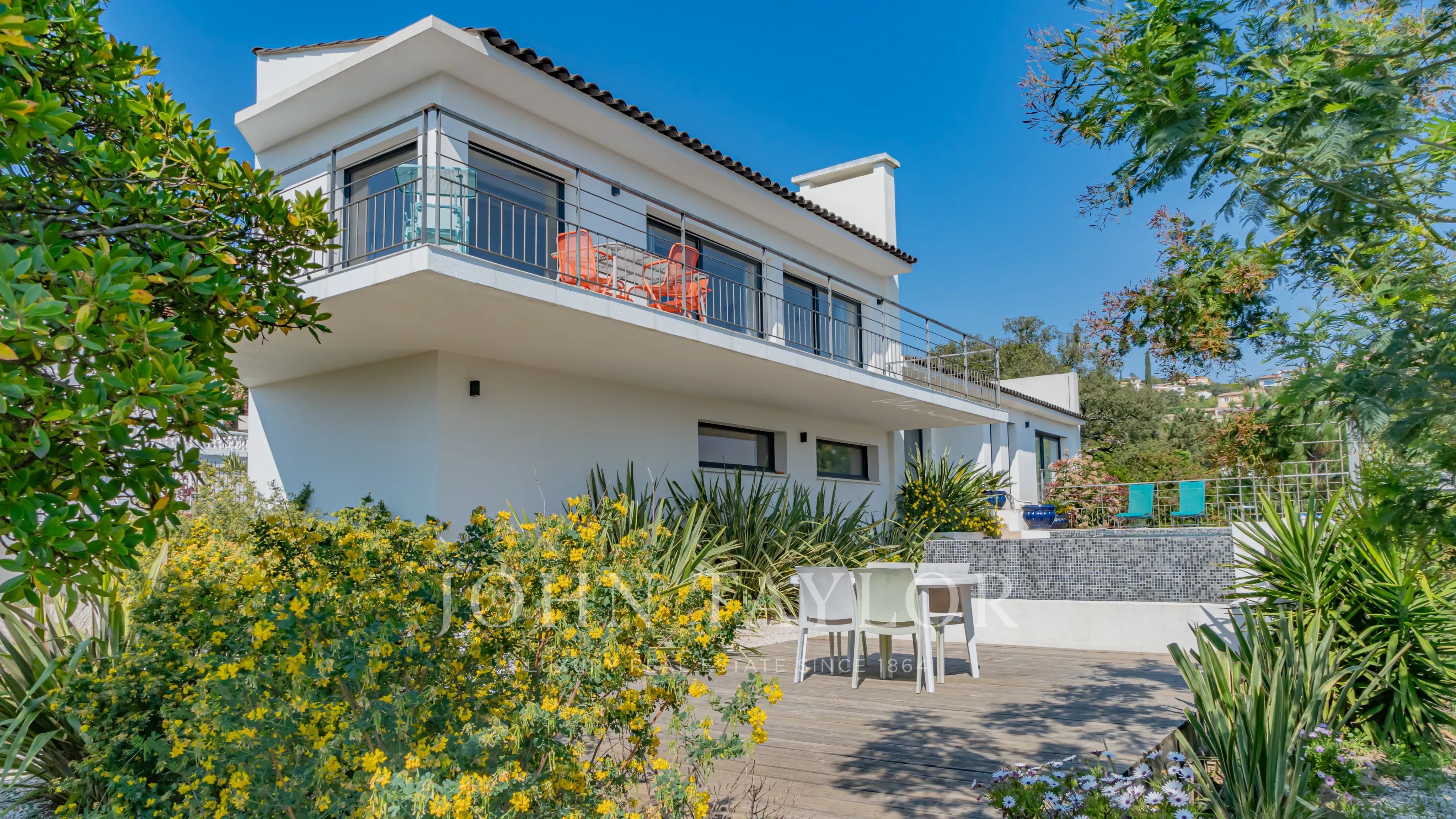 Located within a secure estate in Les Adrets-de-l’Estérel, this contemporary villa of approximately 197 sqm of living space features a bright living room opening onto a large south-east facing terrace, an open-plan kitchen, four bedrooms, one bathroom, one shower room, a study, a laundery room and two toilets, all enjoying a magnificent sea view.
