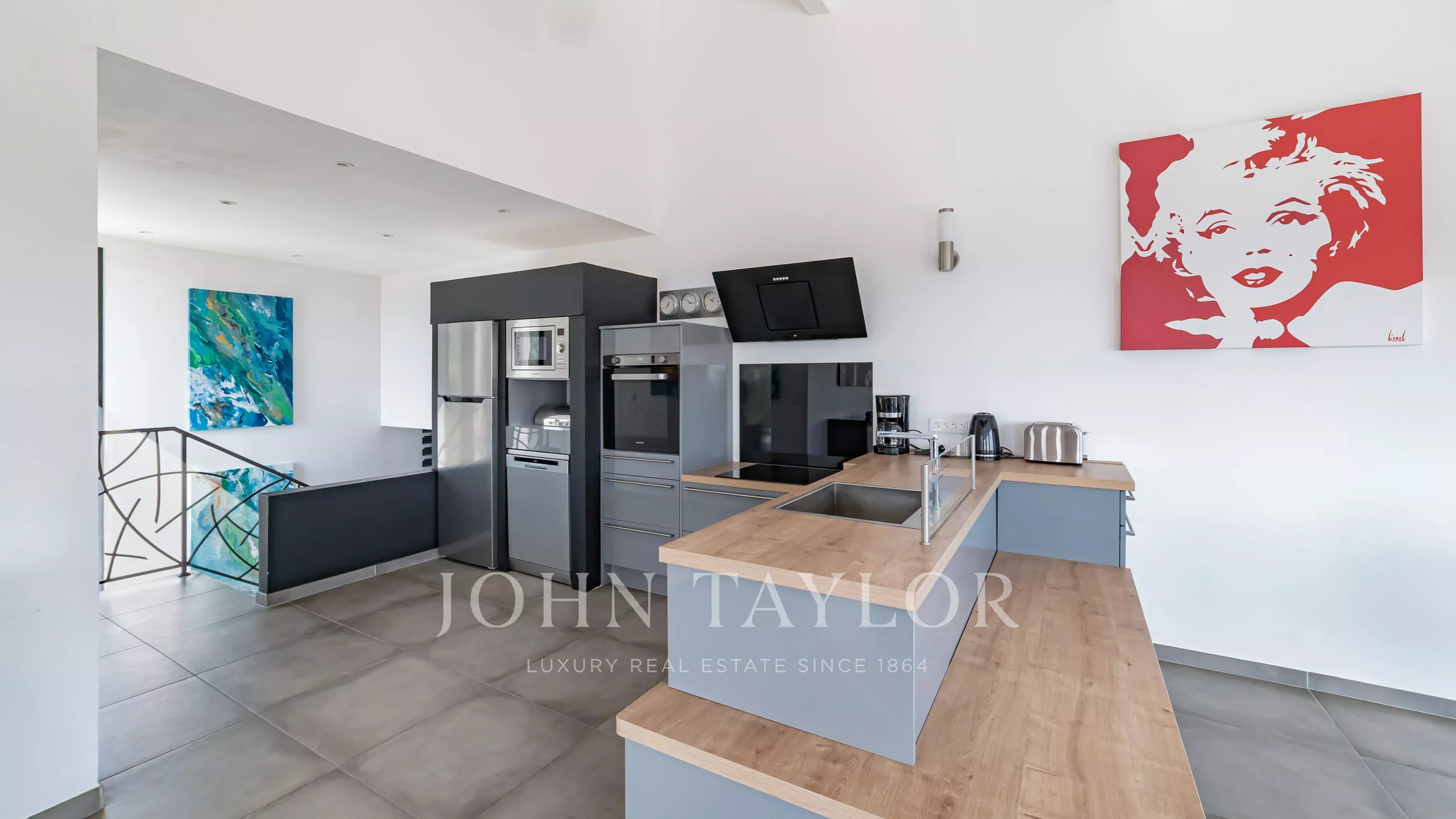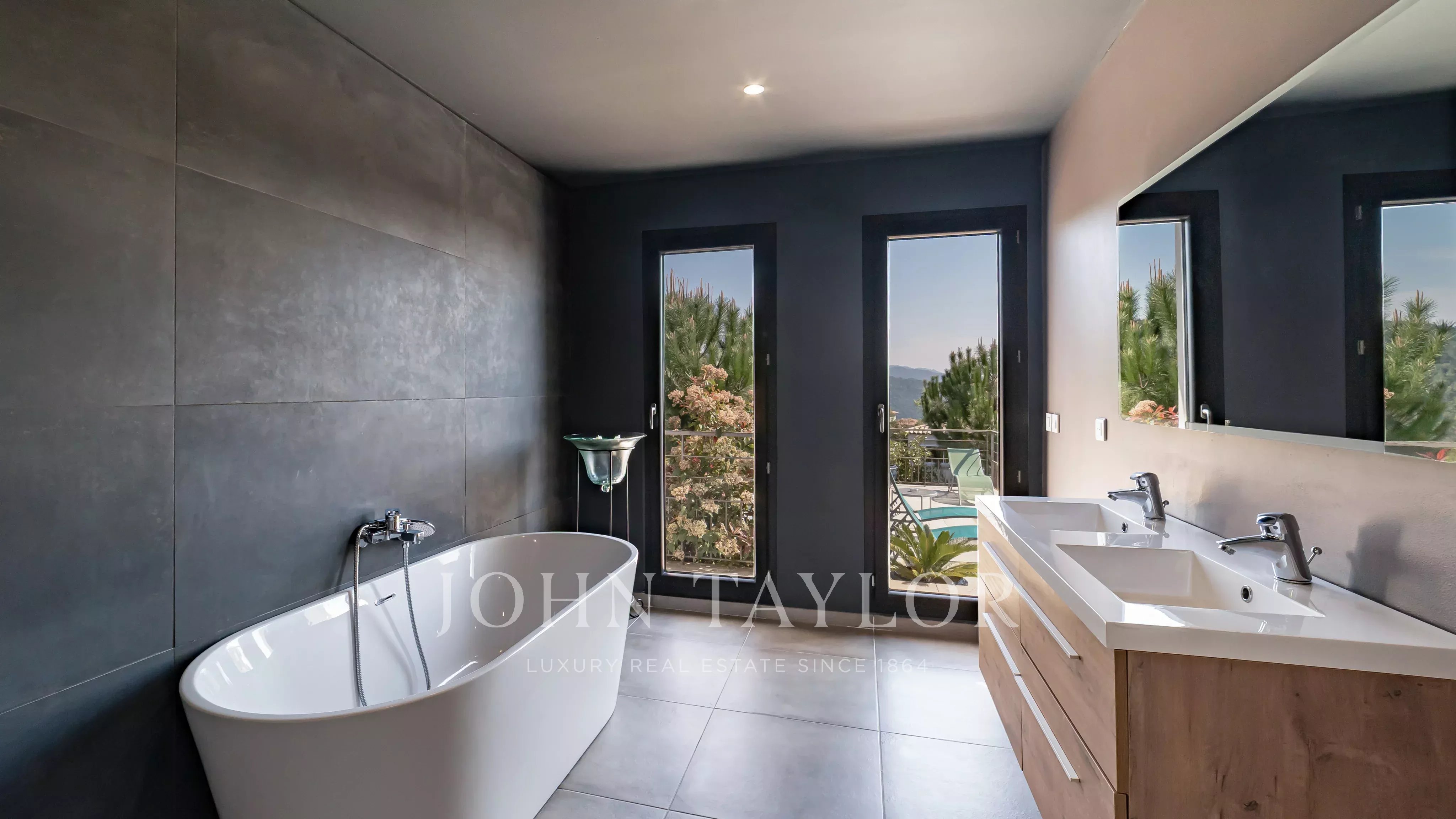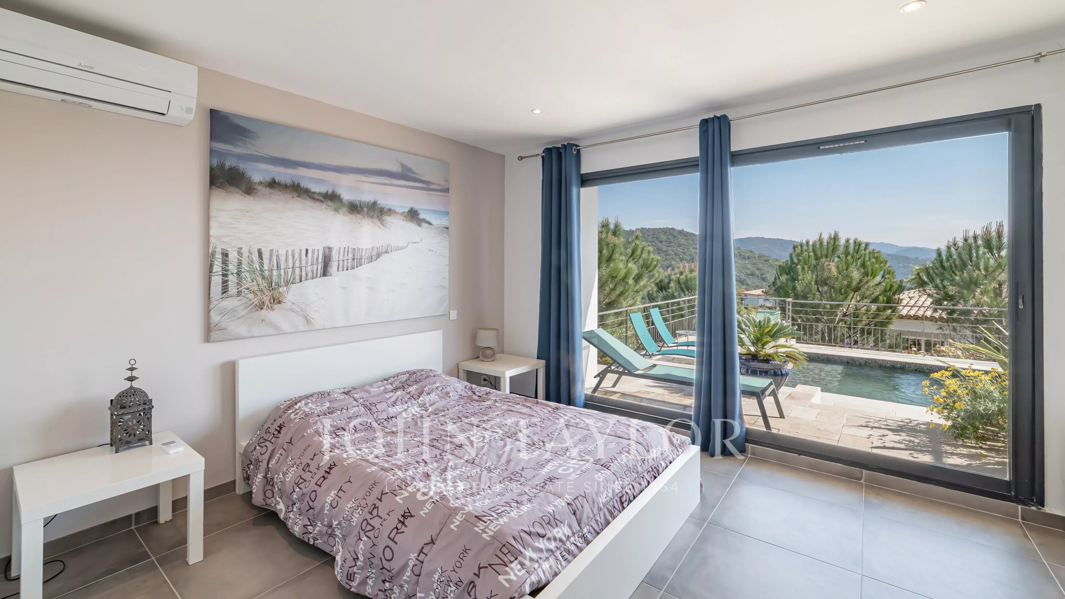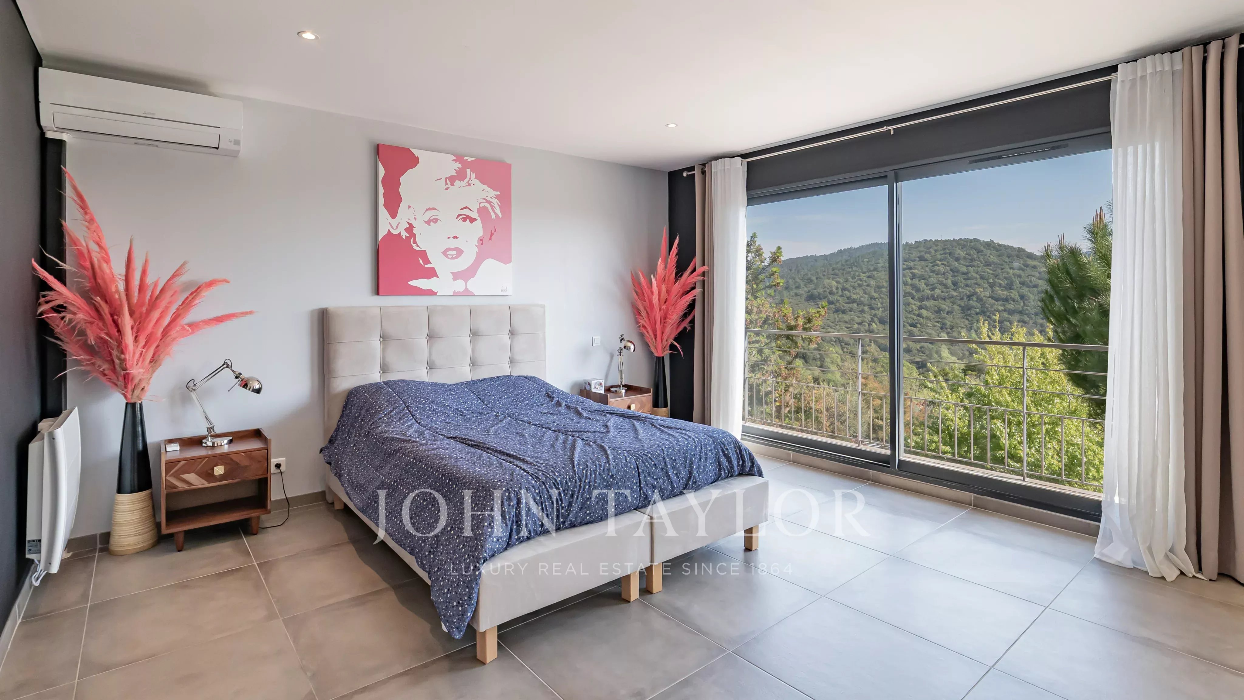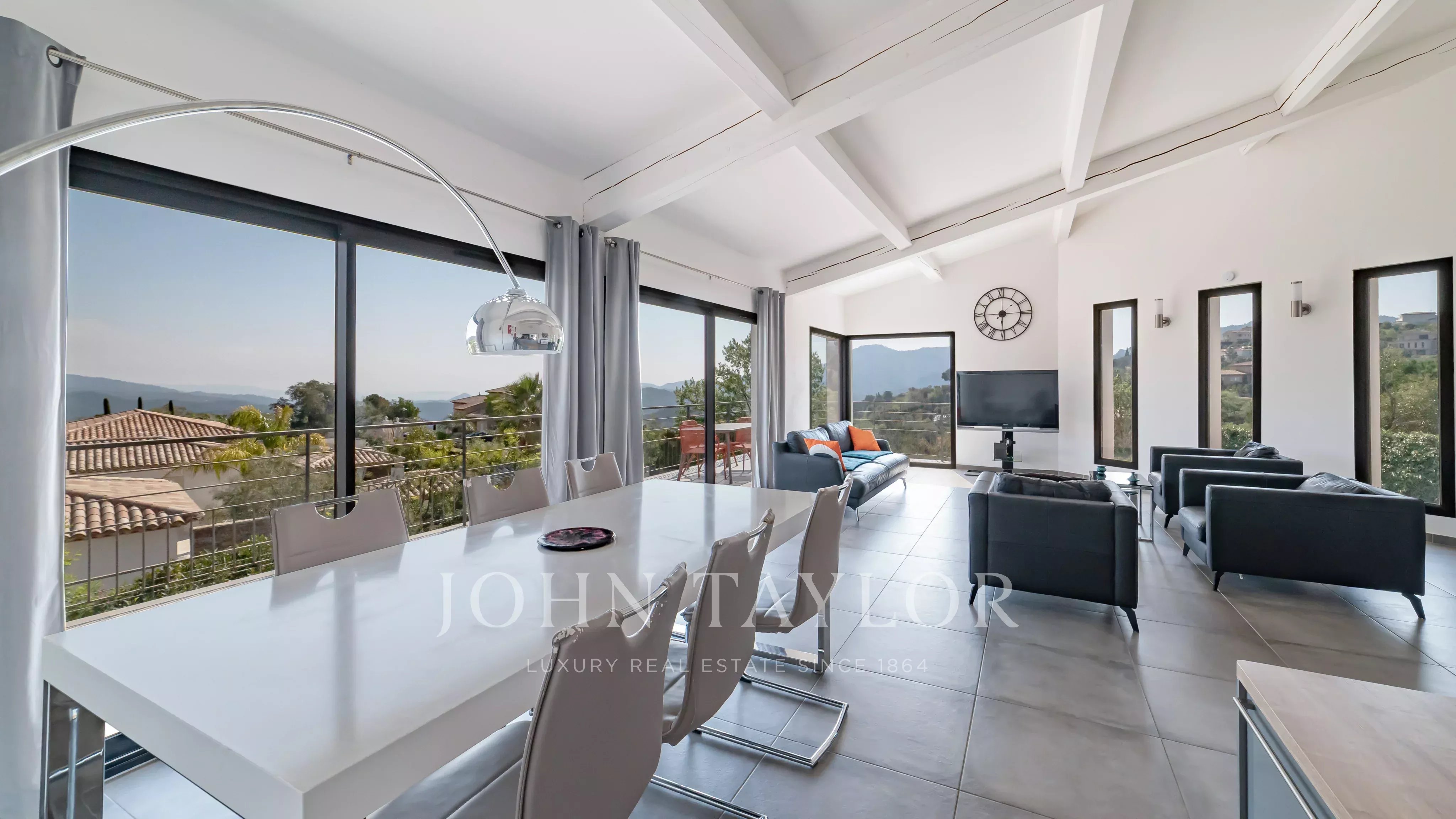 Located within a secure estate in Les Adrets-de-l’Estérel, this contemporary villa of approximately 197 sqm of living space features a bright living room opening onto a large south-east facing terrace, an open-plan kitchen, four bedrooms, one bathroom, one shower room, a study, a laundery room and two toilets, all enjoying a magnificent sea view.