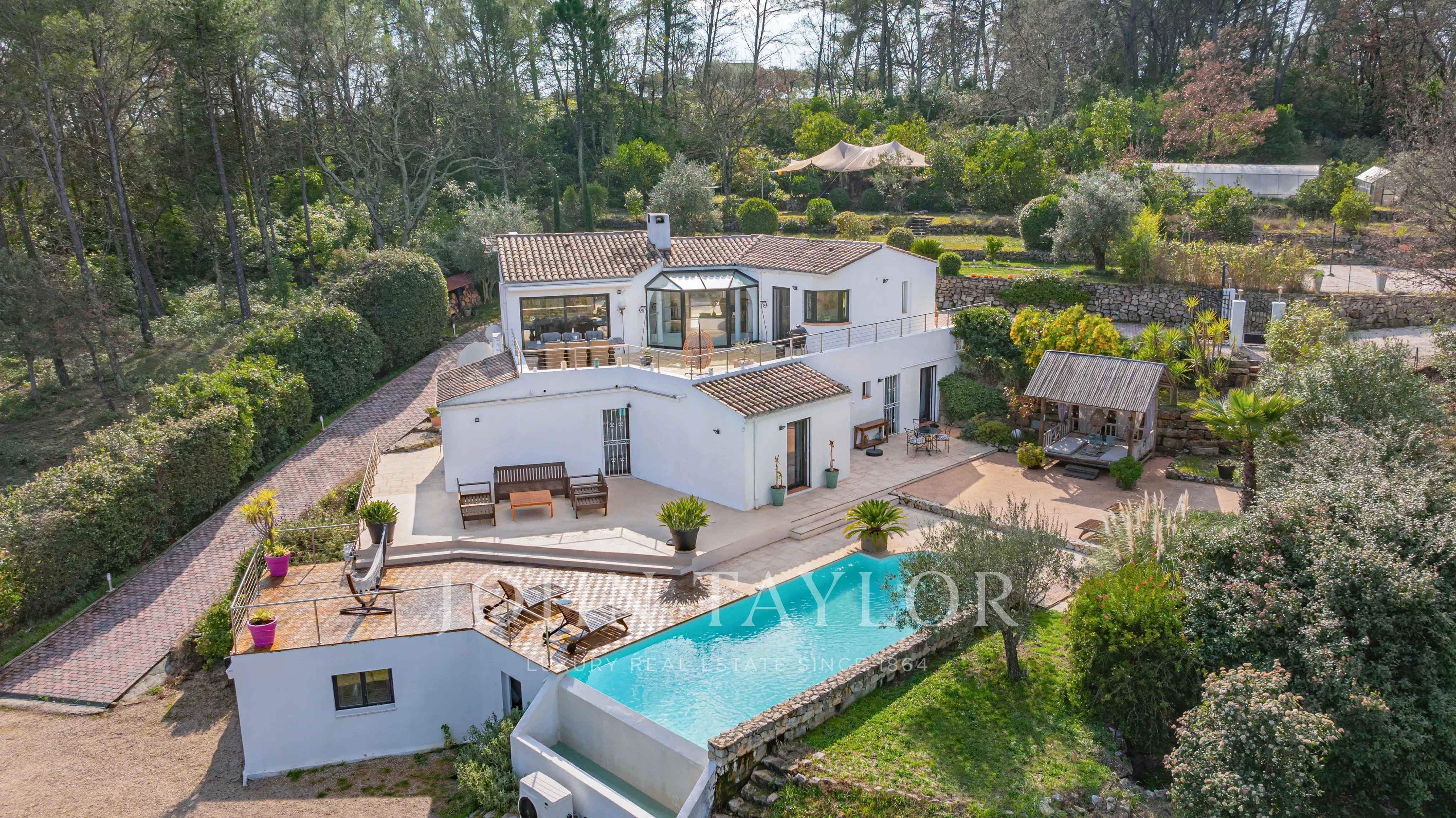 Set in 7,200 m² of beautifully landscaped grounds, the property boasts numerous sunny terraces and a superb infinity pool, inviting you to relax and enjoy the panoramic views.