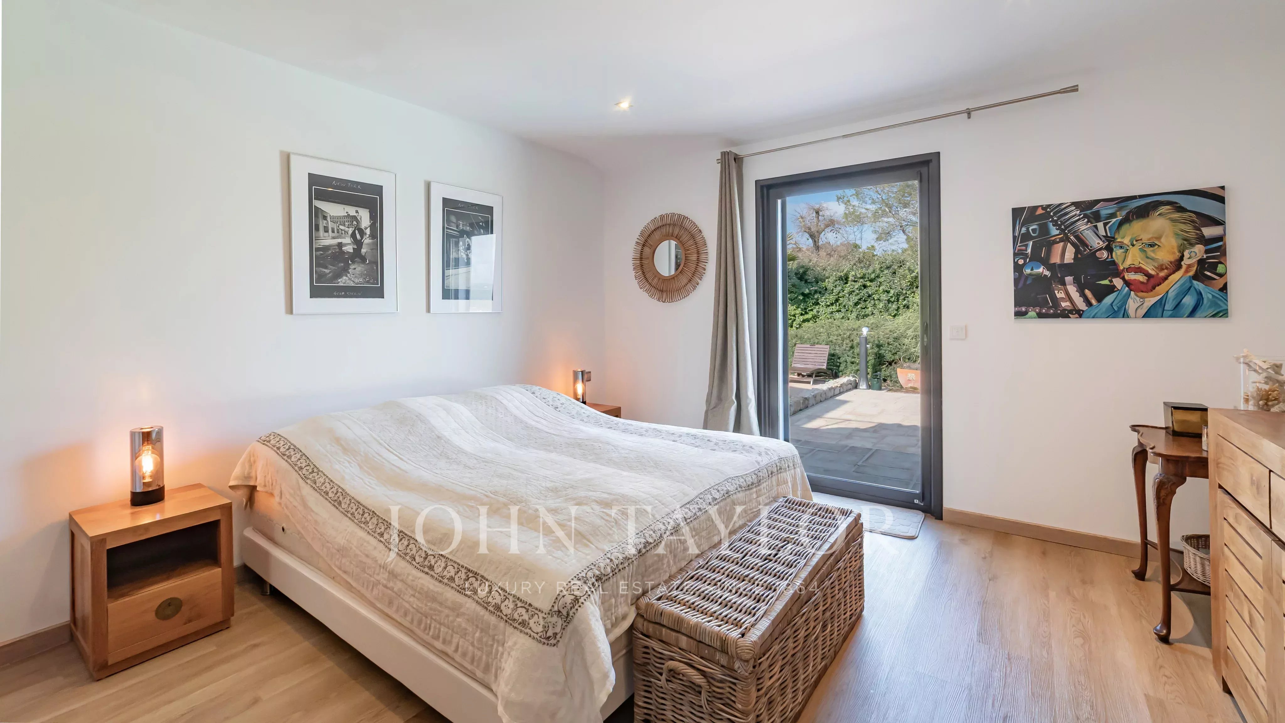 On the garden level, the villa features a master suite with bathroom and dressing room, plus three additional bedrooms, each with its own bathroom.
