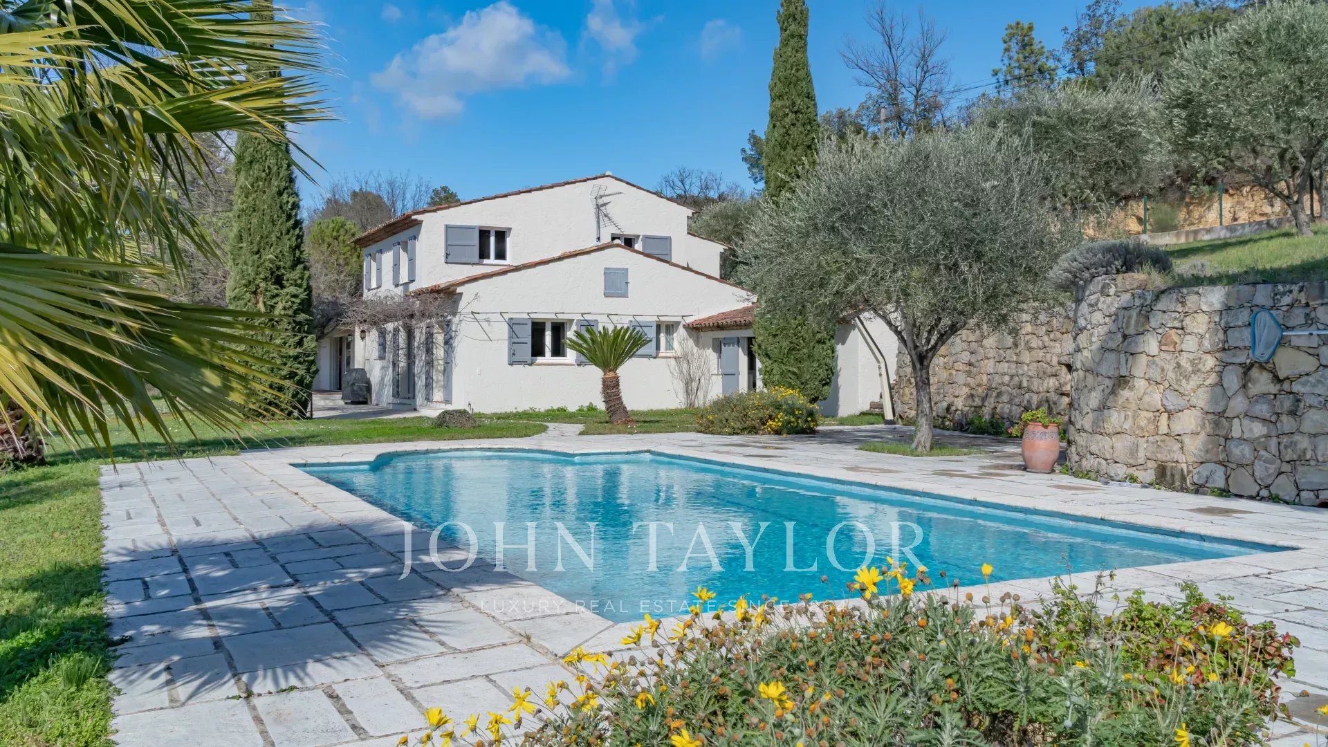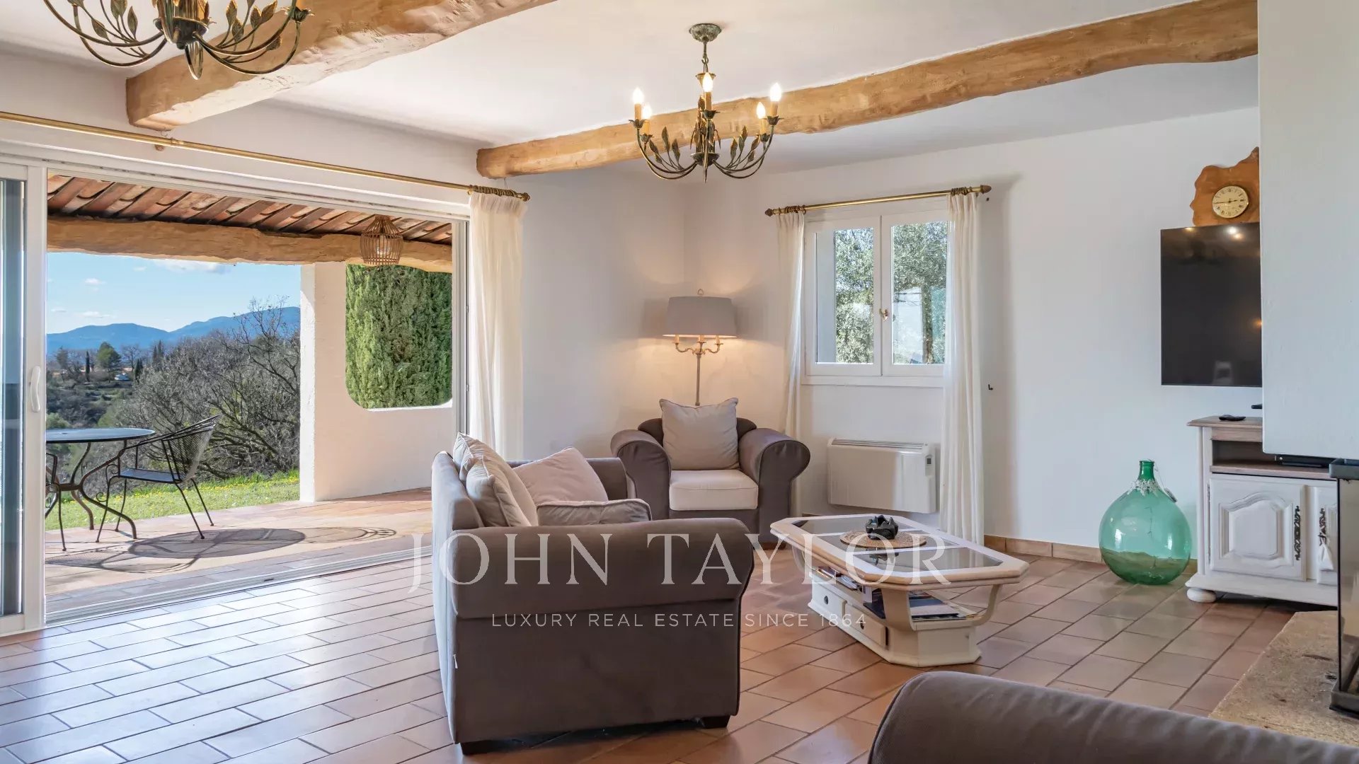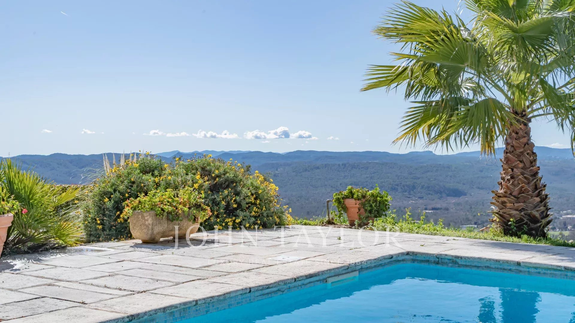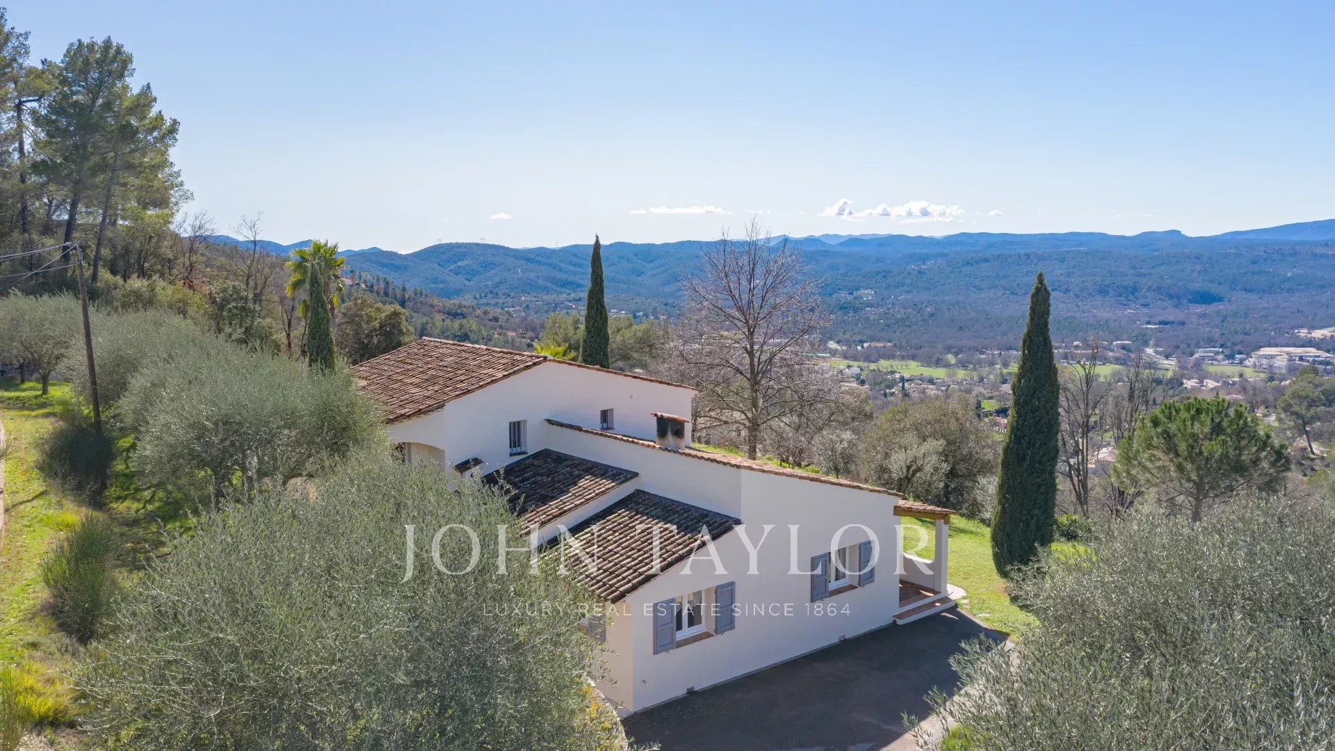 In a residential area, close to shops and the village of Montauroux, 210 sq.m villa set on 3600 sq.m grounds with swimming pool and olive trees, enjoying panoramic views over the Canton de Fayence.