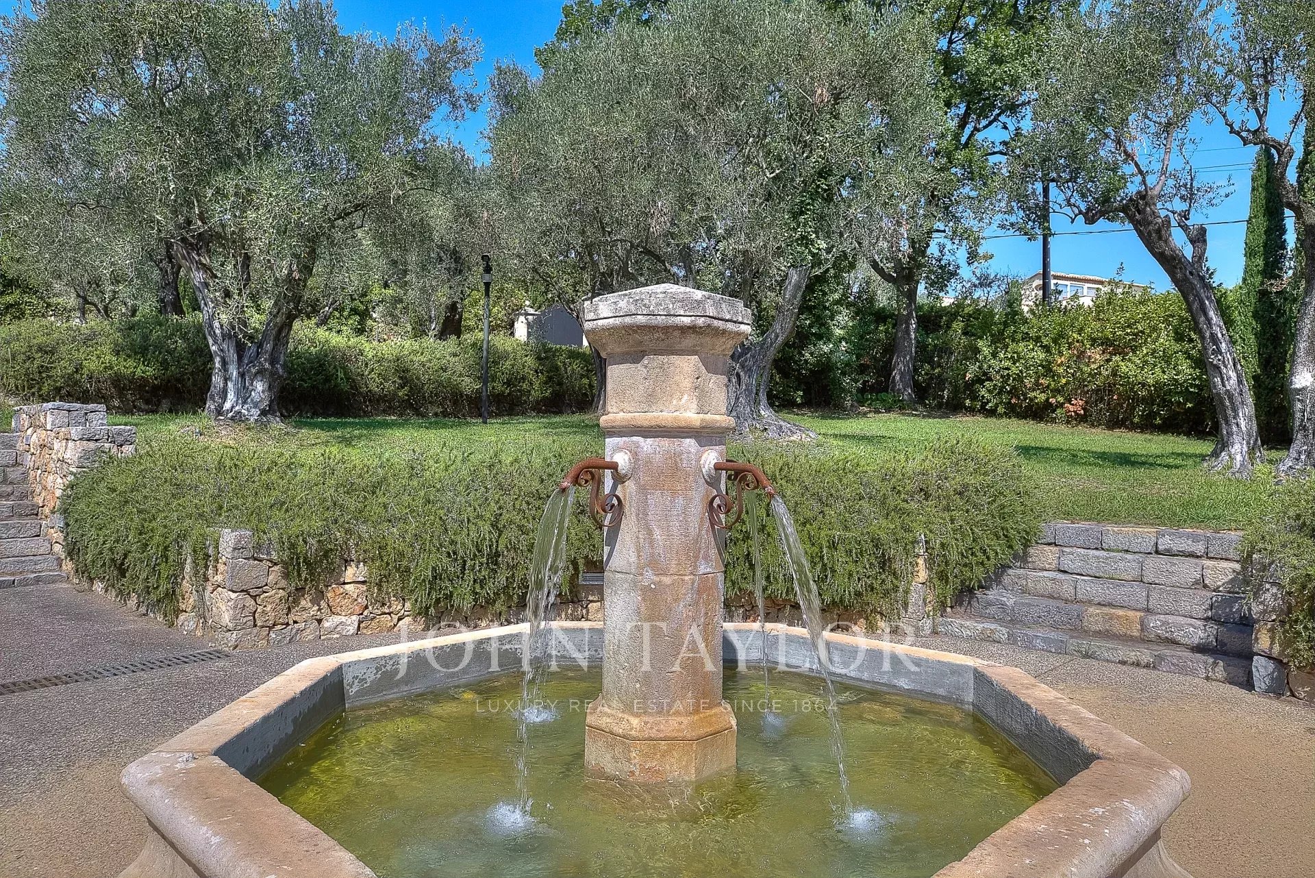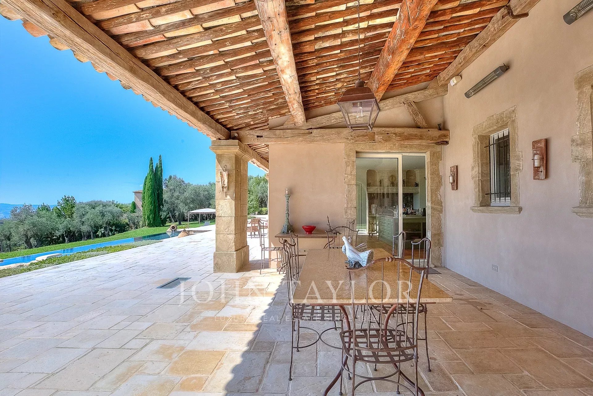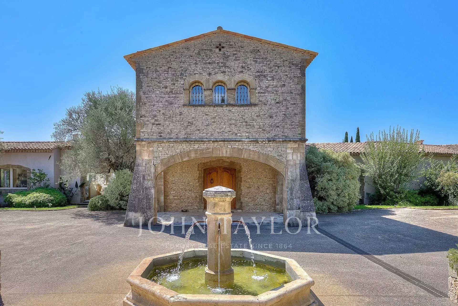 The 10,000 square meter landscaped property, designed by Jean Mus, consists of gentle restanques, stone walls, and is surrounded by over 160 olive trees.