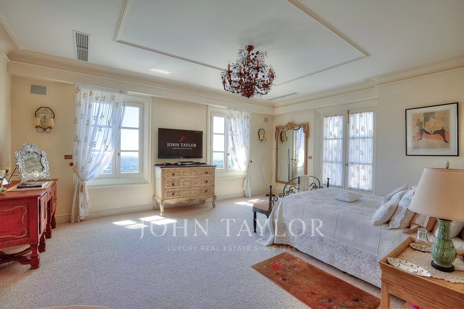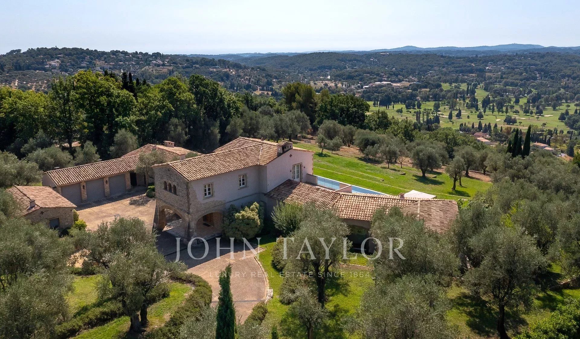 This prestigious property, which combines sophistication, comfort, and security, spans approximately 600 square meters of living space and offers breathtaking views of the golf course and the stunning Mediterranean panorama from the Bay of Nice to Mandelieu.