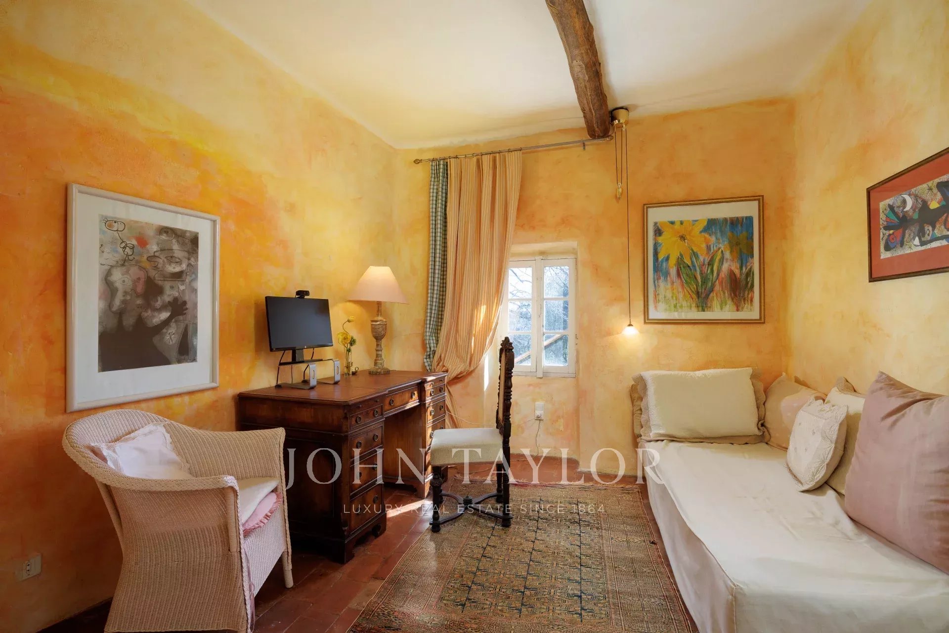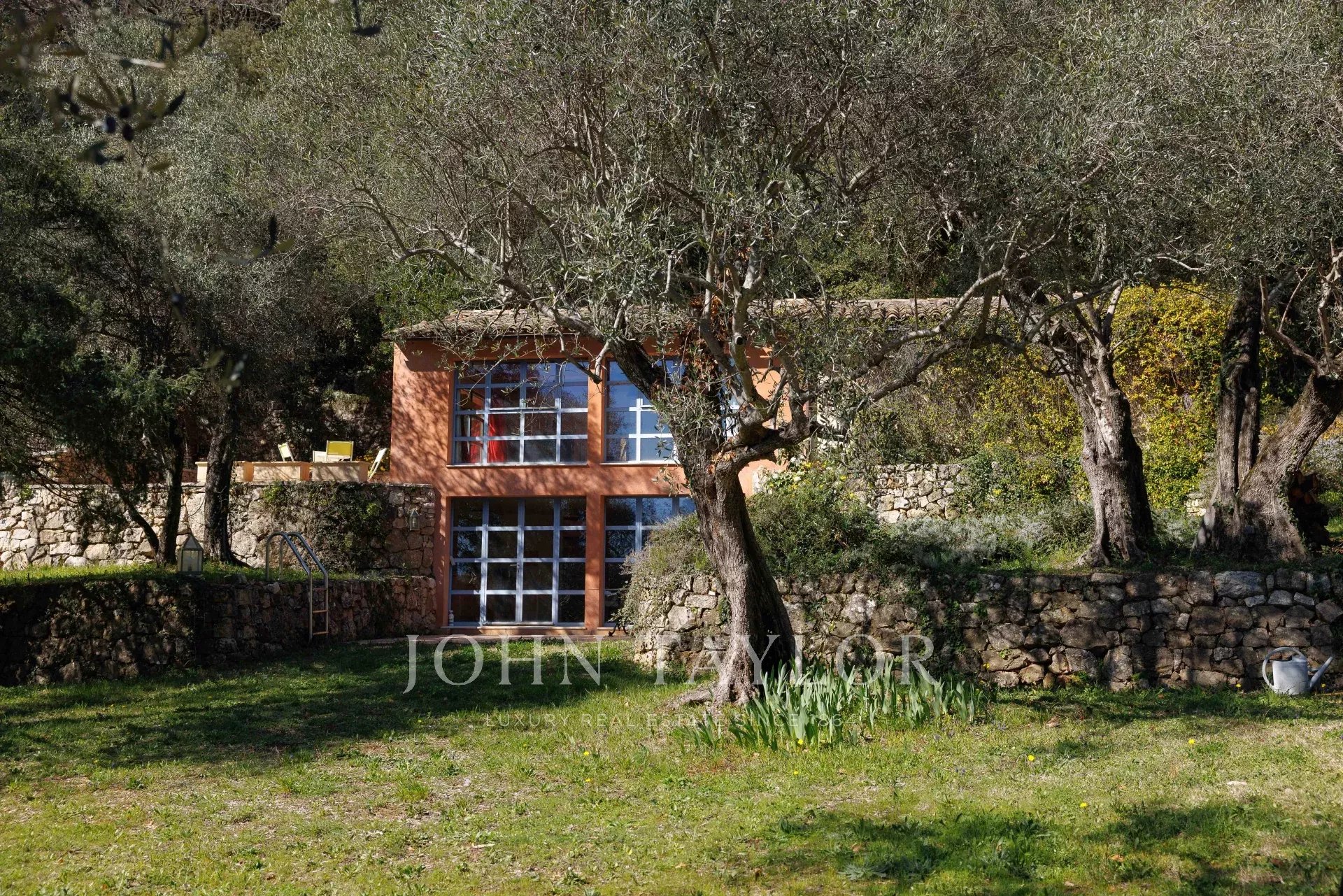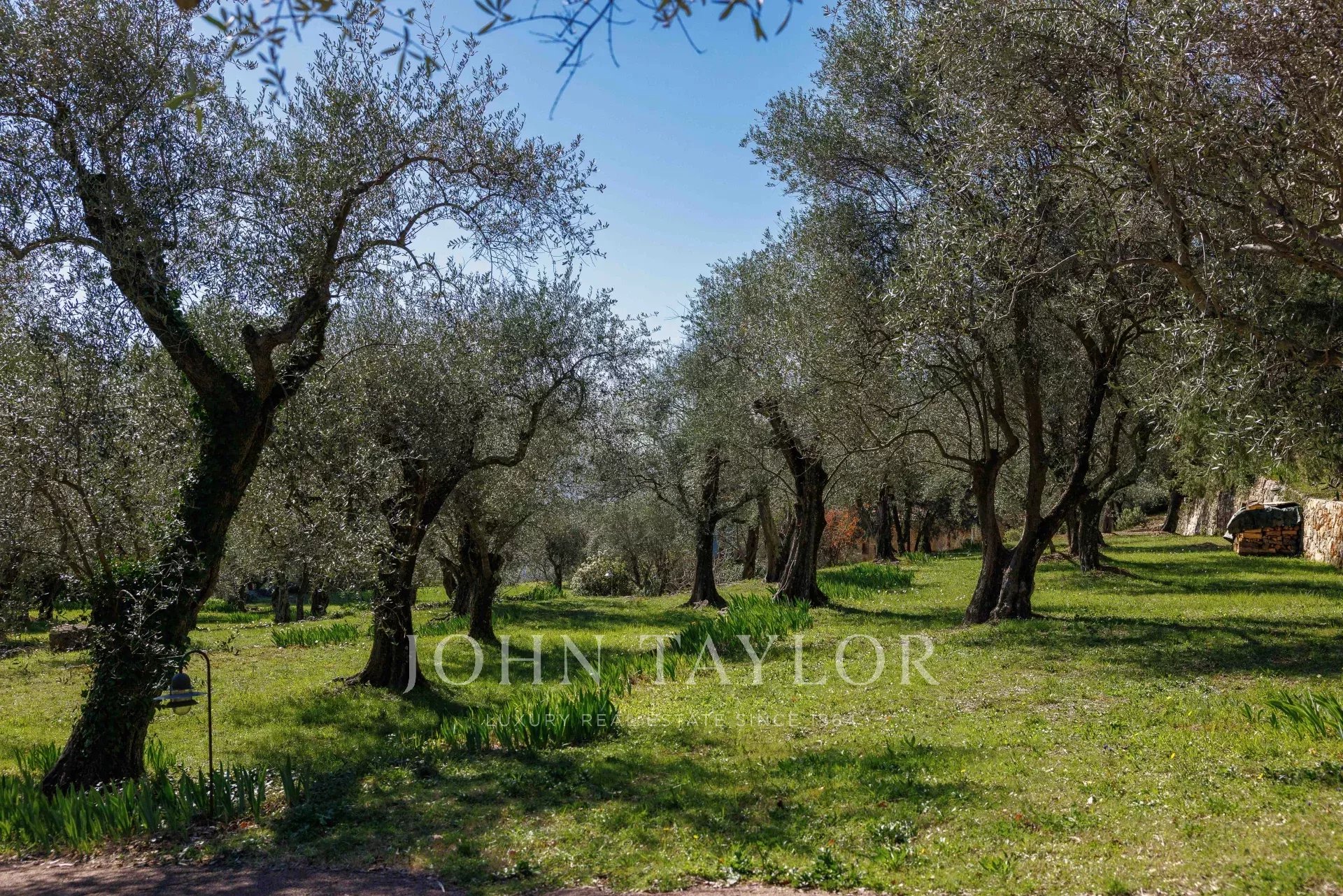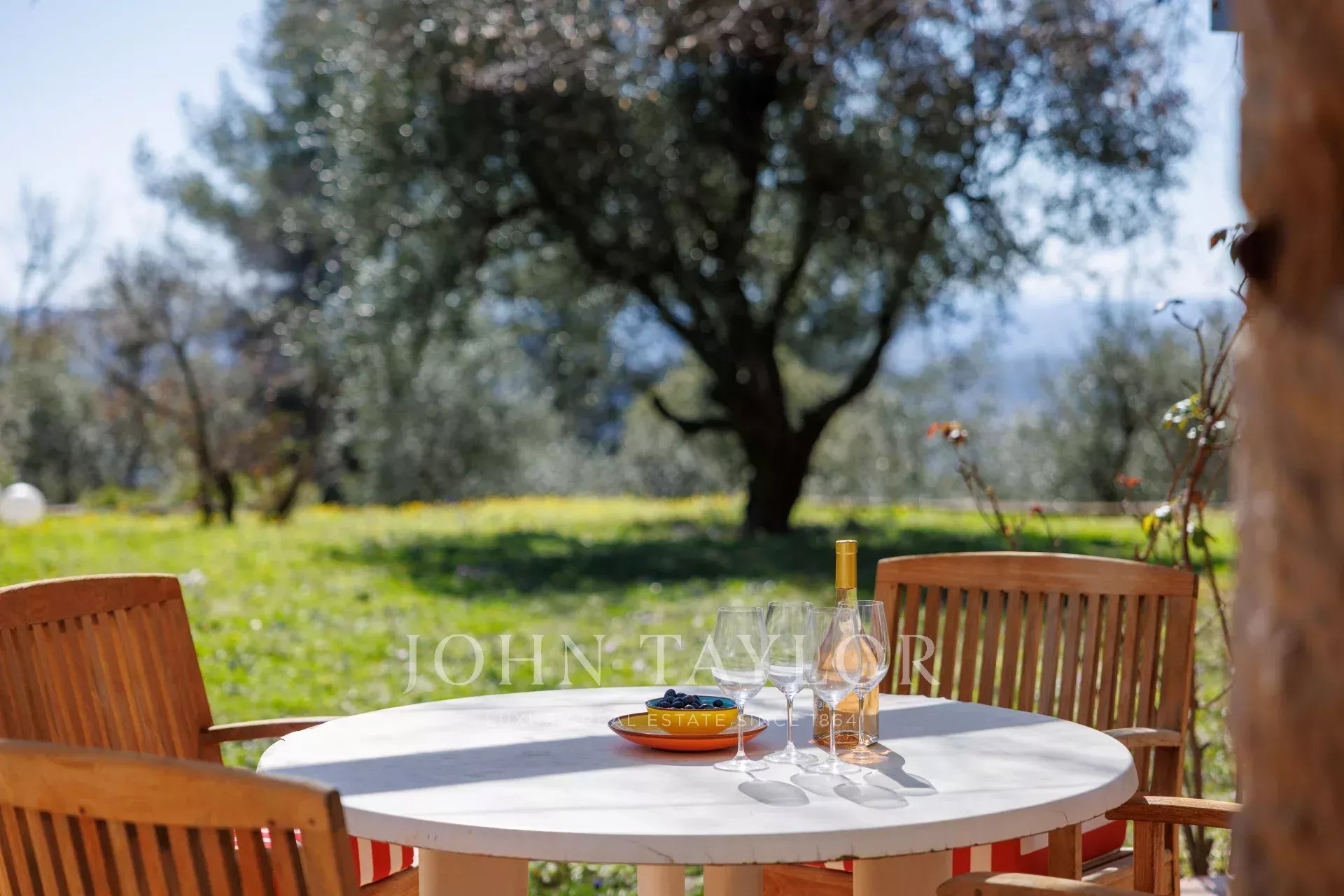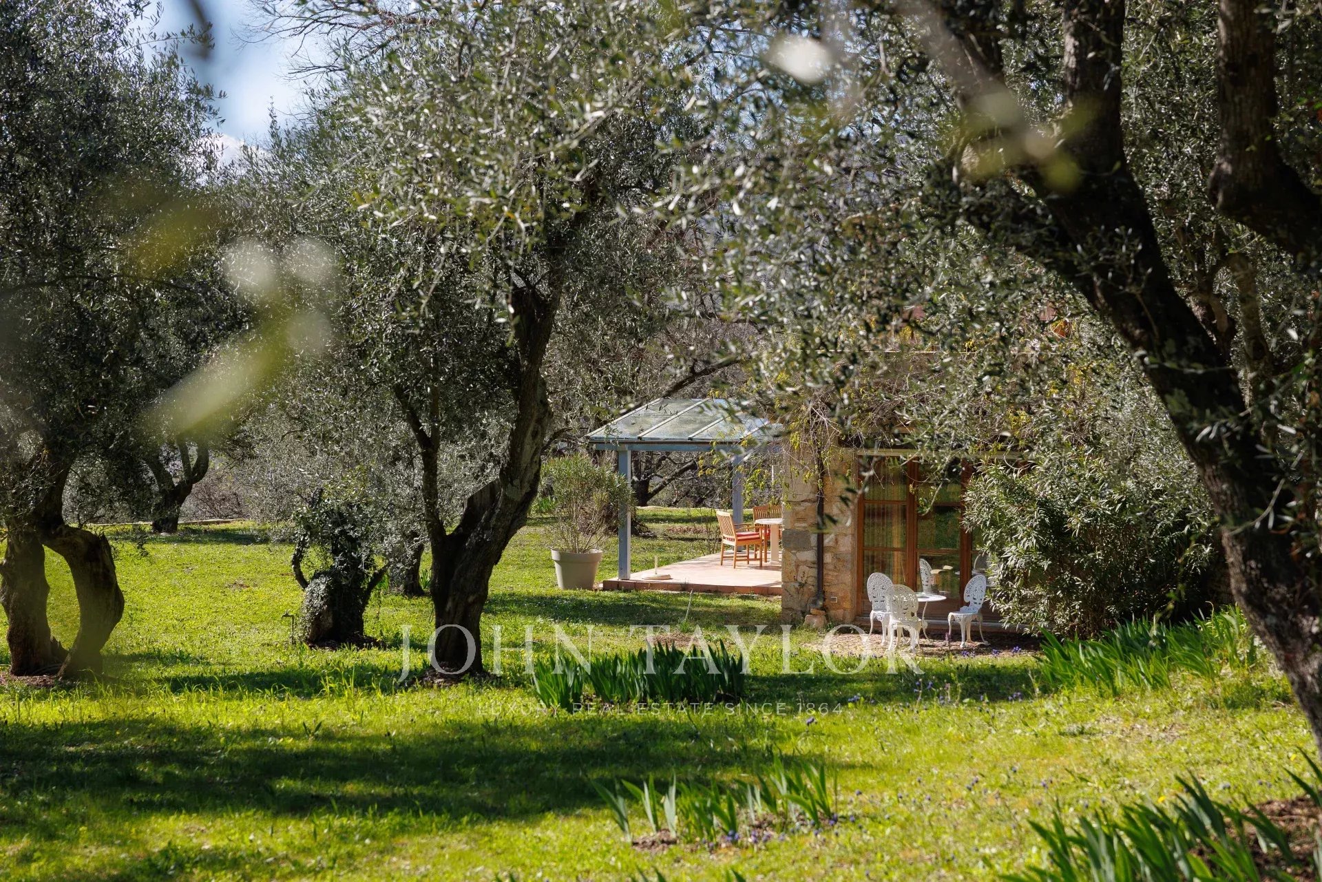 The main house features a pretty country kitchen, a dining room with fireplace and large French windows opening onto the garden and terrace surrounded by olive trees.