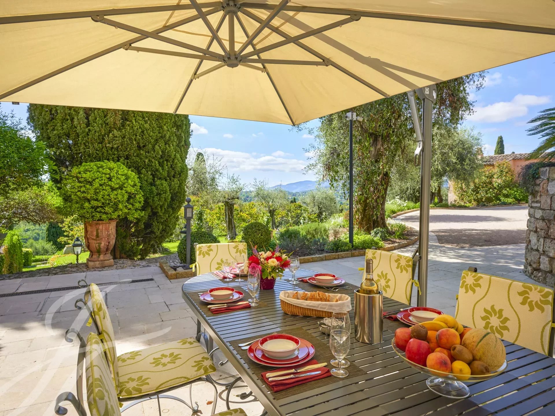 From the magnificent terraces, shaded by 180 year old lime trees, you have access to a romantic pond with koi carp, surrounded by box trees, cypresses and pines. The beautiful park also features countless fountains, an enchanting rose garden, an idyllic gazebo, an "Étang d'amour", rare and exotic tree species and an extensive olive grove.
