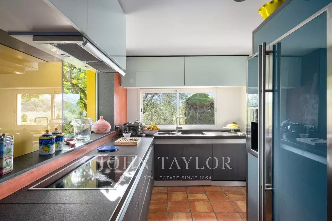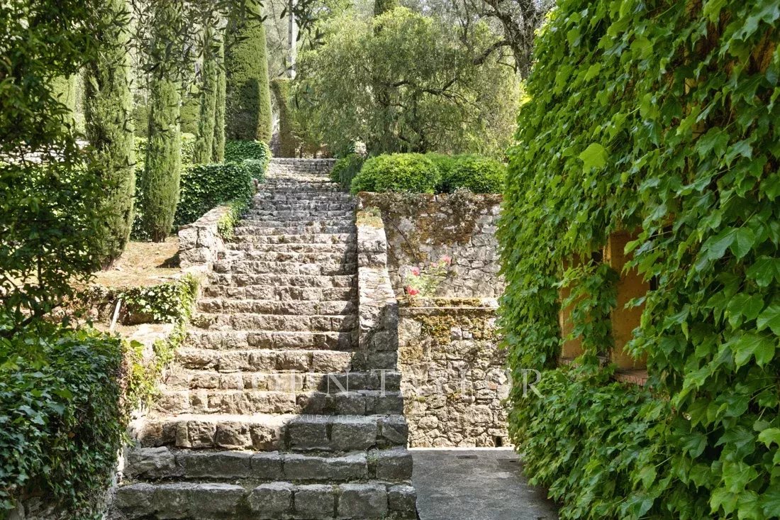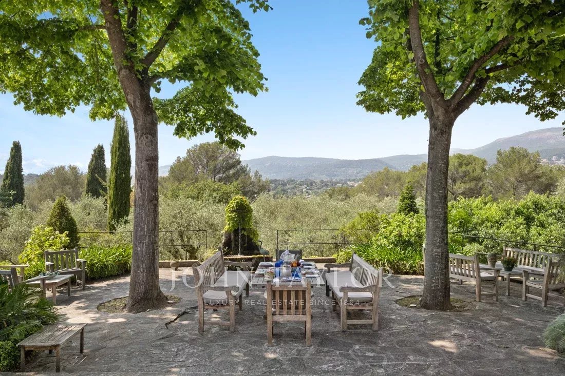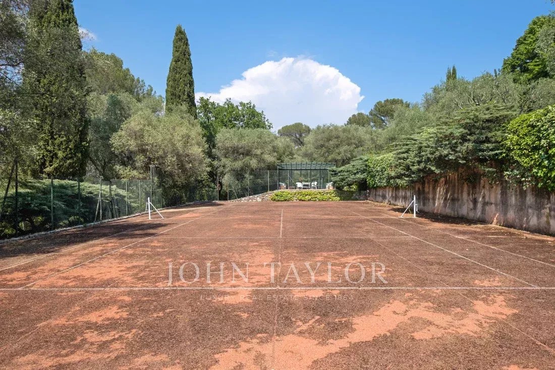 This 1.6-hectare property with its magnificent Mediterranean plants, numerous terraces, water fountains and tennis court offers panoramic views of the surrounding hills and absolute serenity.