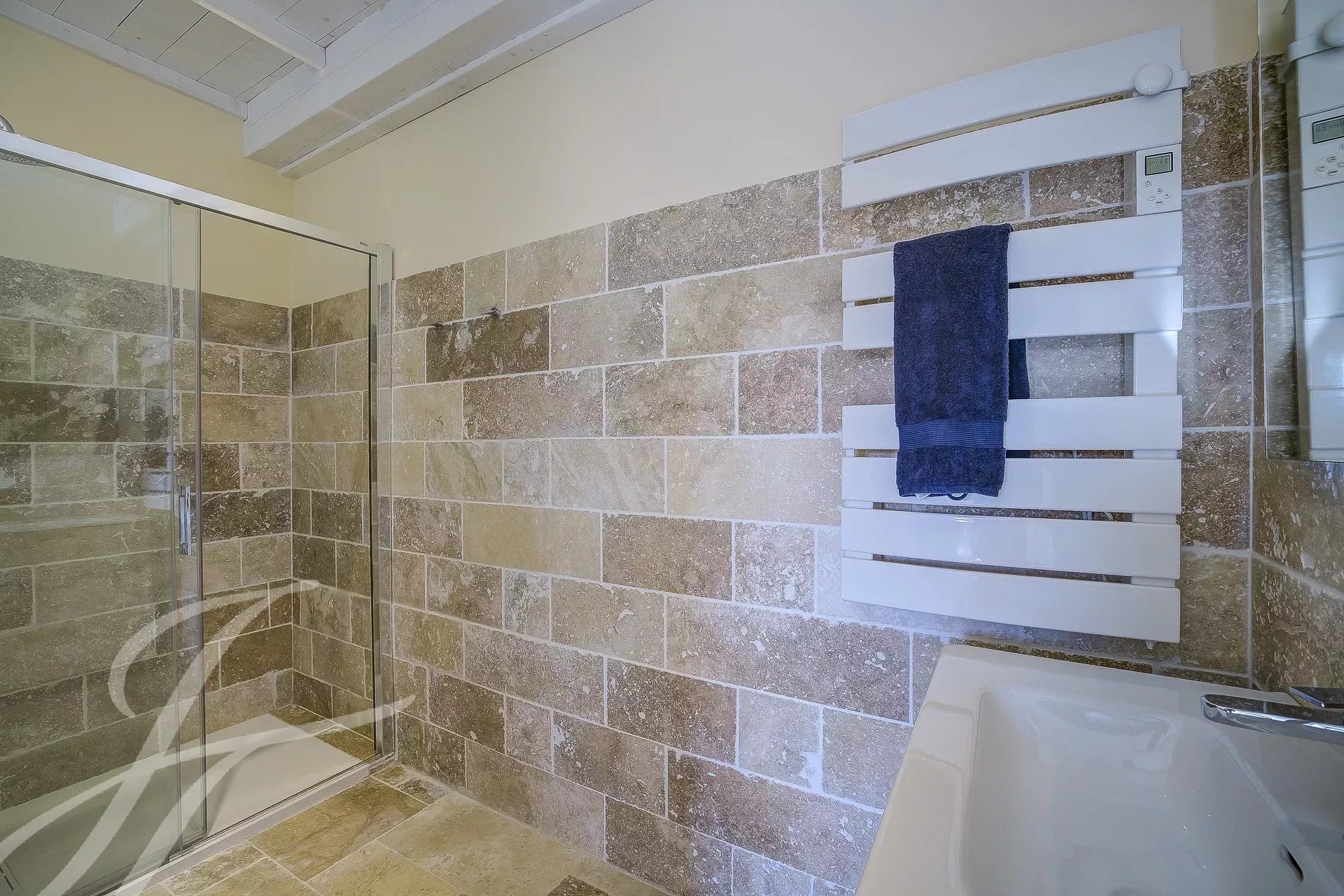 The upper floor is devoted to the master bedroom, which has an en suite bathroom and a private balcony overlooking the hills.