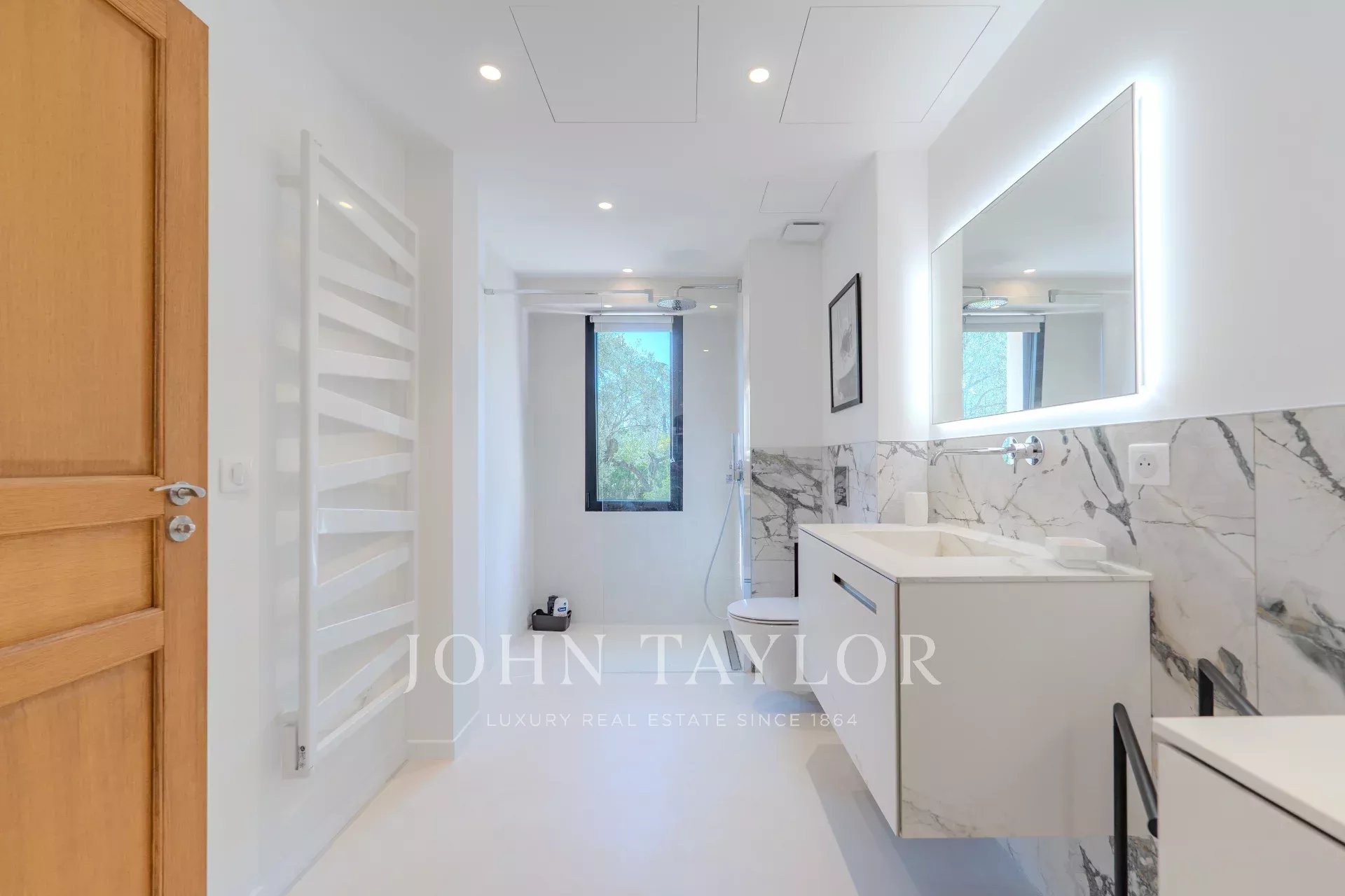 The generous reception areas, flooded with natural light, flow seamlessly onto a panoramic terrace framing breathtaking views of the Mediterranean. The suites, conceived as intimate sanctuaries, offer both comfort and privacy.