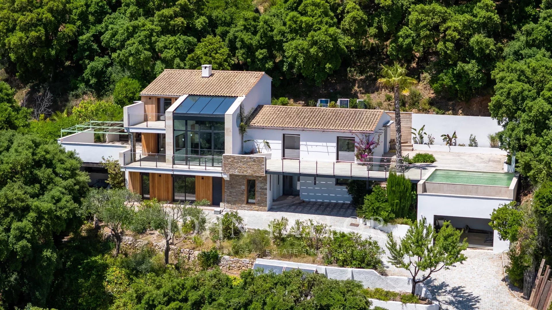 Set on a plot of approximately 3,500 m², the villa offers around 220 m² of living space spread over three levels. It features large sun-drenched terraces, a swimming pool with pool house, a spacious garage, and additional parking.