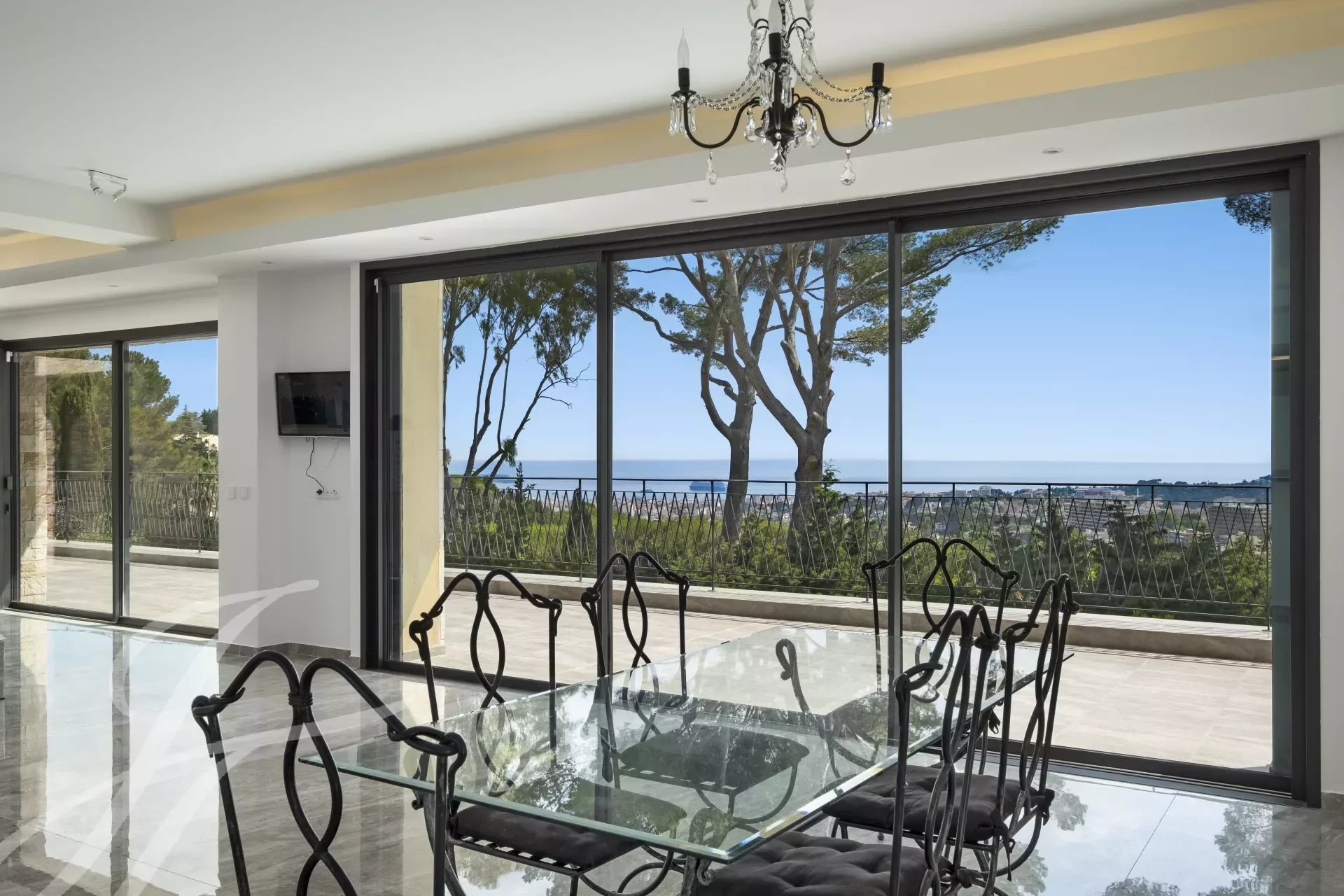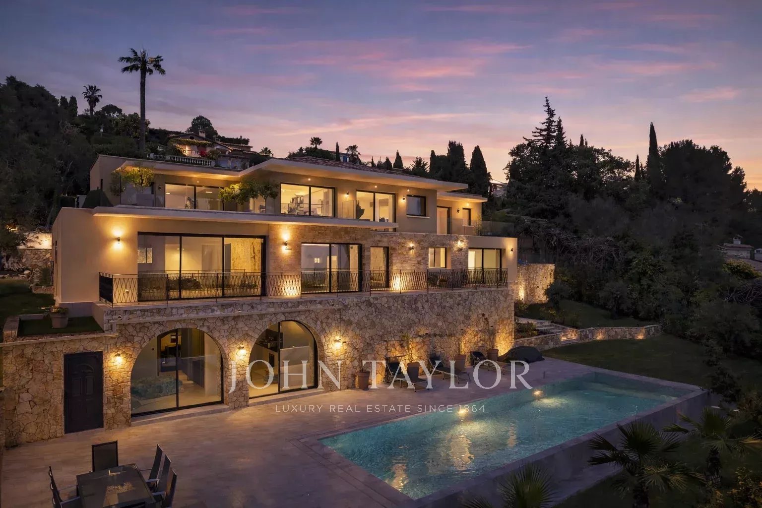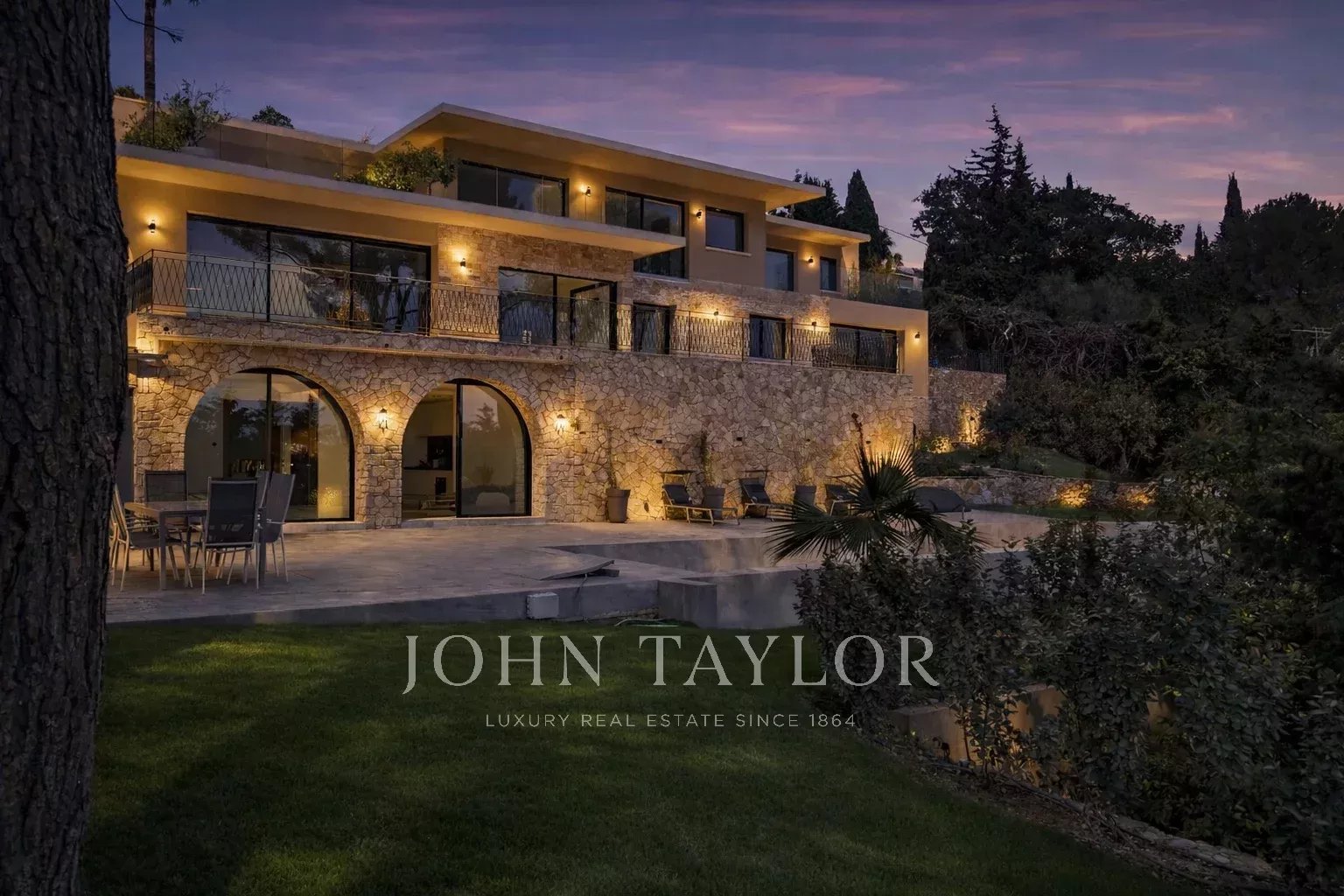 Located on the outskirts of Mougins, on the heights of Cannes, this contemporary 370 m² villa, completely renovated in 2023 and designed by a well-known architect, boasts spectacular sea views over the Lérins islands, the Esterel mountains and the Bay of Cannes.