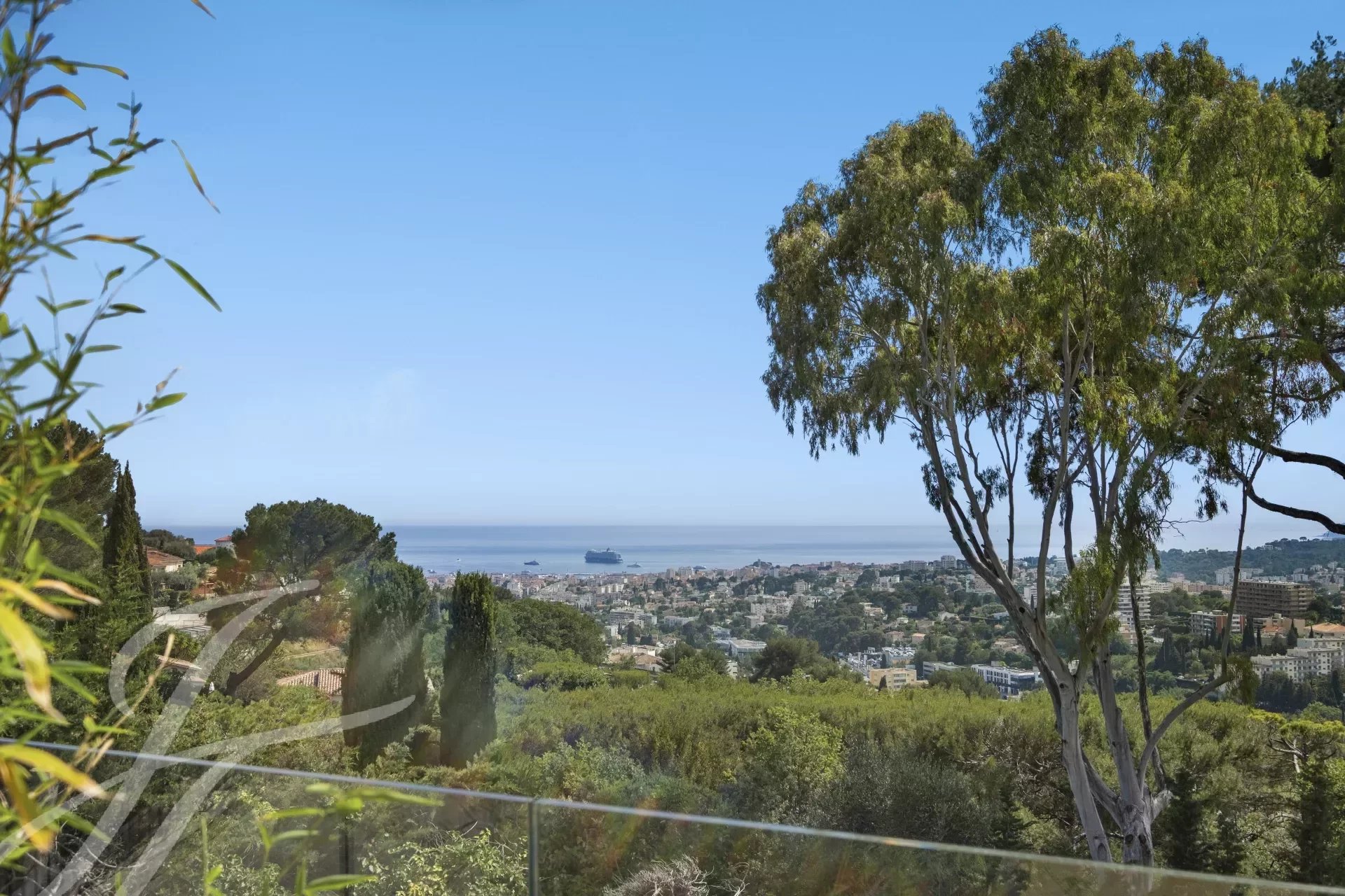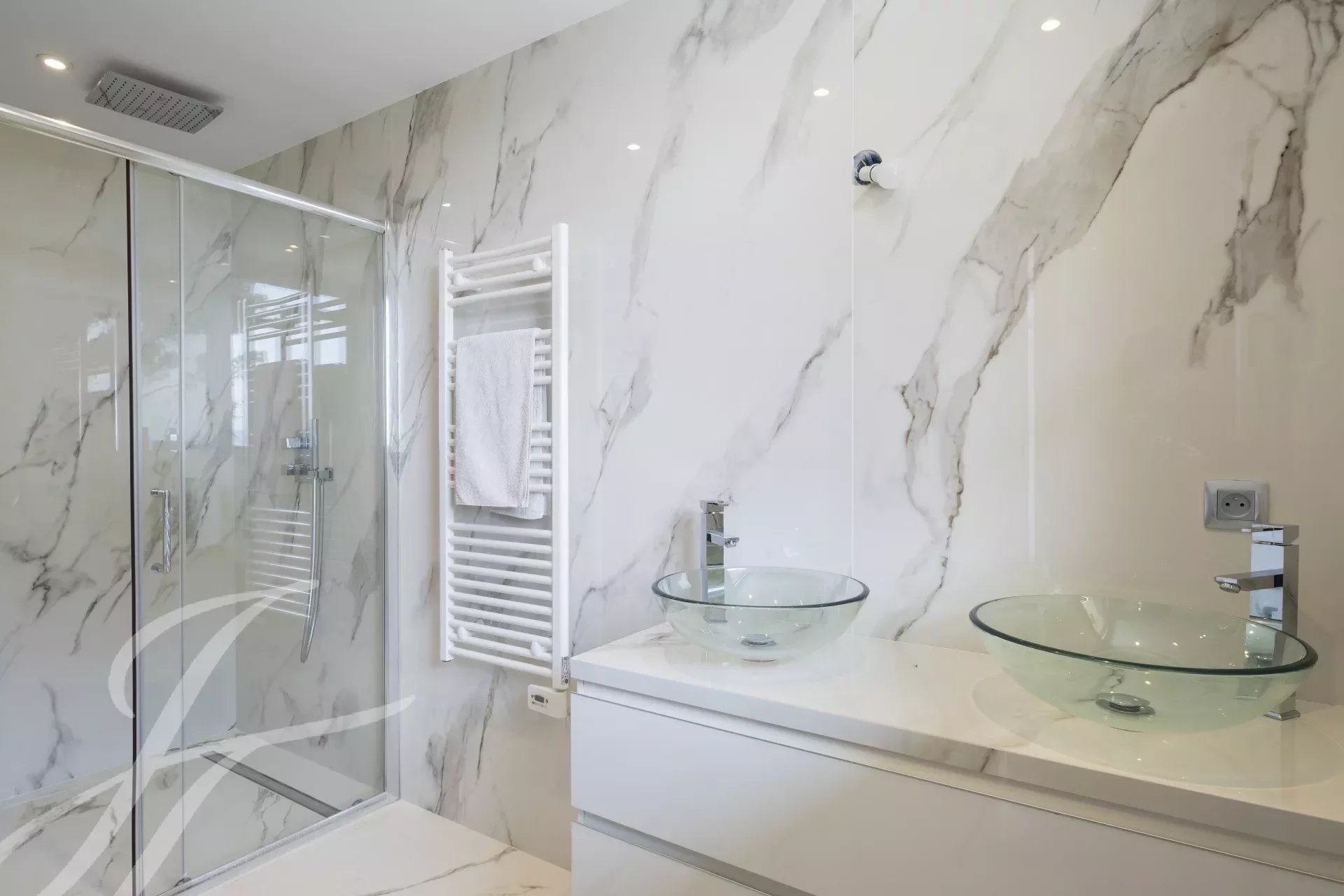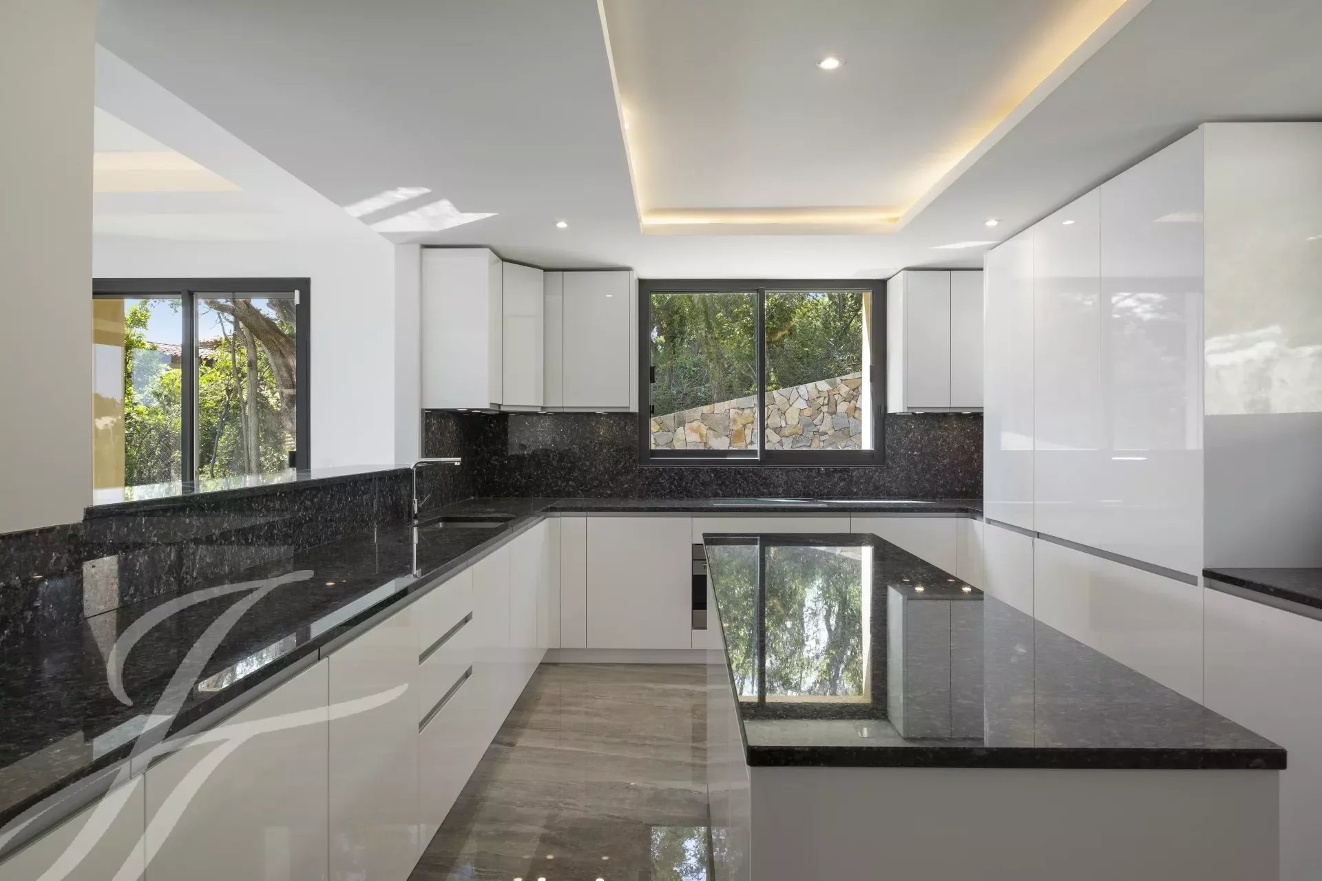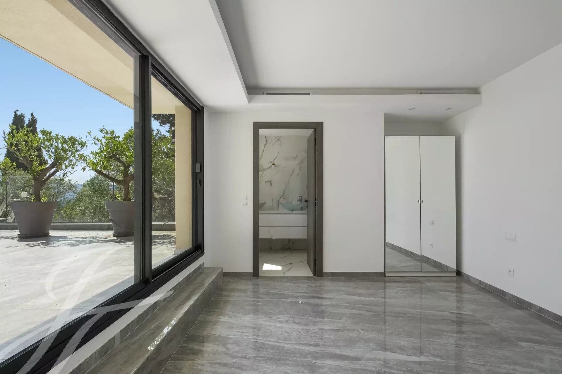 Located on the outskirts of Mougins, on the heights of Cannes, this contemporary 370 m² villa, completely renovated in 2023 and designed by a well-known architect, boasts spectacular sea views over the Lérins islands, the Esterel mountains and the Bay of Cannes.