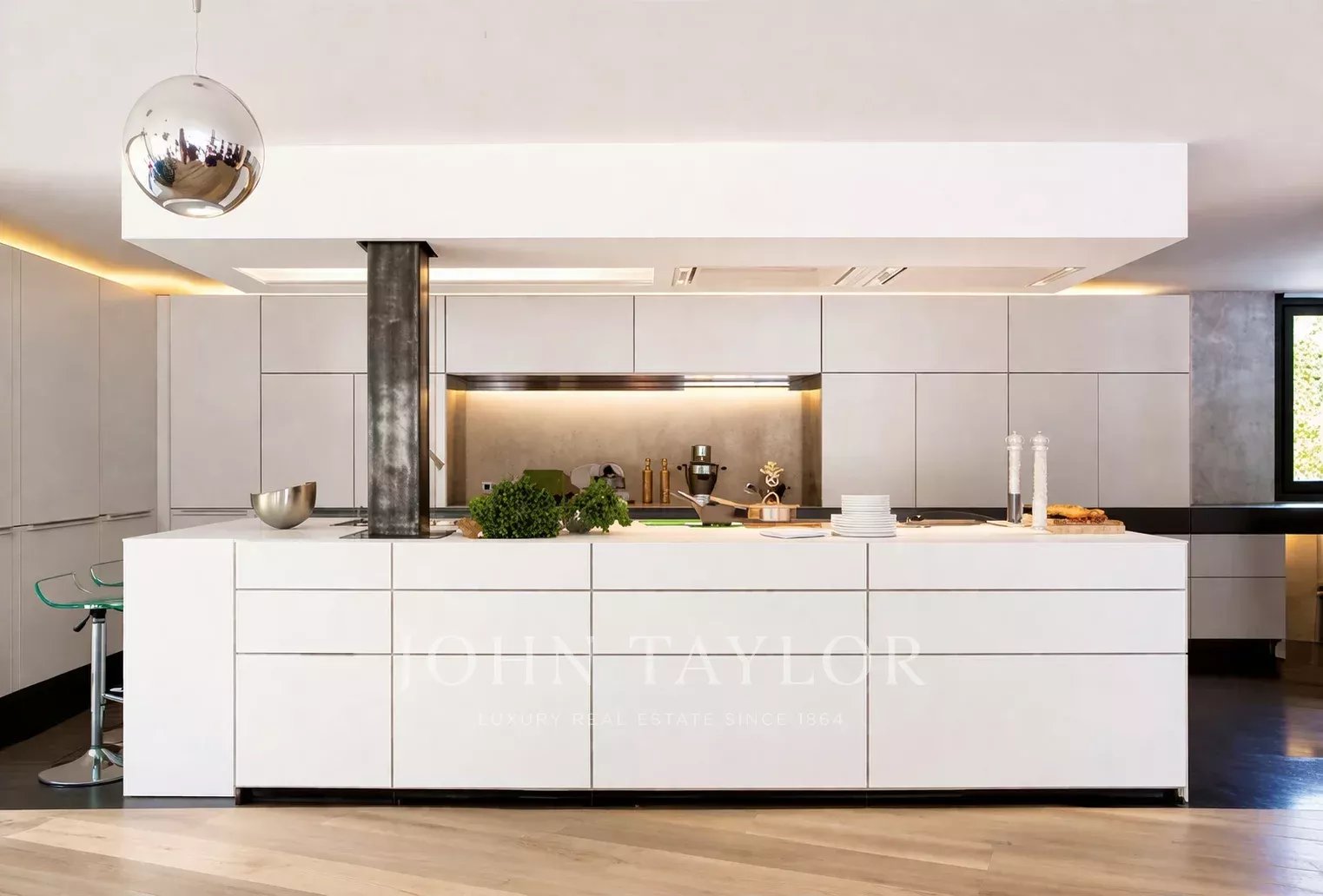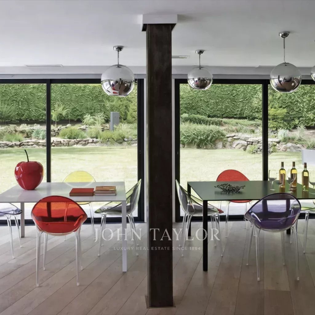 Inspired by contemporary Provençal style, the villa reveals generous volumes and architecture designed to enhance light. The spectacular cathedral living room, accentuated by a double fireplace, opens harmoniously onto an elegant dining room and a top-of-the-line kitchen with impeccable finishes, designed as a true convivial space.