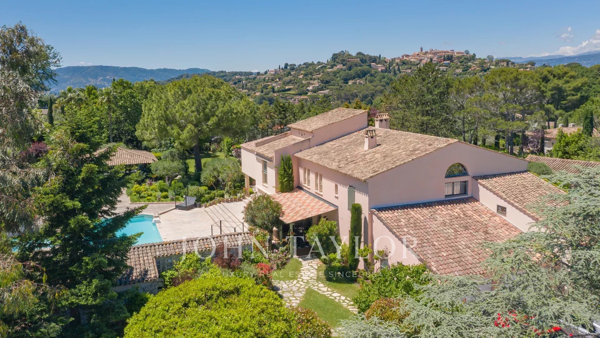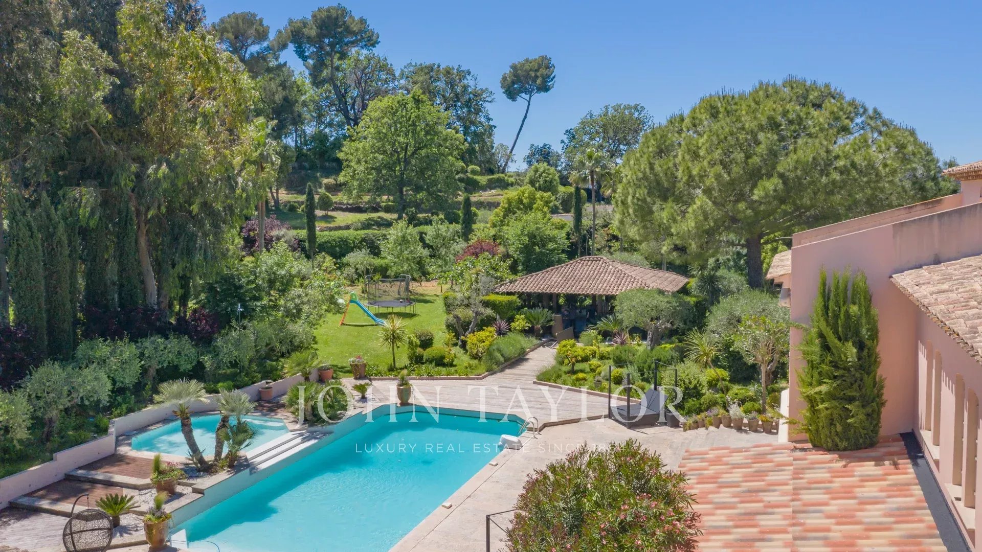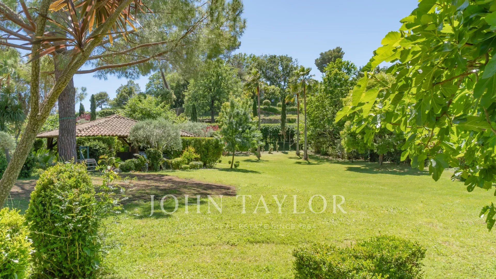 In a quiet, secured and gated Domaine of Mougins, superb property nestled in a landscaped parc of approx. 7,700 sq.m with swimming pool and tennis court.