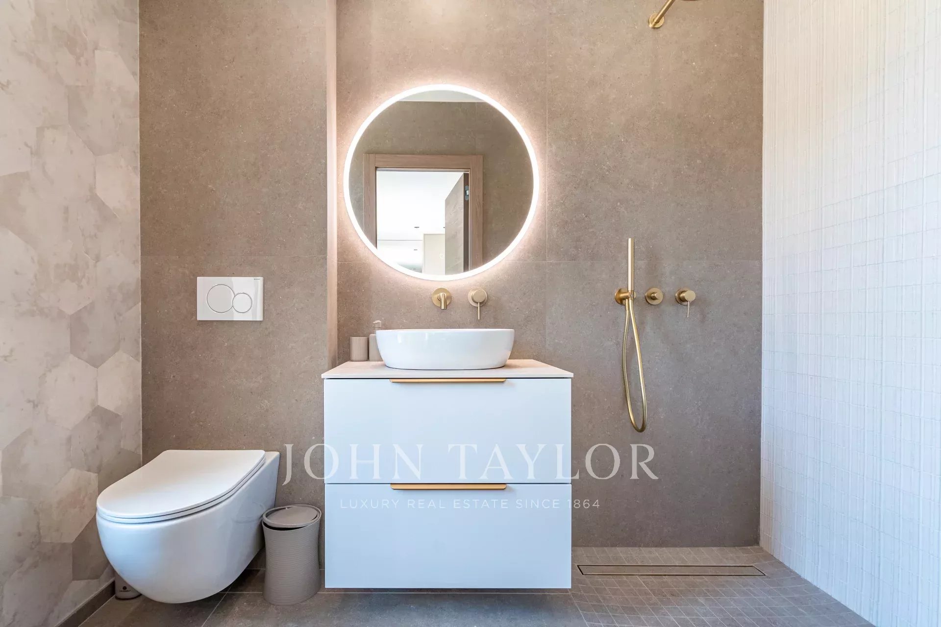 The main villa, with a generous 230 m² spread over two levels, is designed for optimum comfort. On the garden level, a welcoming entrance hall with a large checkroom and guest toilet leads to a spacious, light-filled living room, a separate kitchen and a laundry room. Upstairs are four en suite bedrooms, each with its own private bathroom, including a sumptuous master suite with a spacious dressing room.