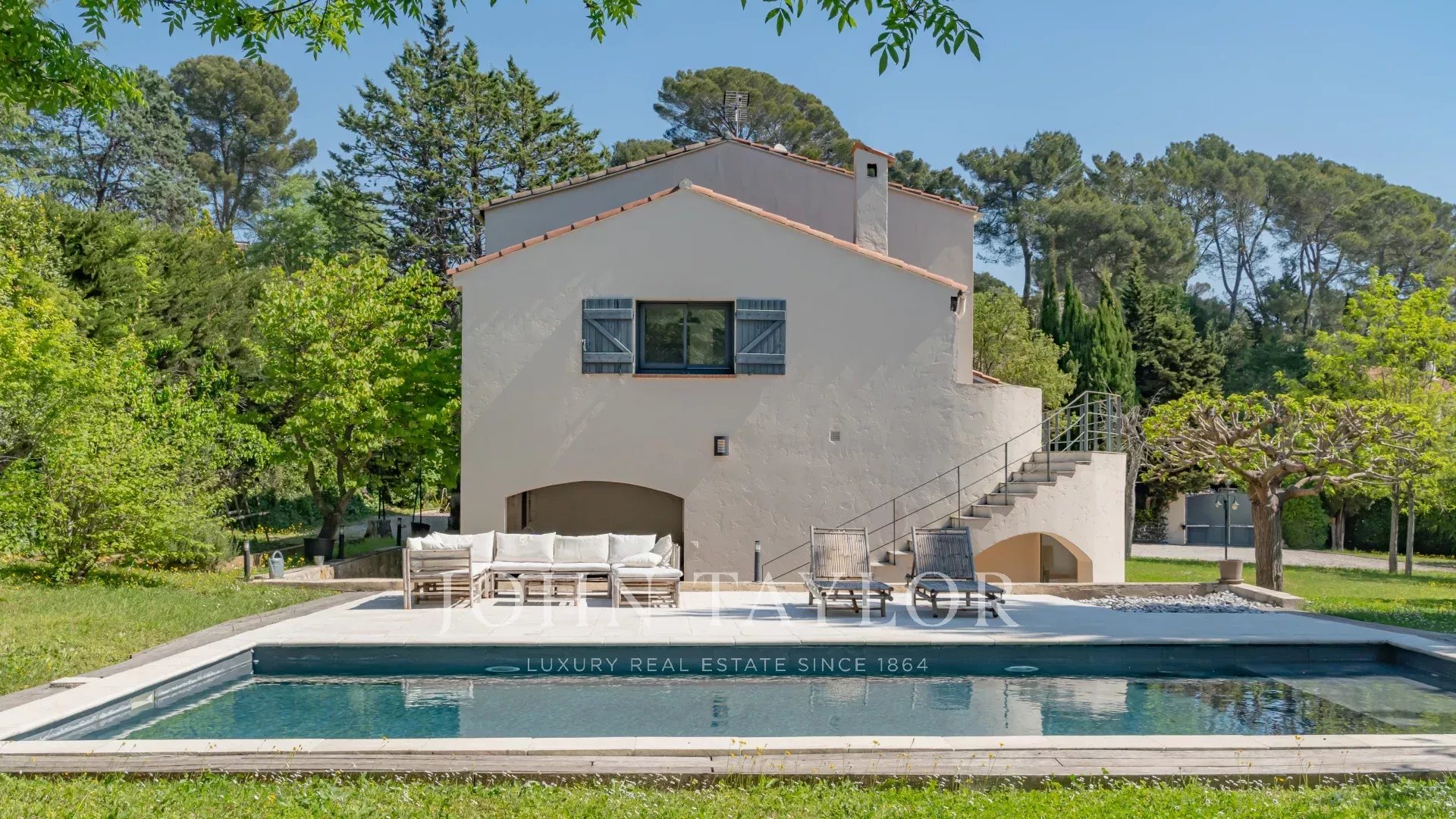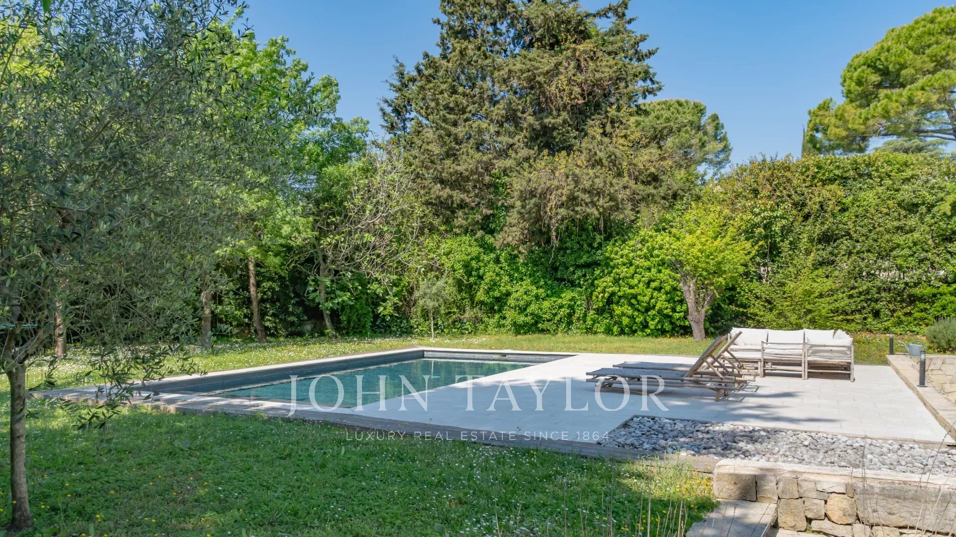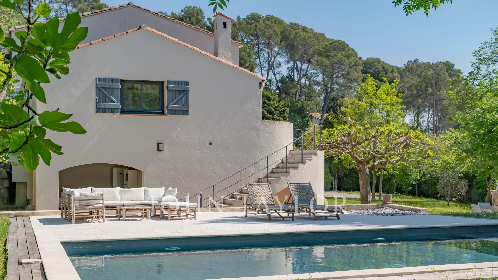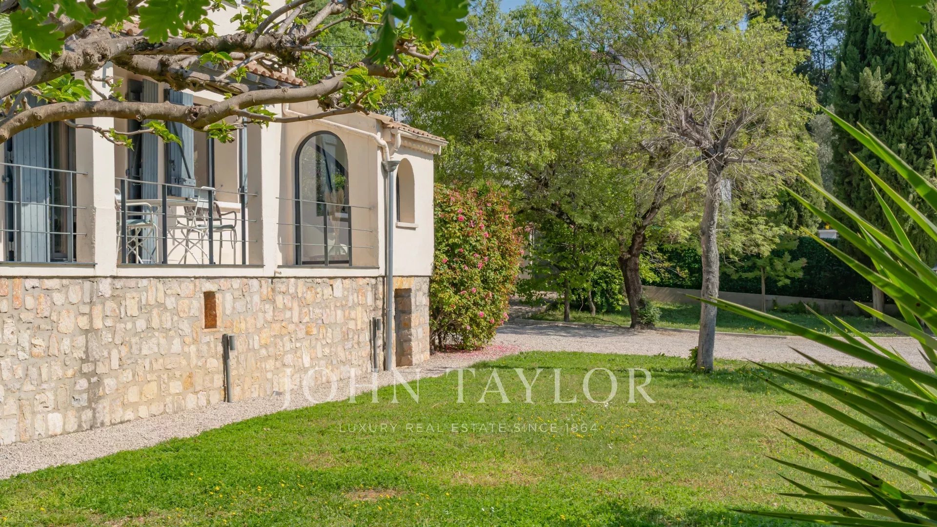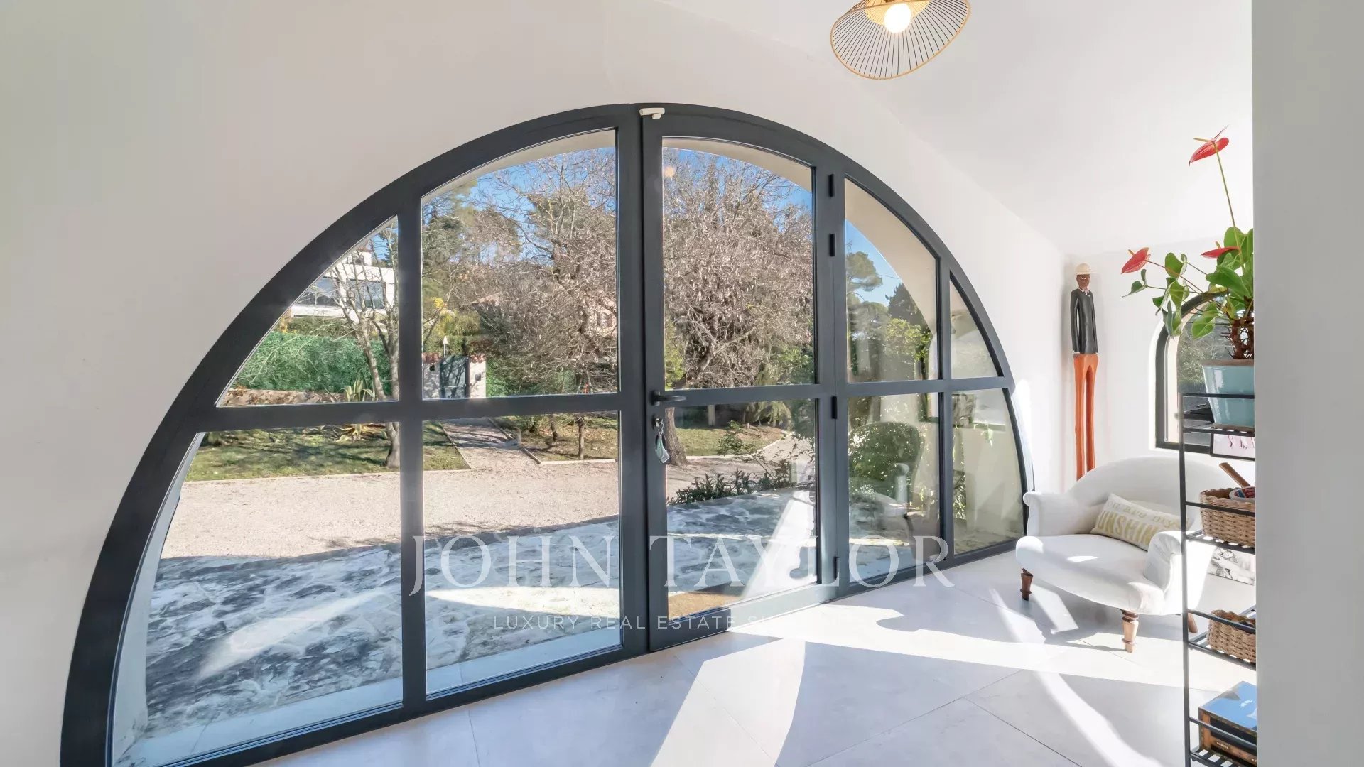 Nestled in a gated and sought-after domain, this villa enjoys a serene setting while being ideally located near a renowned golf course, Mougins School, and Sophia Antipolis.