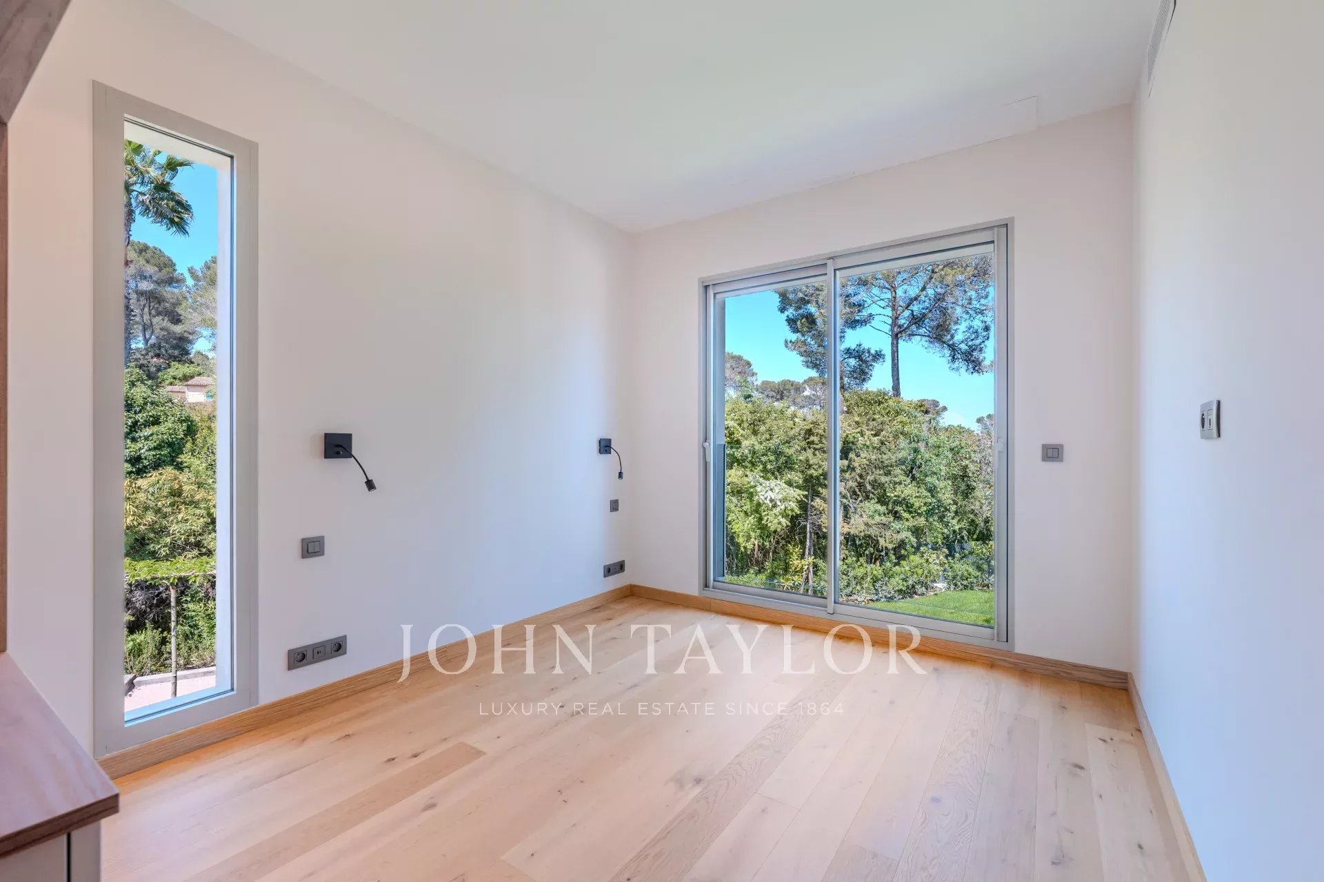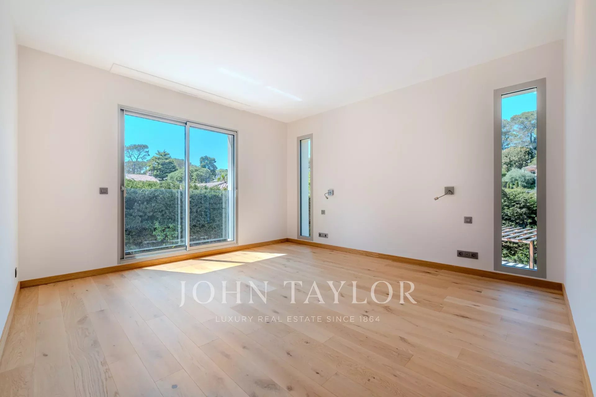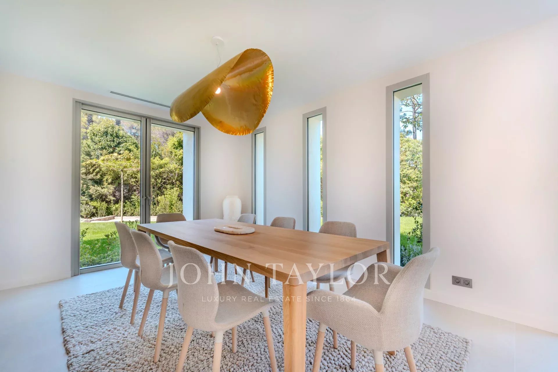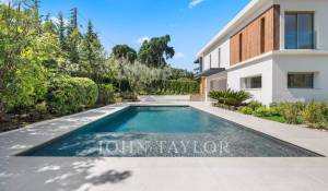 Located in a gated, secure estate close to international schools and the Cannes golf course, this villa features a contemporary design that blends seamlessly into the natural environment.