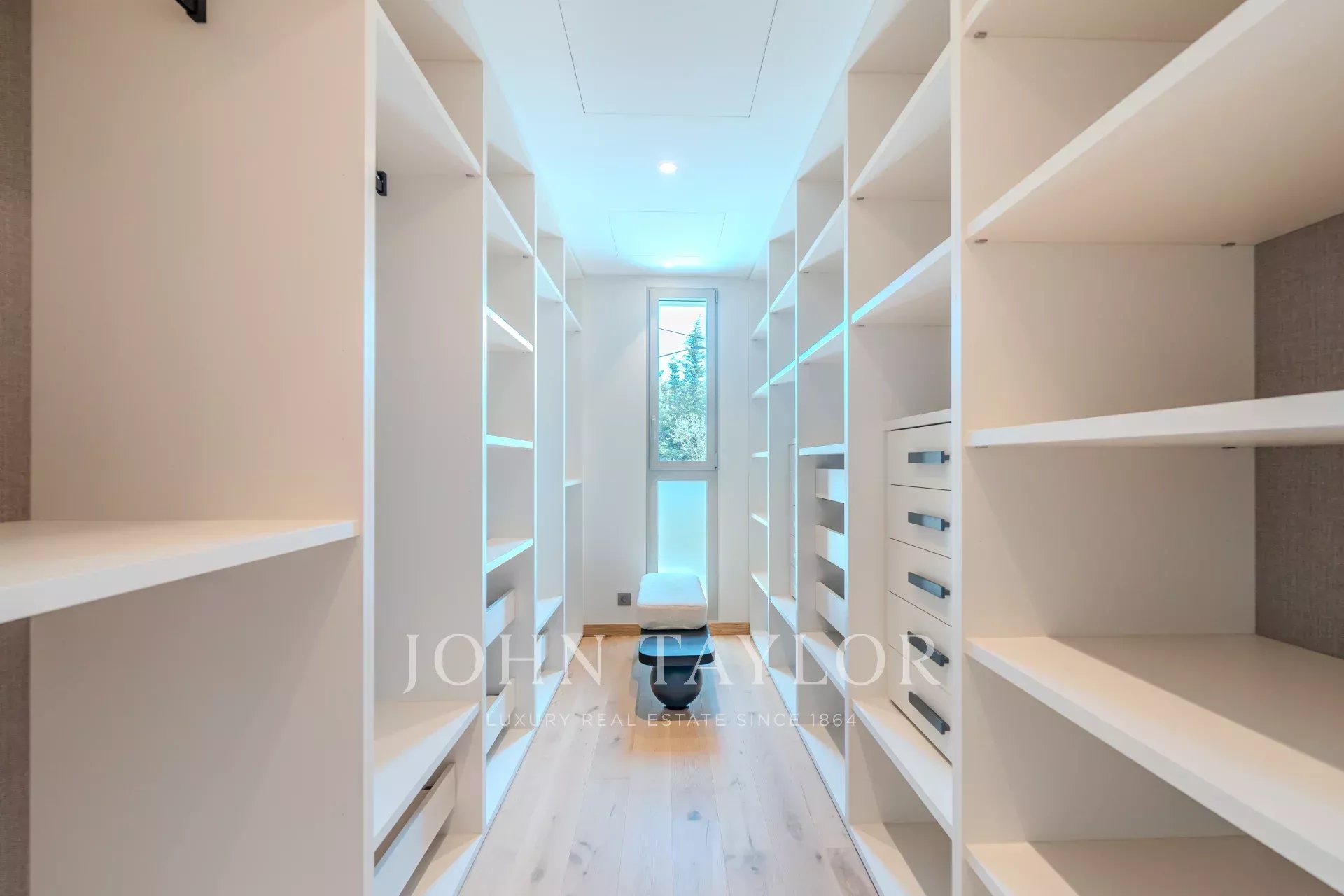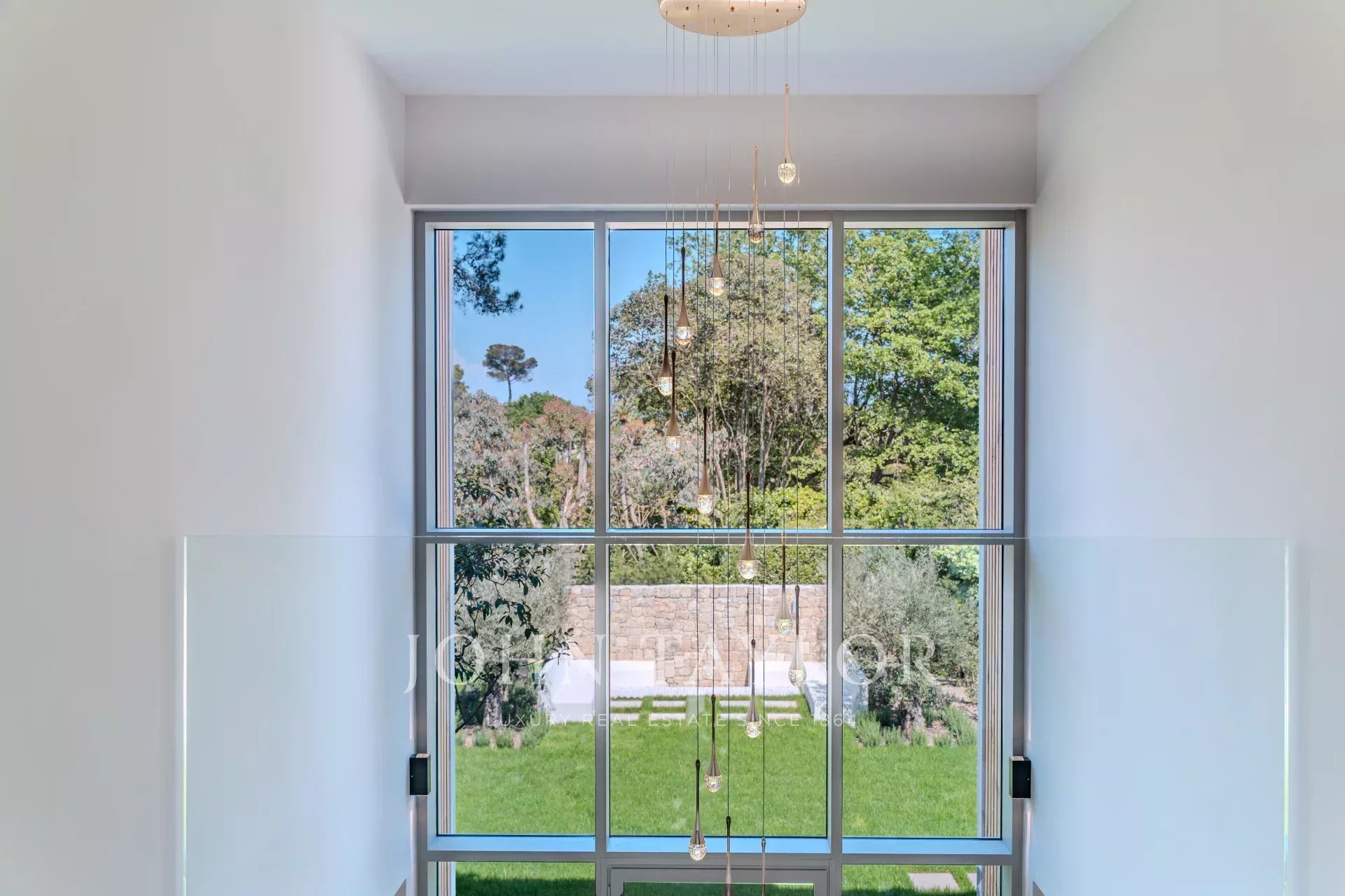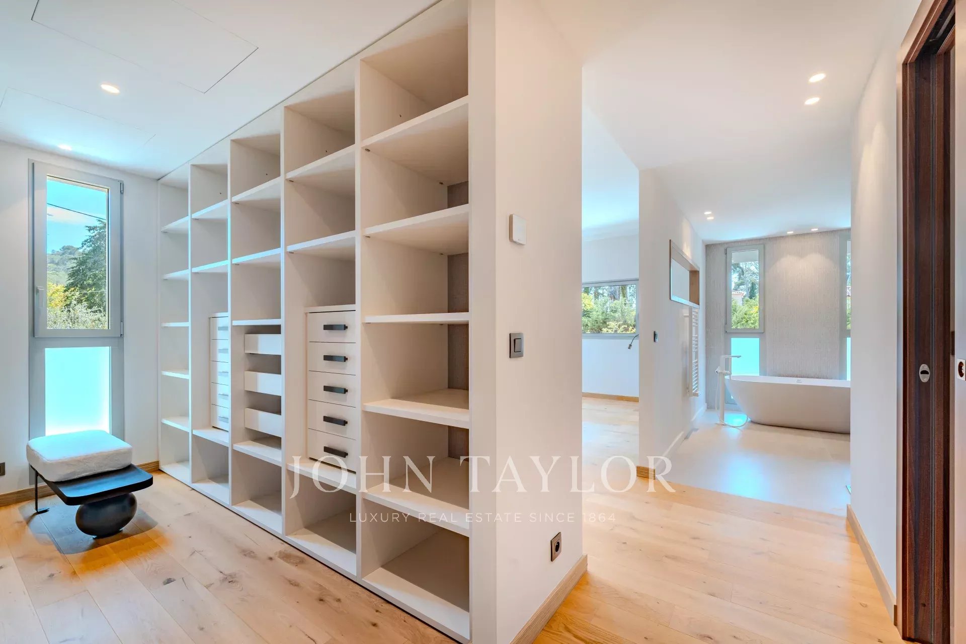 Located in a gated, secure estate close to international schools and the Cannes golf course, this villa features a contemporary design that blends seamlessly into the natural environment.