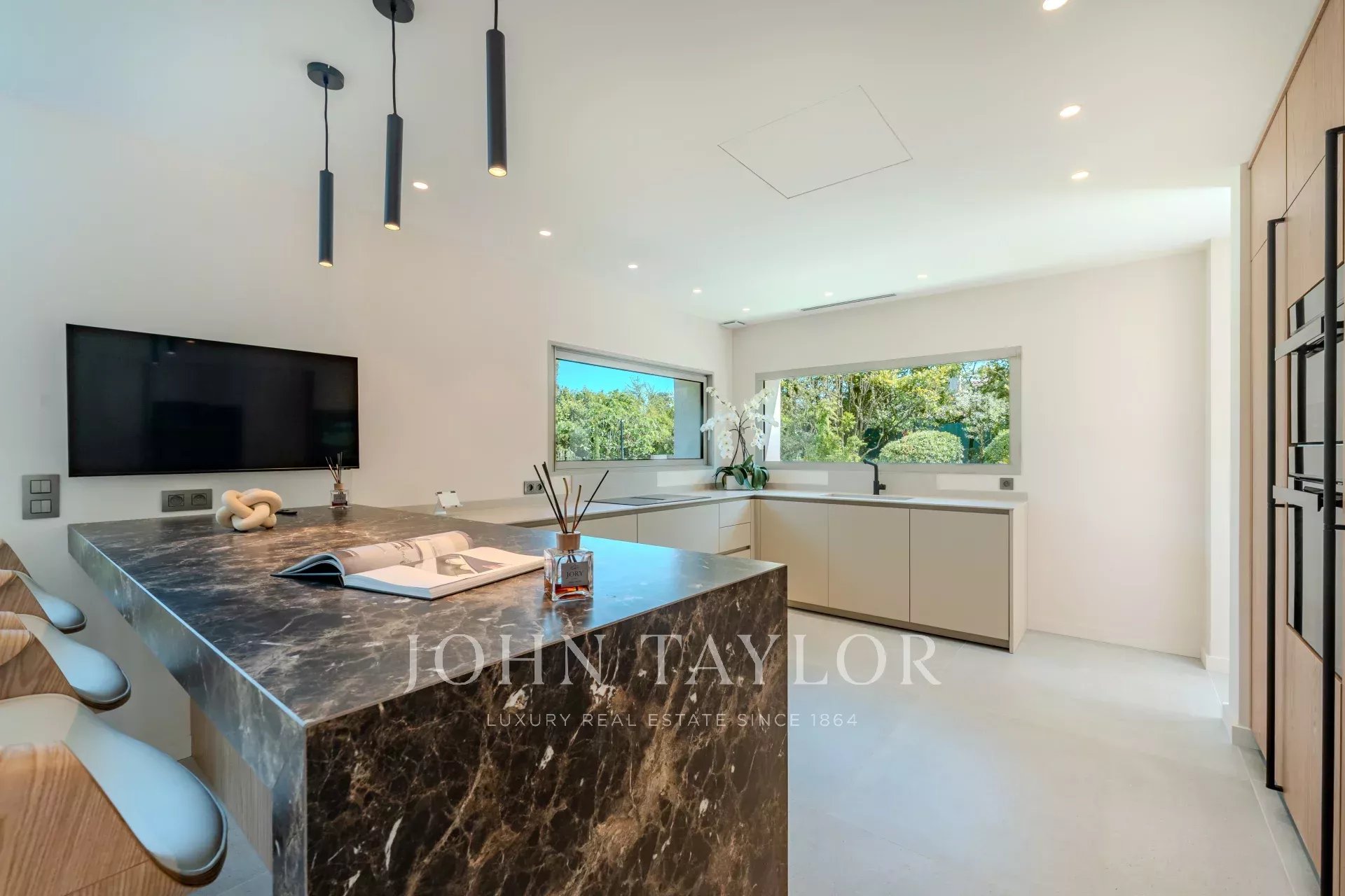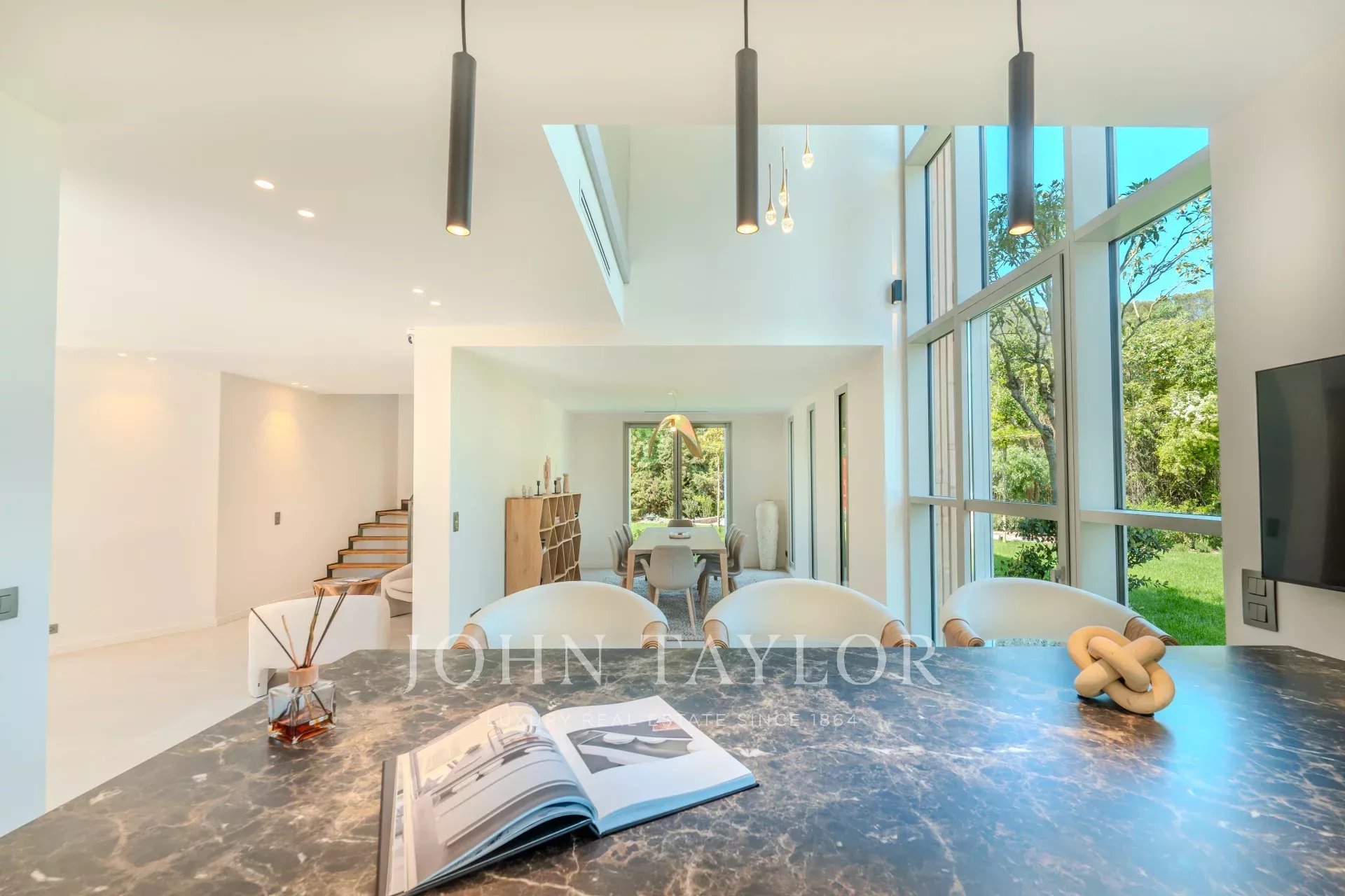 With a surface area of 300 m² on a landscaped plot of 1,715 m², it offers a vast, luminous living room with fireplace, a fully equipped kitchen, a fireplace-library area, a dining room and a large 100 m² terrace with lounge area.