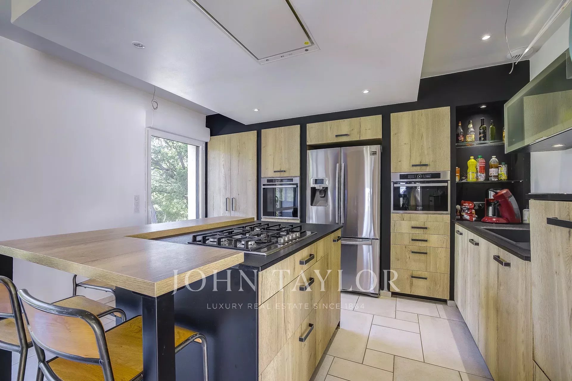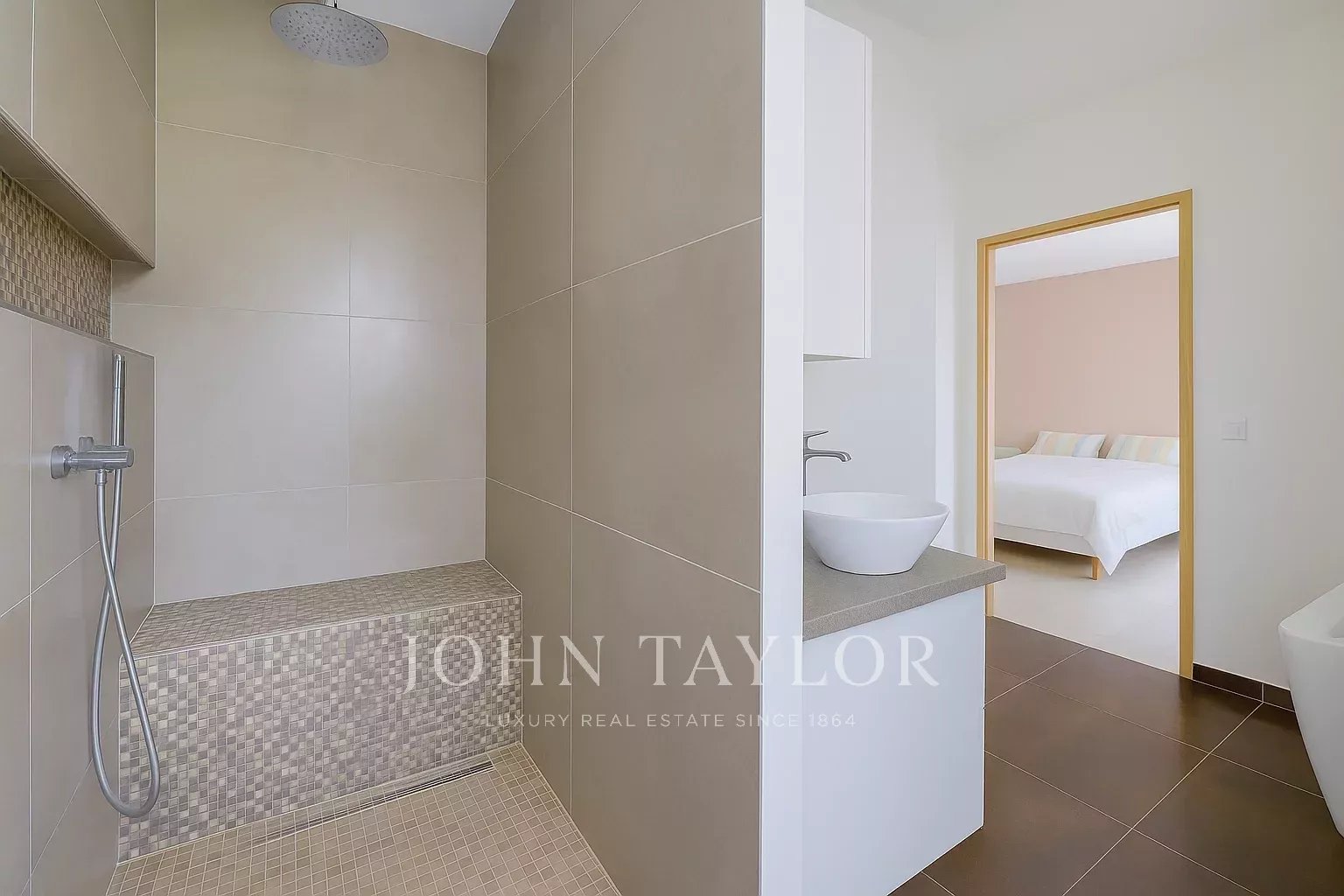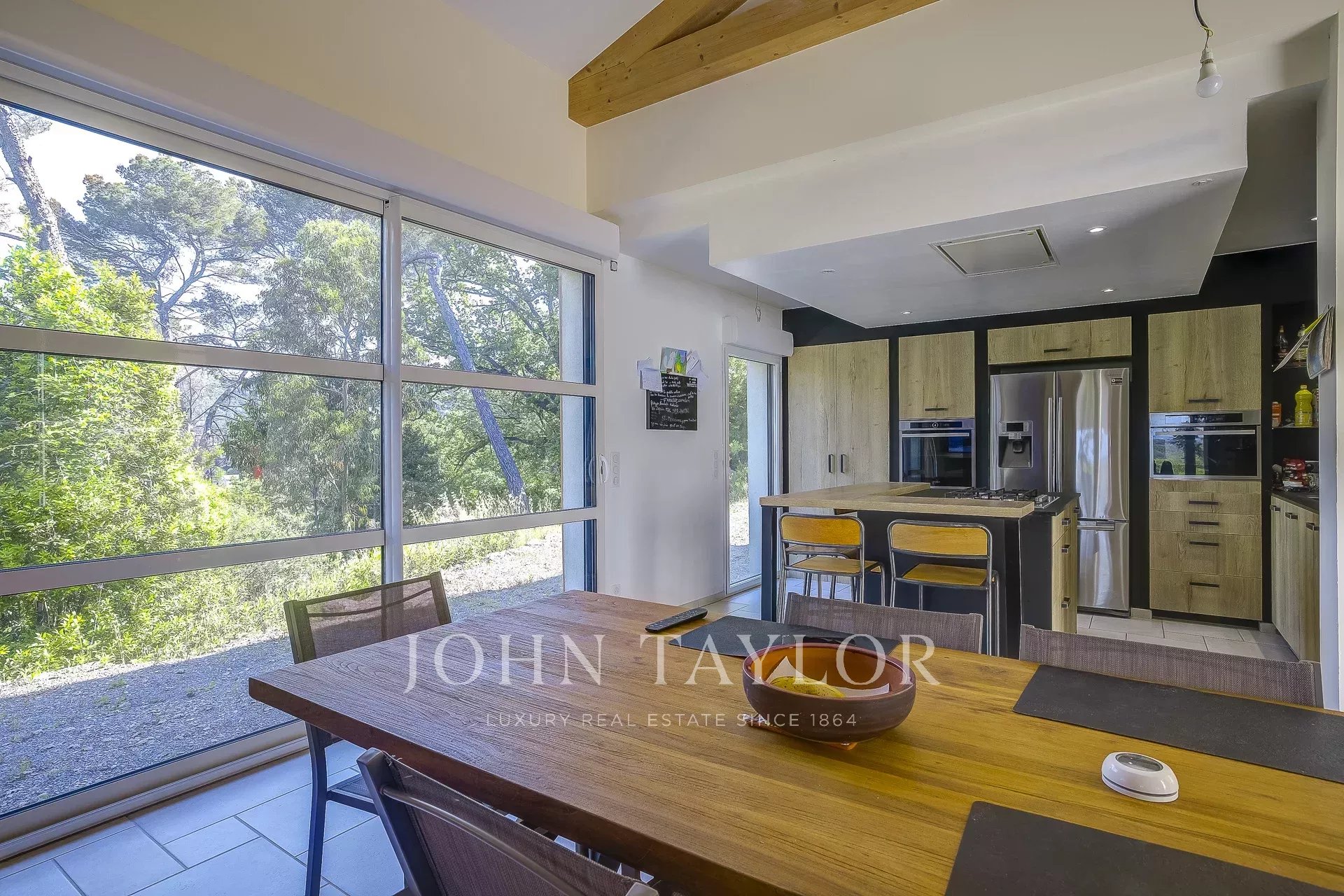 From the moment you enter the villa, you'll be seduced by its generous volumes. The 70 m² reception area features a cathedral living room and an elegant open kitchen, inviting you to share a convivial moment. This space opens harmoniously onto the exterior.