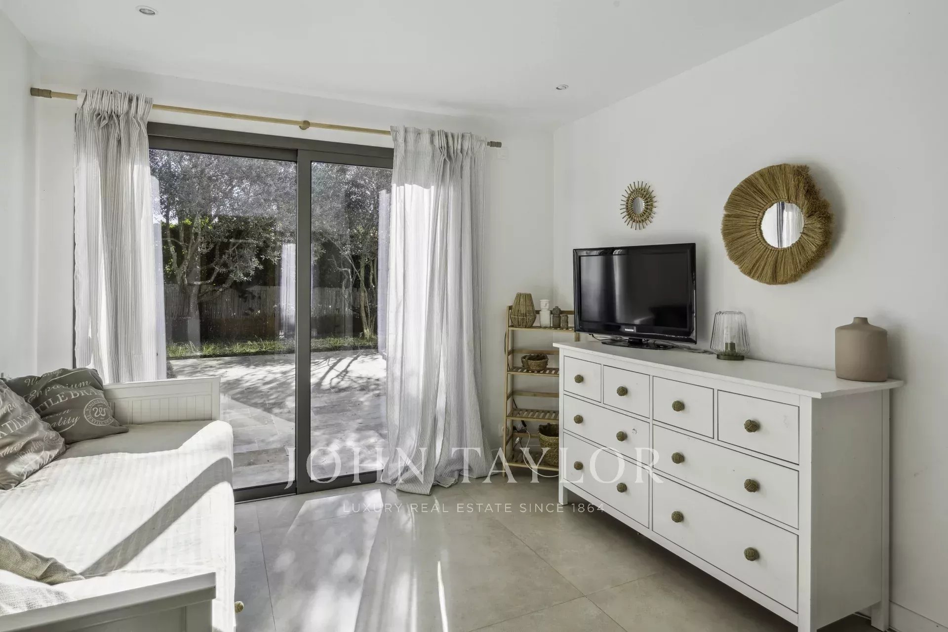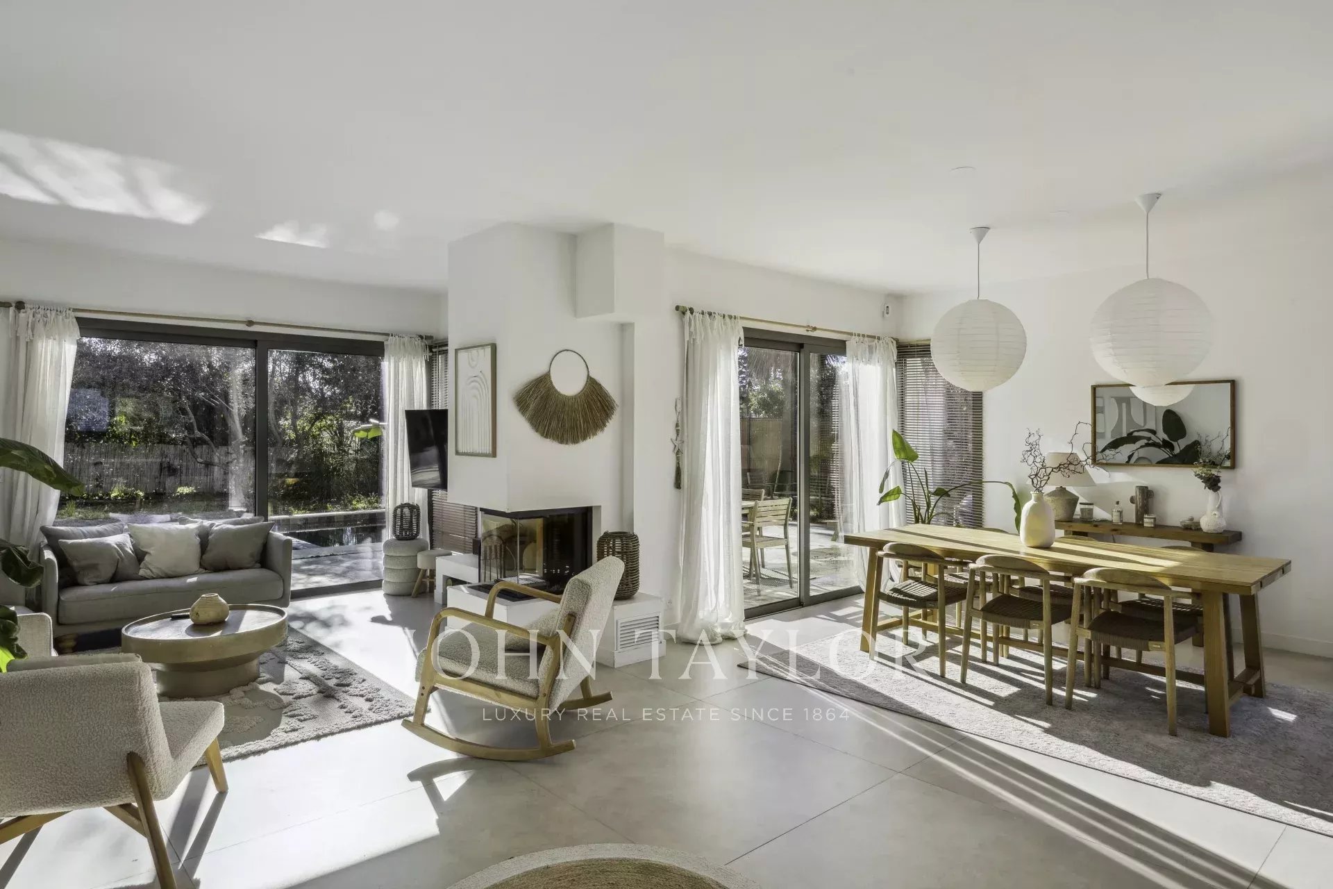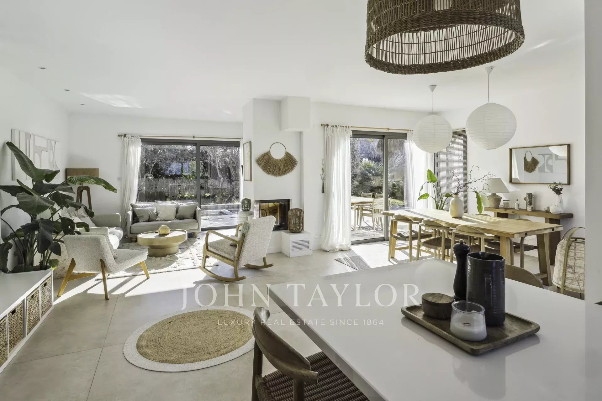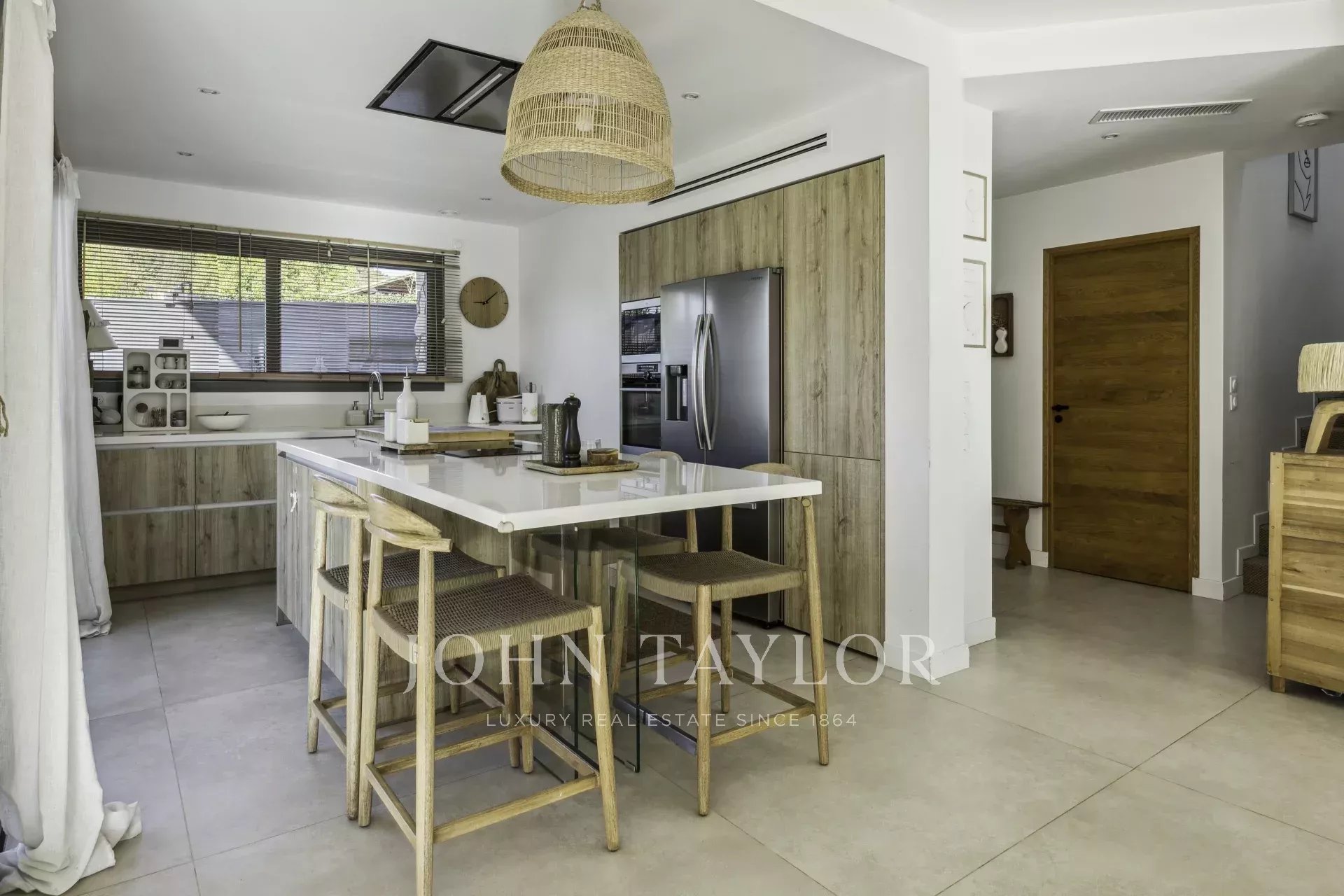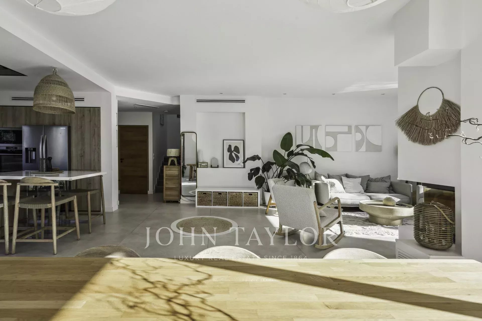 On the first floor, an entrance hall with built-in checkroom leads to a vast, light-filled living room, extended by a refined, fully-equipped open-plan kitchen. A bedroom with en-suite bathroom has direct access to the terraces and swimming pool.