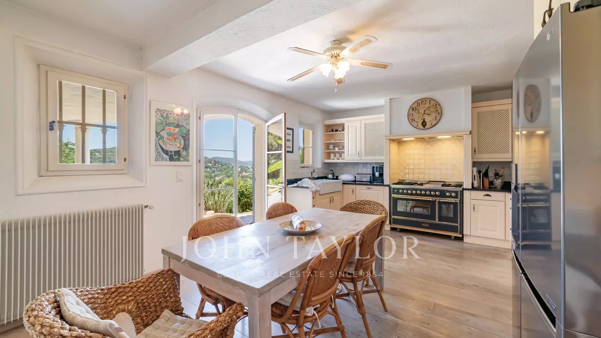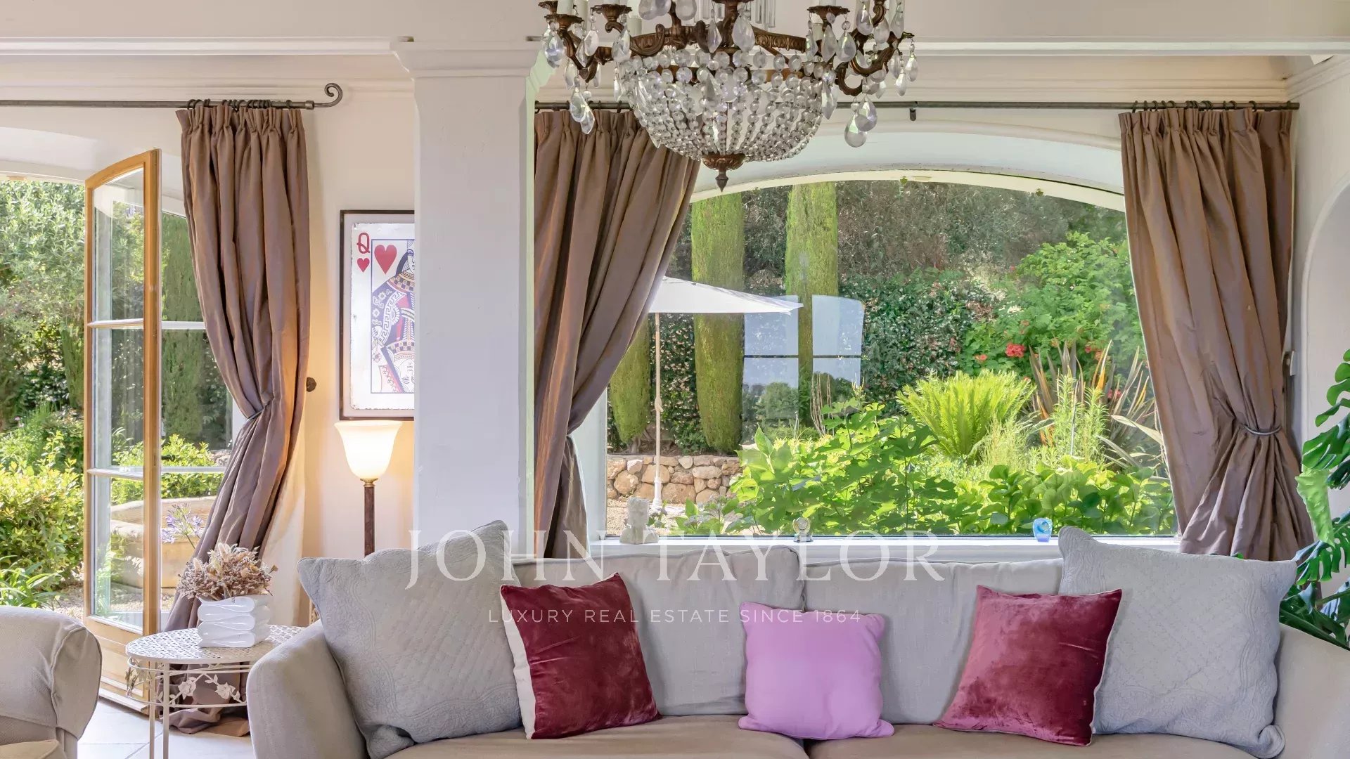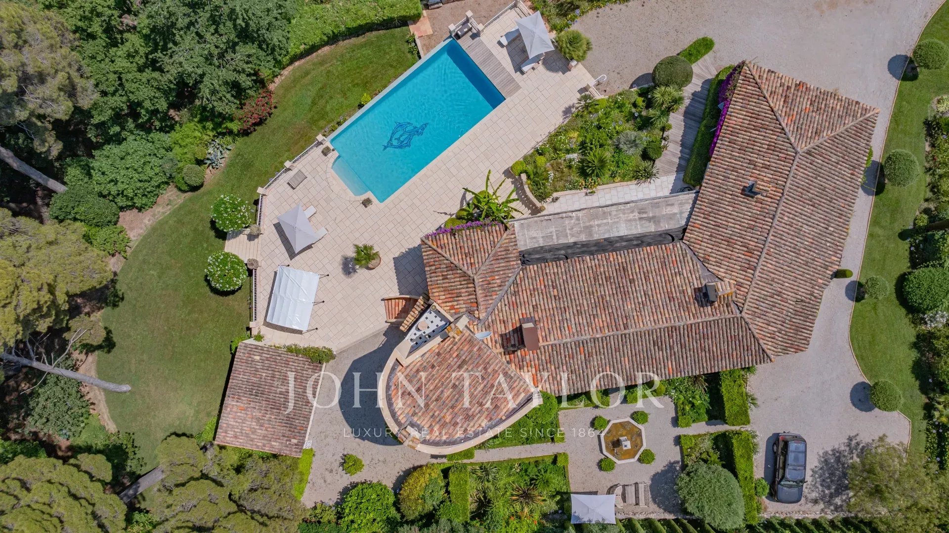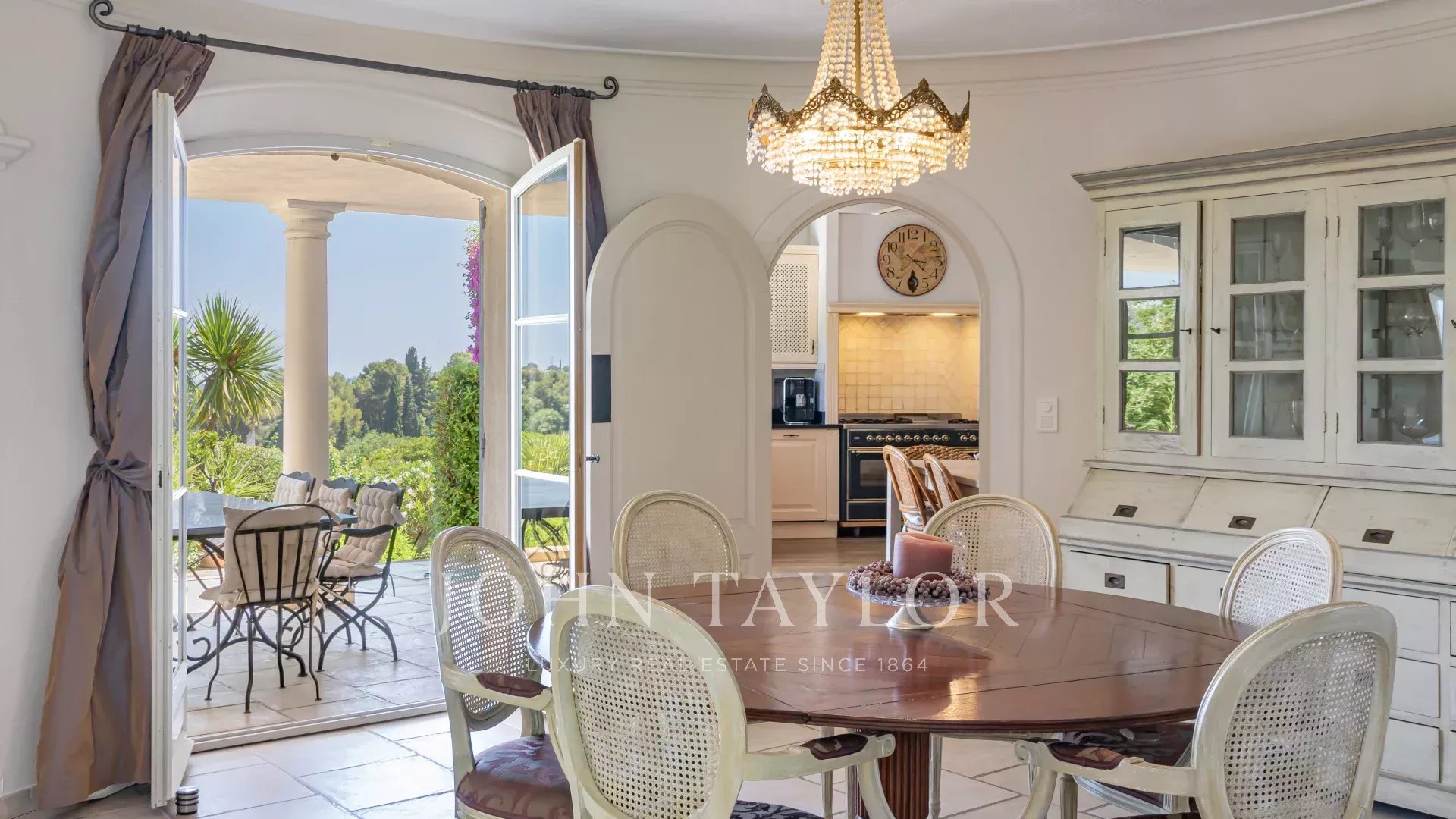 An elegant living room with fireplace opens onto a vast covered terrace with outdoor dining area. Behind the living room, a French garden with fountain.