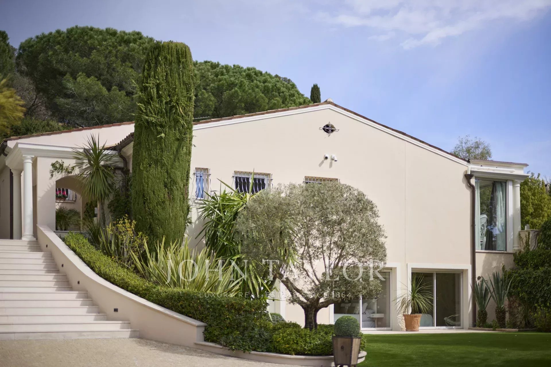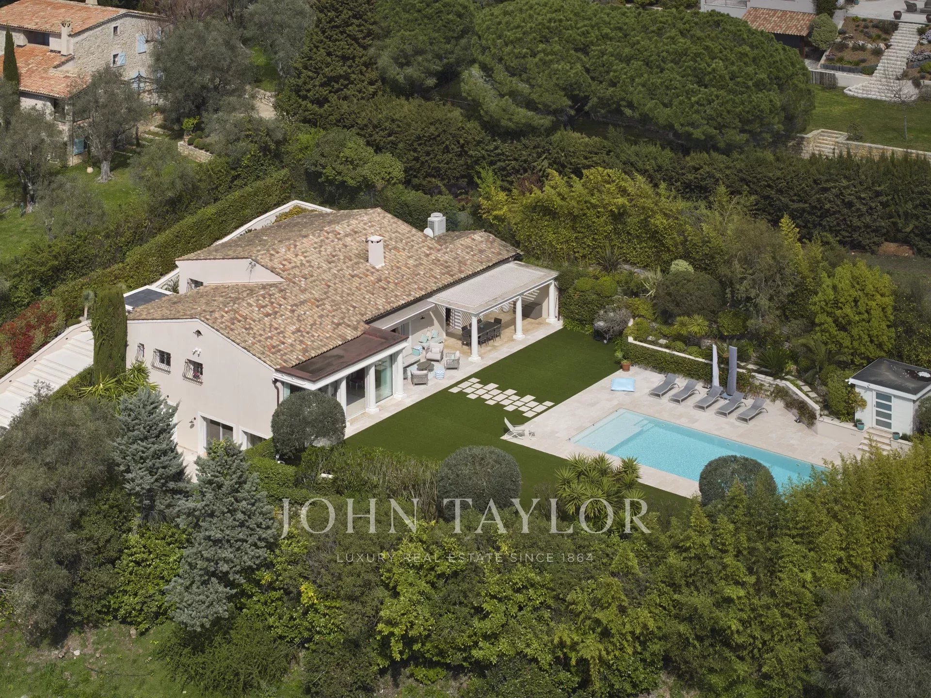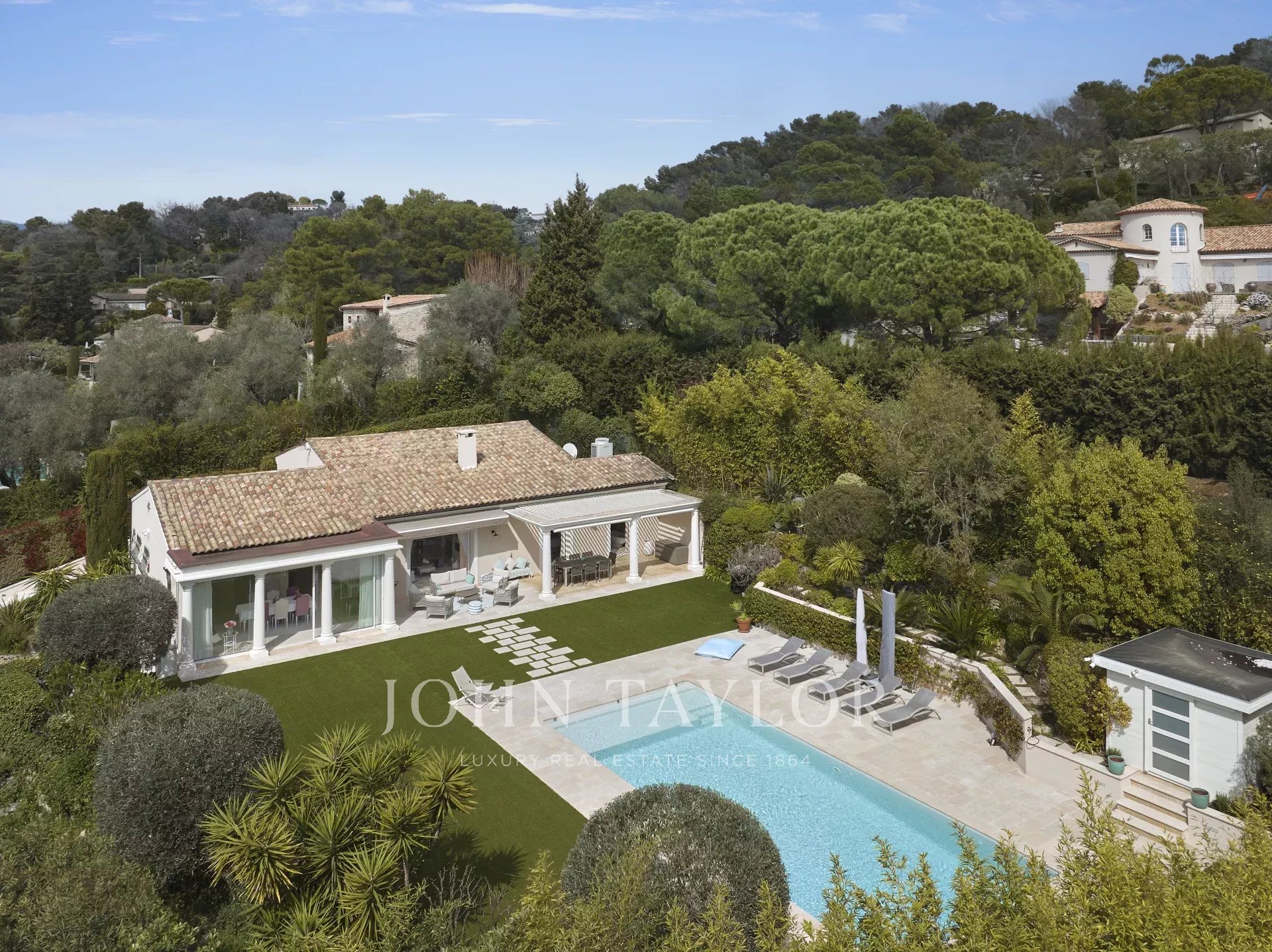 The 3,800 m² garden has been carefully landscaped and planted with Mediterranean species. The property enjoys a remarkable, unobstructed view over the picturesque village of Mougins, enhancing this exceptional living environment.
