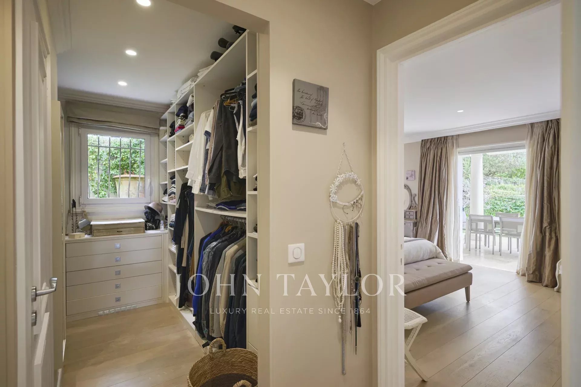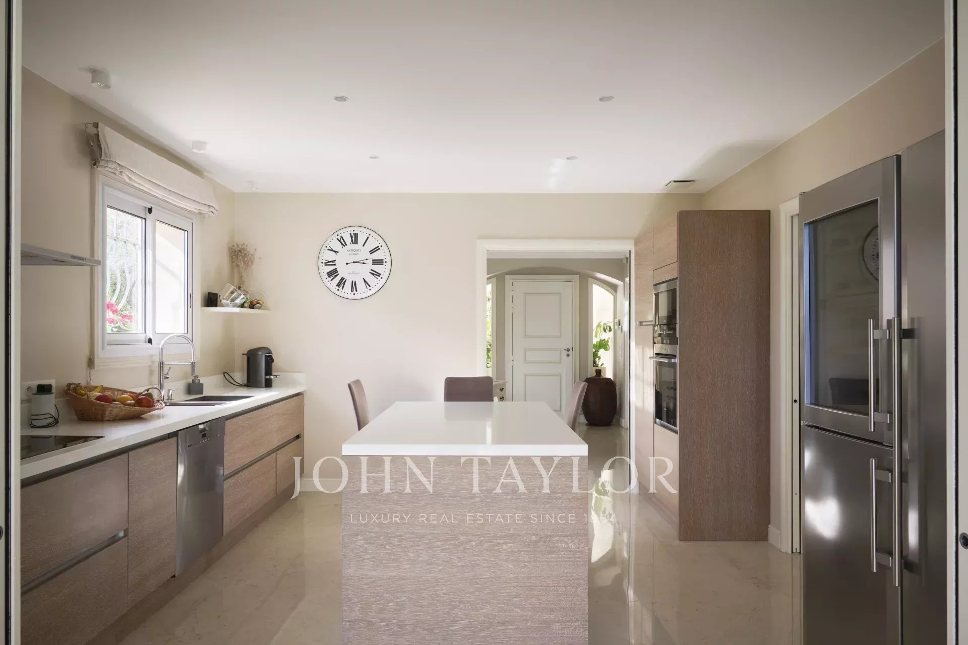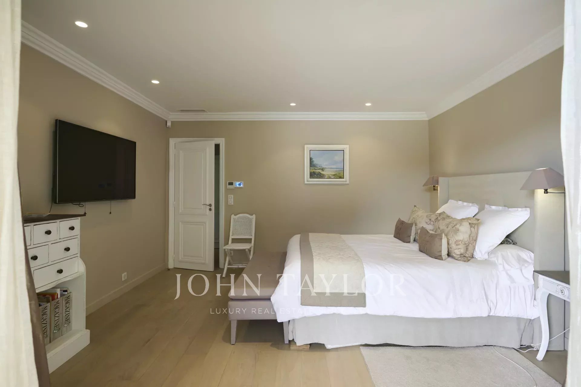 The main level features a vast, light-filled living room with fireplace, and an elegant dining room. The fully-equipped kitchen flows seamlessly into this convivial space. This level also includes a guest toilet, as well as the master suite, with its spacious dressing room and private bathroom. Two further bedrooms, each with its own dressing room and bathroom, complete this floor.