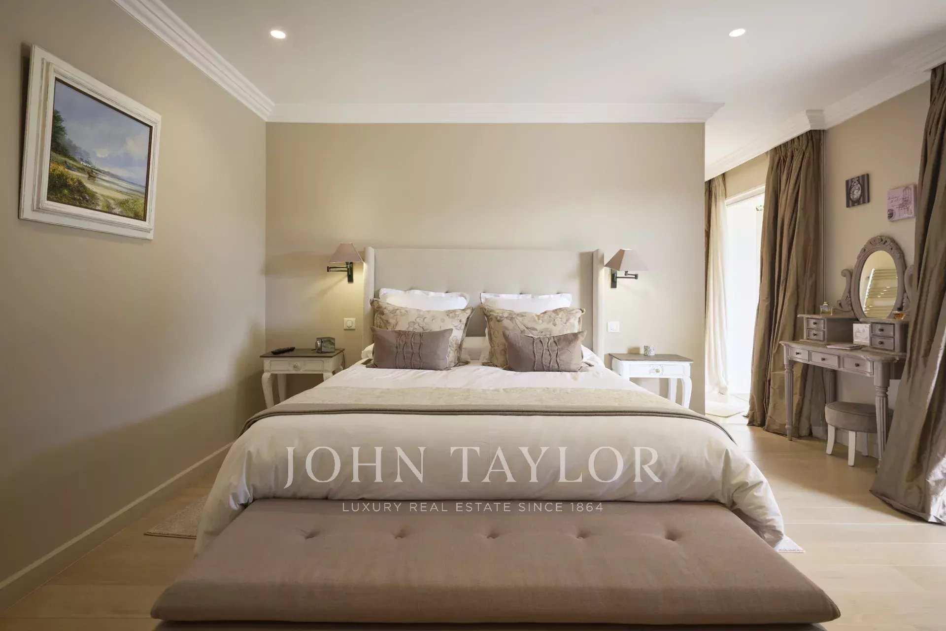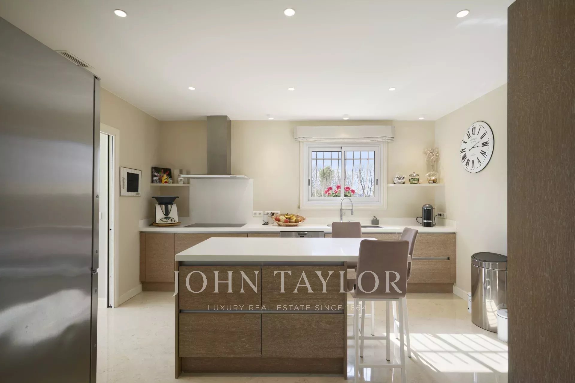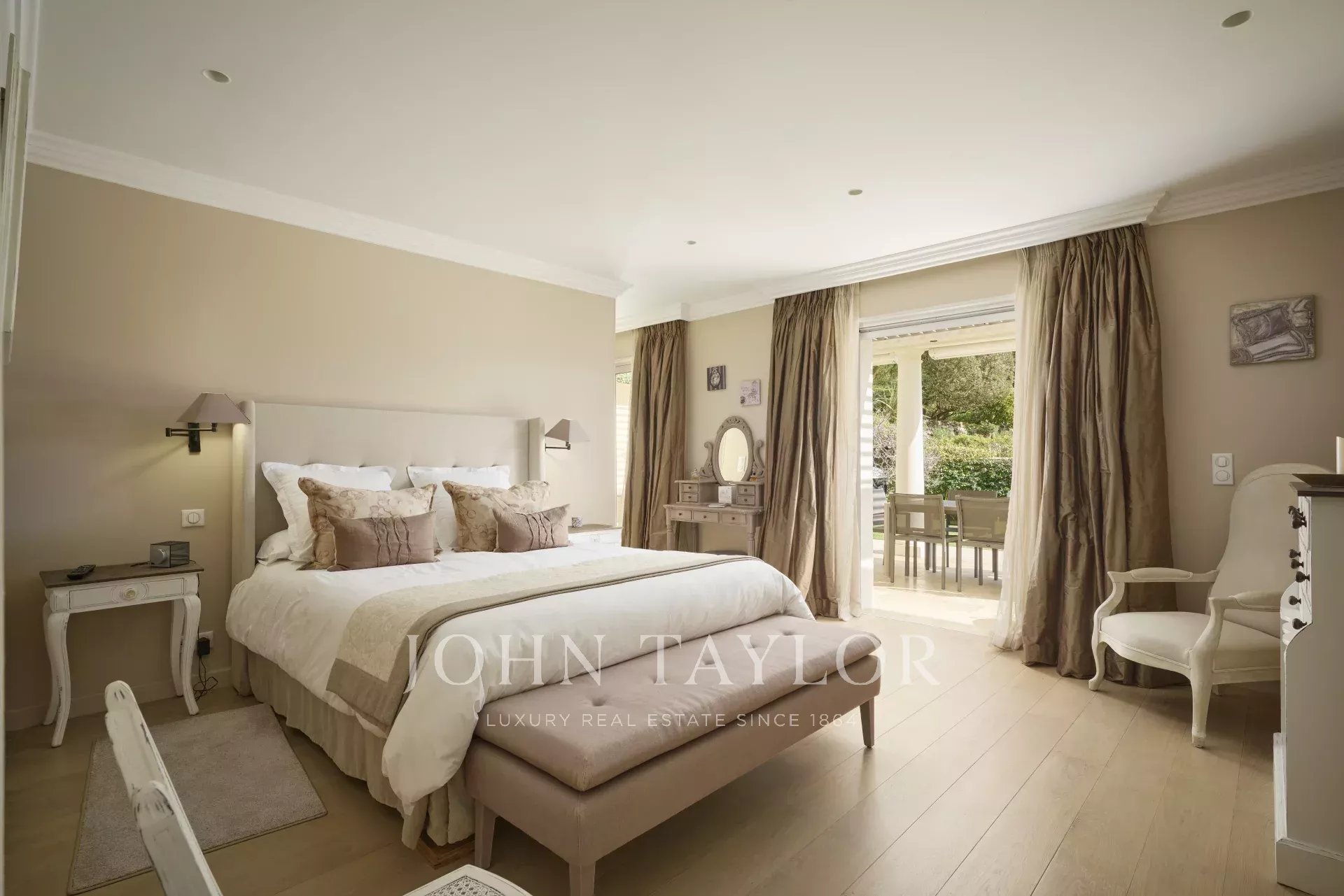The main level features a vast, light-filled living room with fireplace, and an elegant dining room. The fully-equipped kitchen flows seamlessly into this convivial space. This level also includes a guest toilet, as well as the master suite, with its spacious dressing room and private bathroom. Two further bedrooms, each with its own dressing room and bathroom, complete this floor.