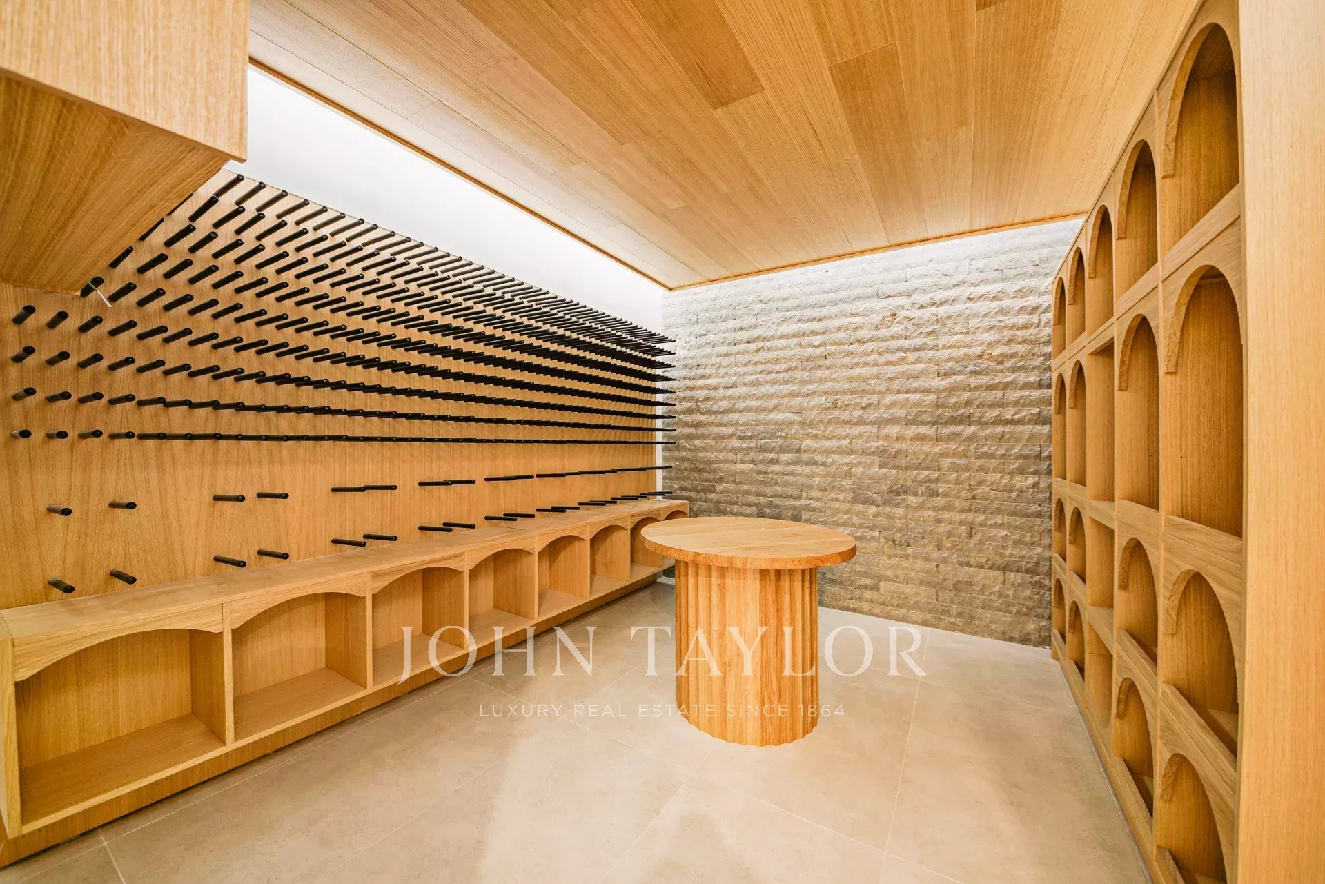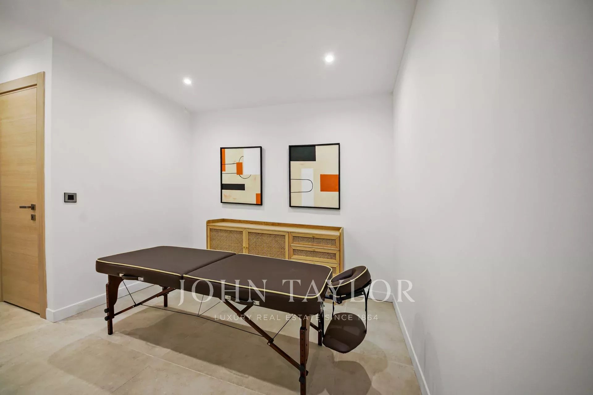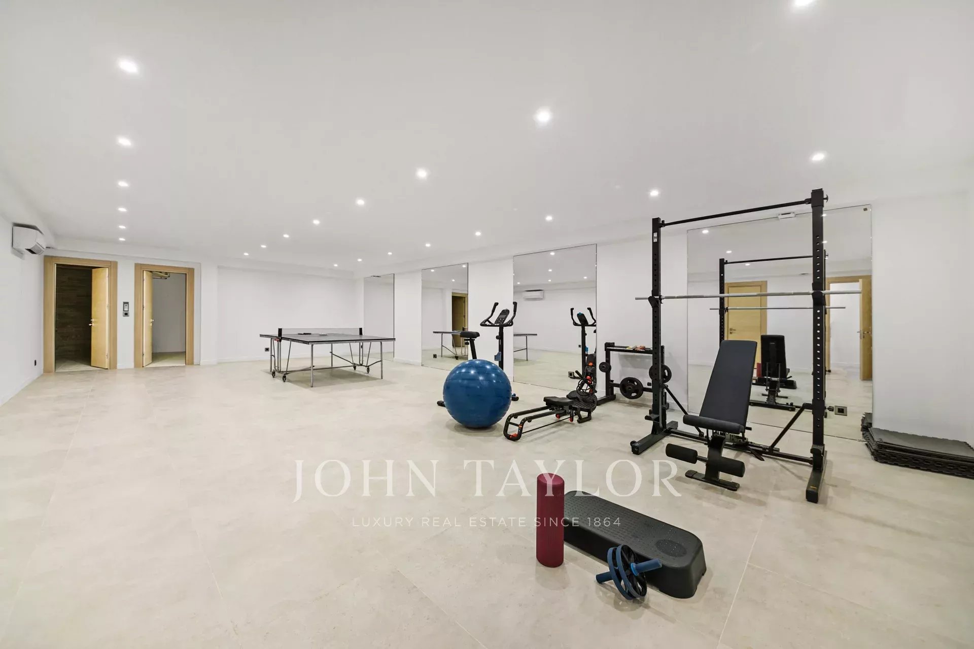 It features a bright living room, four bedrooms, a functional open kitchen, a generous swimming pool and a terrace surrounded by a small garden. The basement houses a gym, a fully equipped wine cellar, a cinema room and a sauna, creating a space dedicated to relaxation and leisure.
