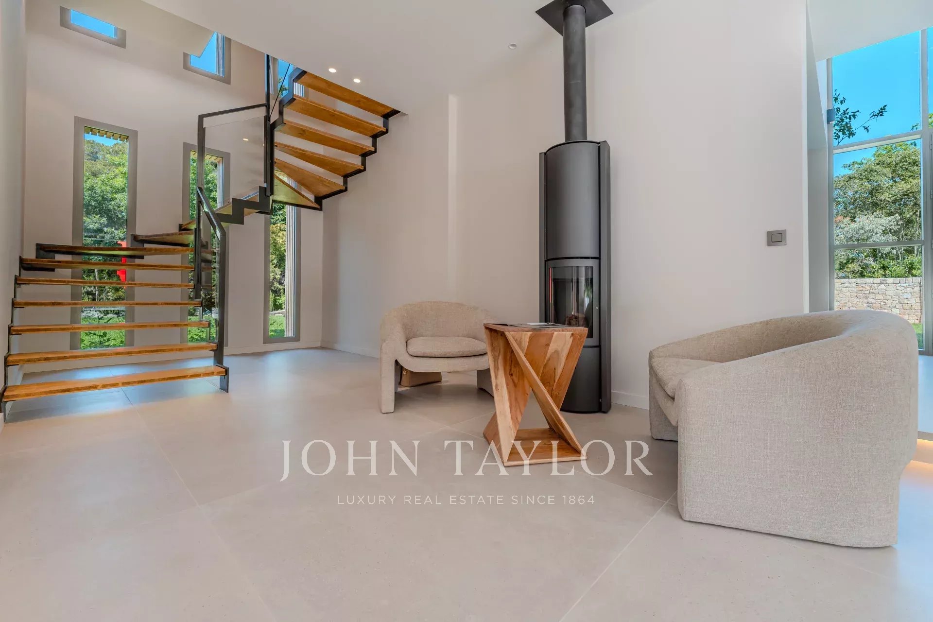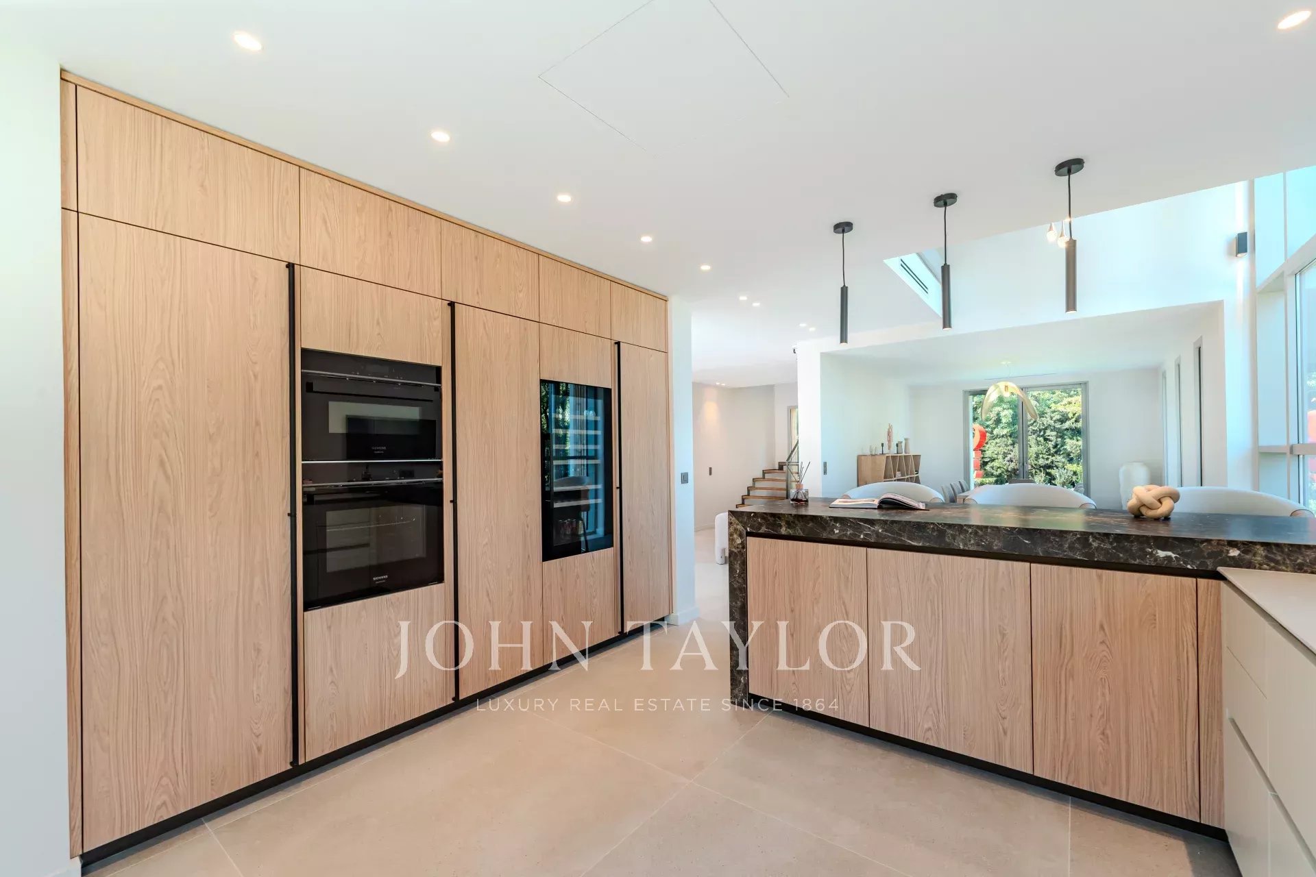 With a surface area of 300 m² on a landscaped plot of 1,715 m², it offers a vast, luminous living room with fireplace, a fully equipped kitchen, a fireplace-library area, a dining room and a large 100 m² terrace with lounge area.