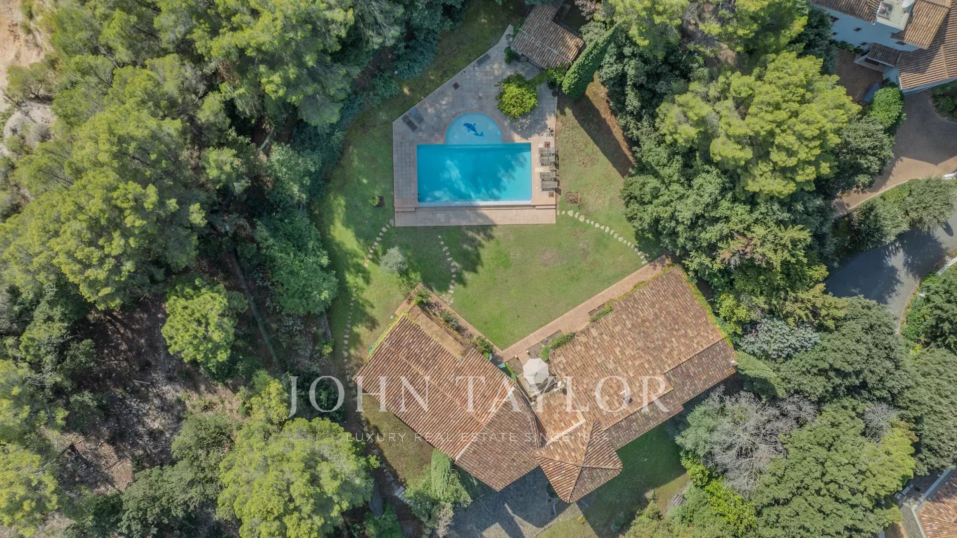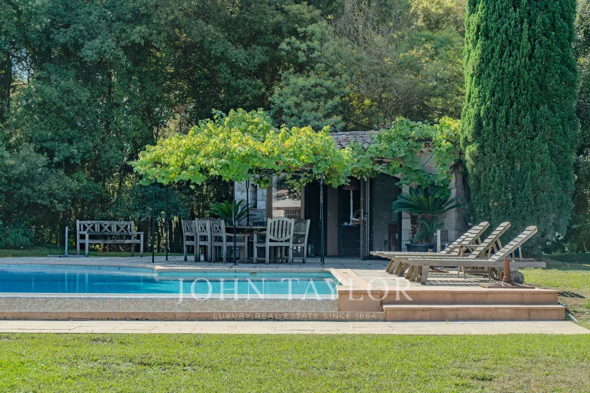 On the garden level, all rooms open onto a flat, sun-drenched plot leading to a splendid pool area with its secluded pool house—an invitation to serene and private moments.