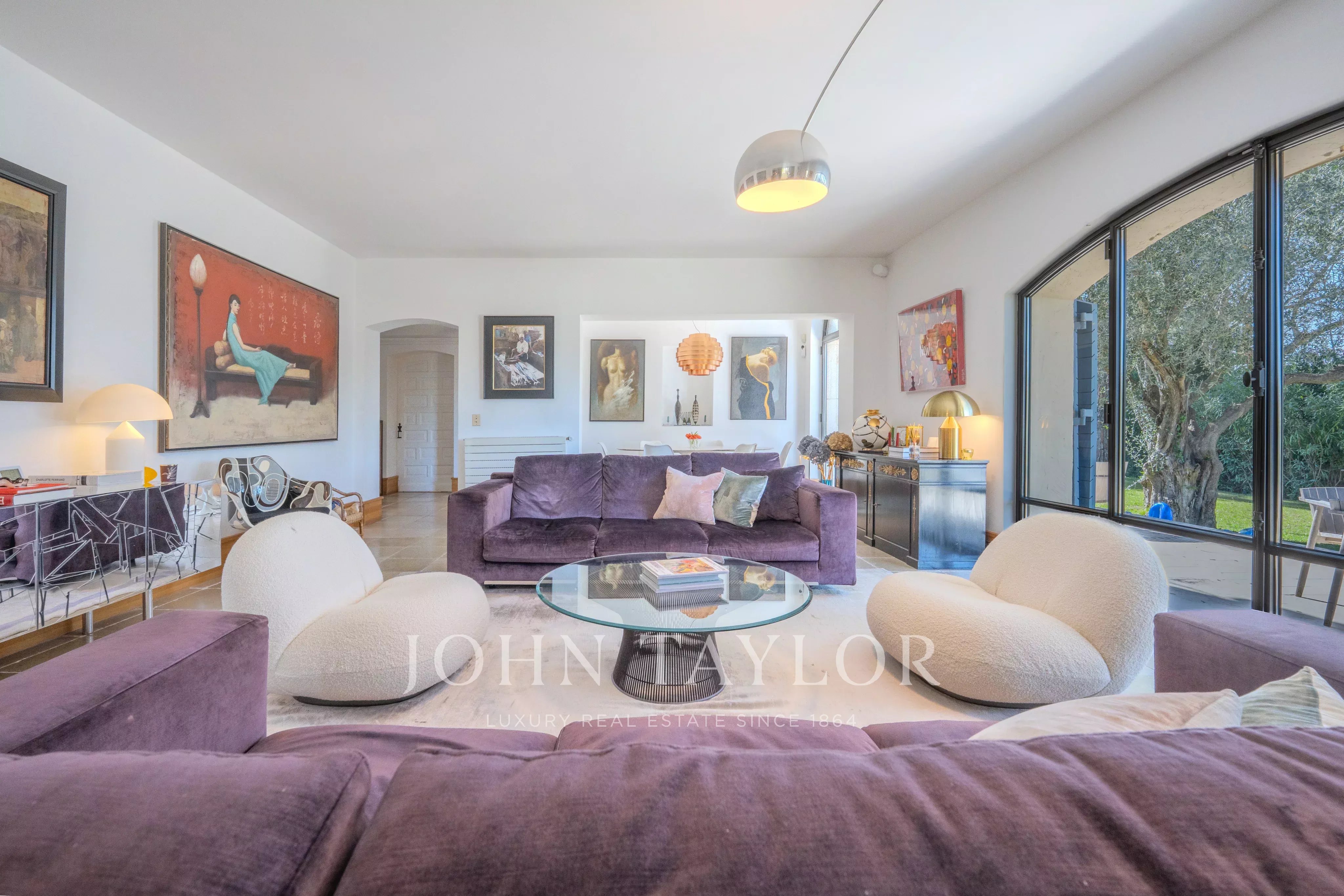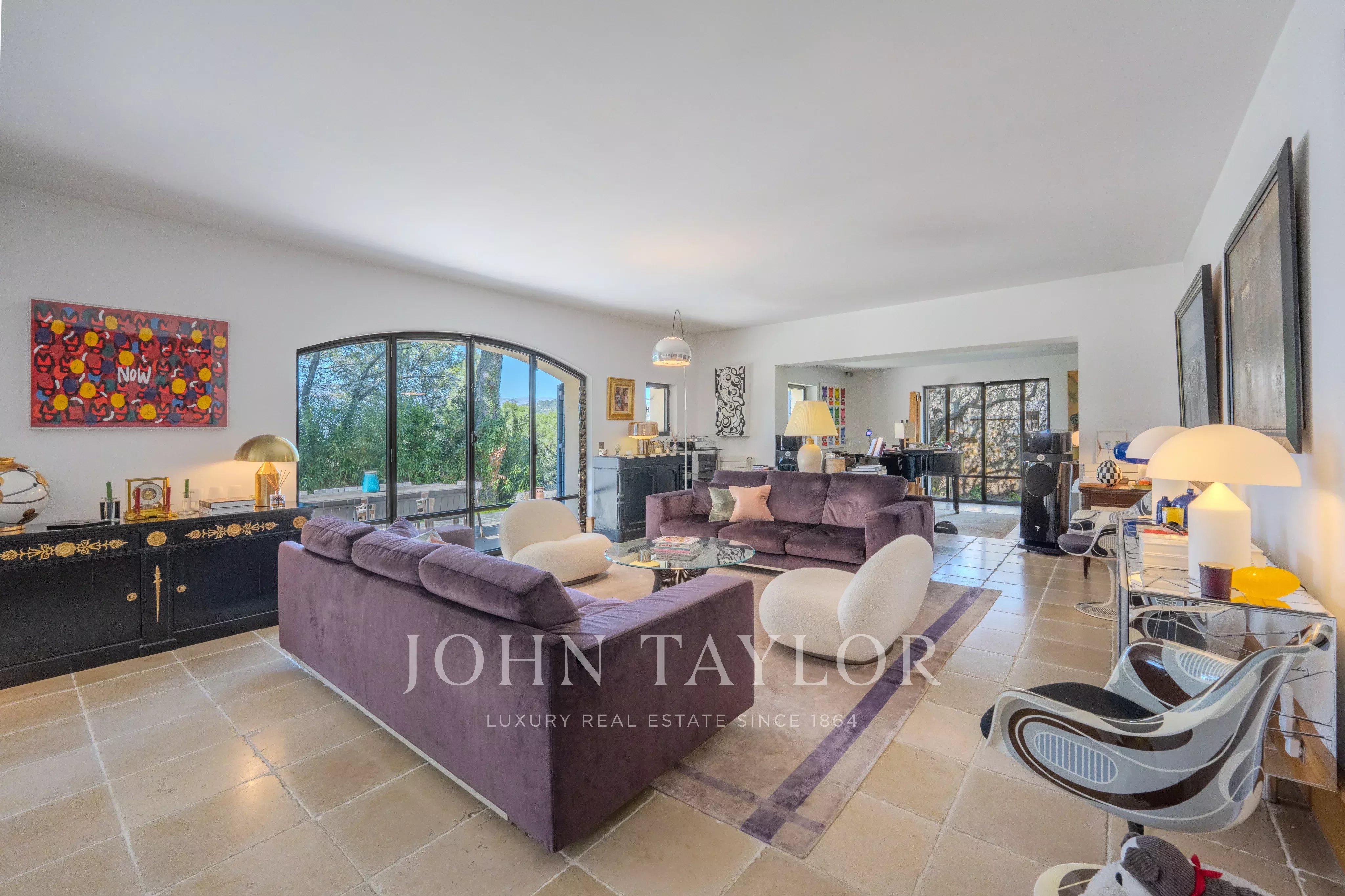 From the entrance, the property reveals a large living space harmoniously structured into several ambiances: a reception lounge, a music area, a cozy fireplace corner, and an office, offering an atmosphere that is both convivial and refined. A dining room and a spacious kitchen complete this single-story ensemble.