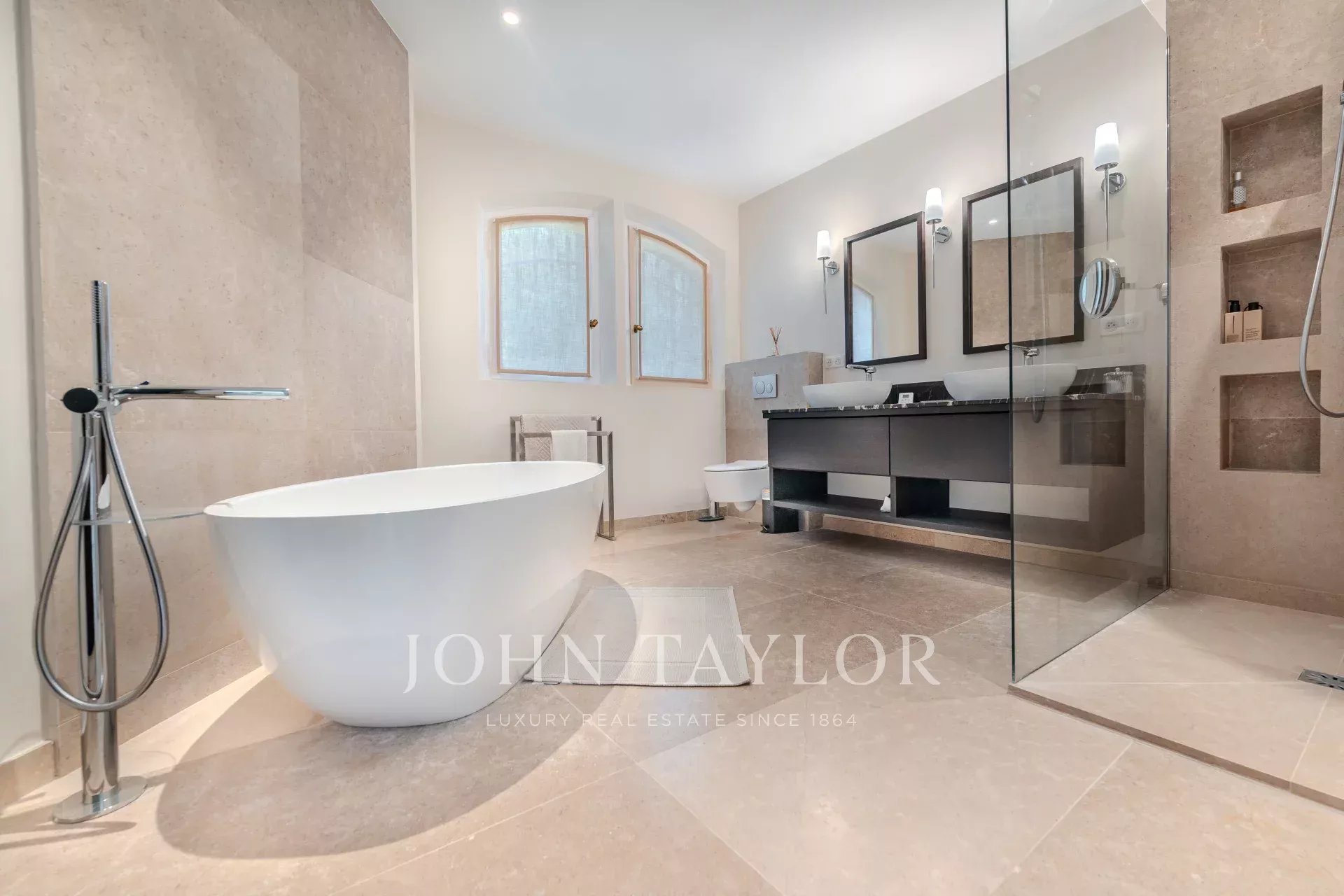 On the ground floor, three spacious en-suite bedrooms, including a superb principal suite, open directly onto the terraces, garden and swimming pool, creating a seamless indoor-outdoor lifestyle.