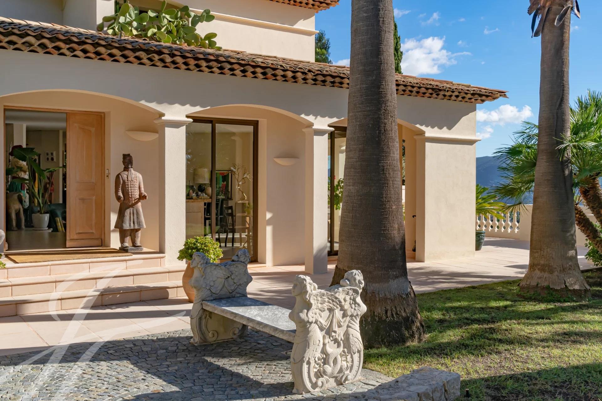Located in a discreet and privileged domain, in a dominant position facing South-East, this modern style property, very well maintained, offers an unobstructed panoramic view over the Mediterranean sea up to the Cap d'Antibes as well as over the hills of Nice, Mont Vinaigrier - Mont Boron and beyond.