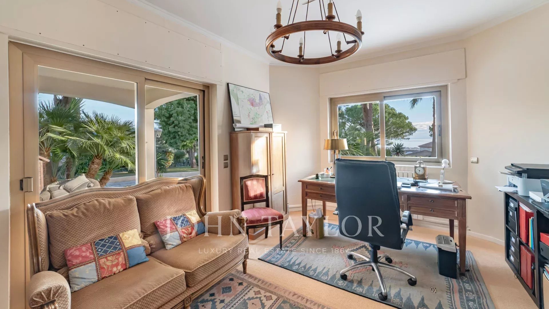 Nestled in absolute tranquility, it features a superb landscaped garden of approximately 2,000 m², elegantly planted with palm trees and umbrella pines.