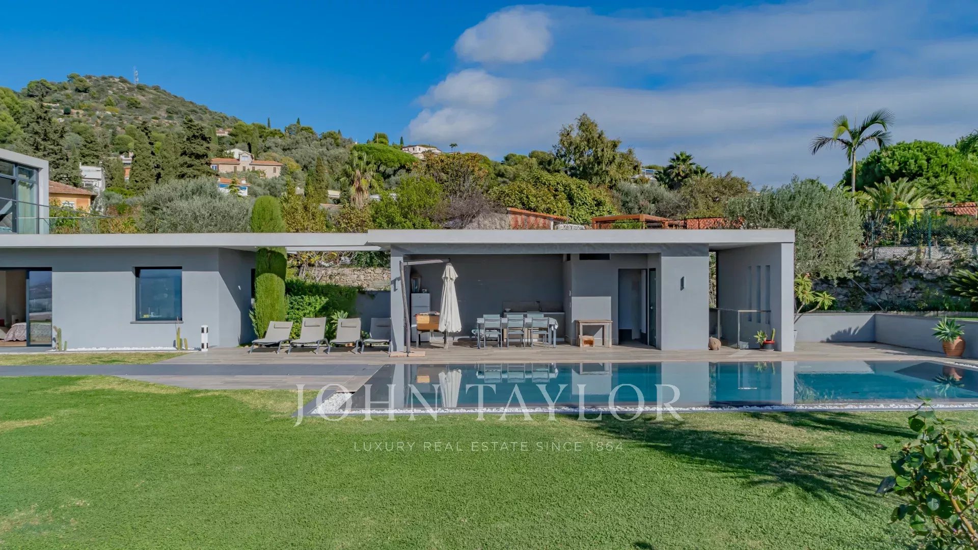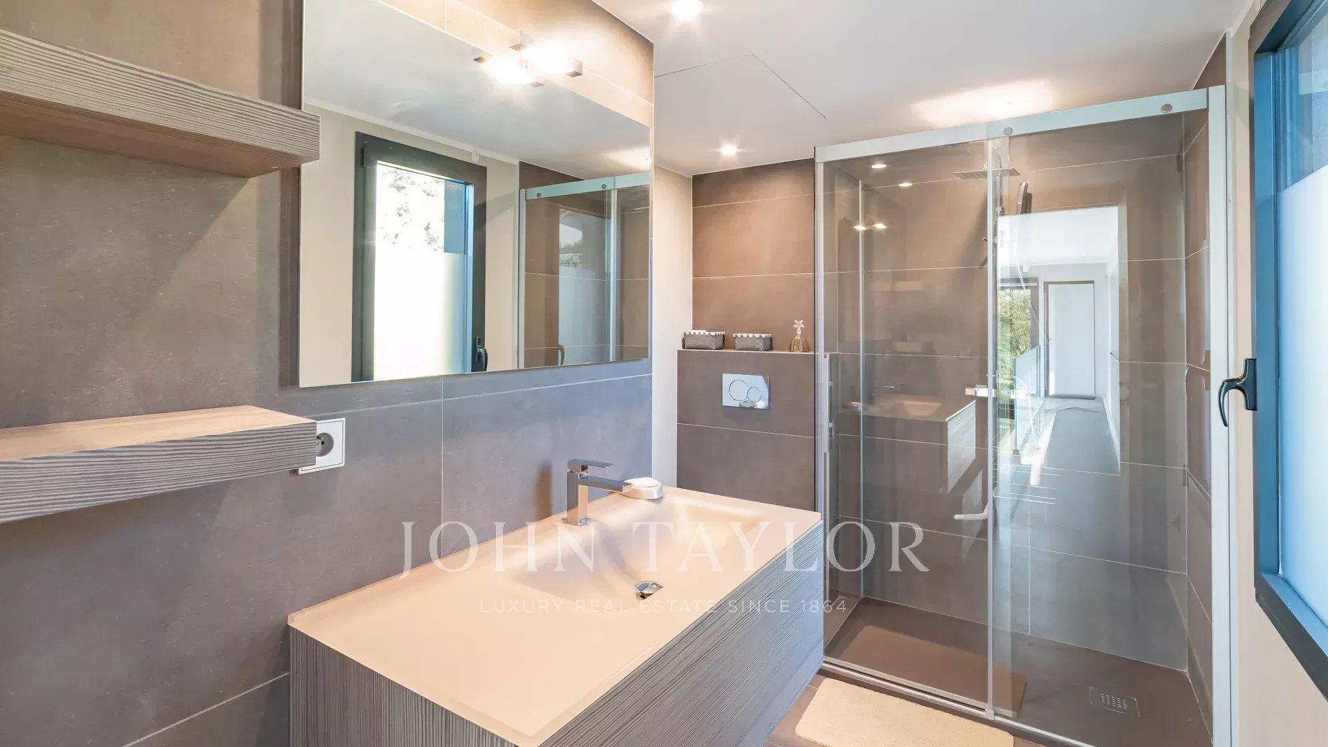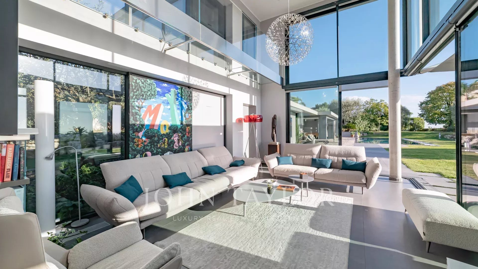 The contemporary villa offers a total surface area of 490 m2 (inc 278 m2 of living surface) and is harmoniously set on a flat plot of 2560 m2, entirely landscaped and planted with rare Mediterranean species. The beautiful, large mirror-finish swimming pool is surrounded by sunbathing areas and includes a pool house.