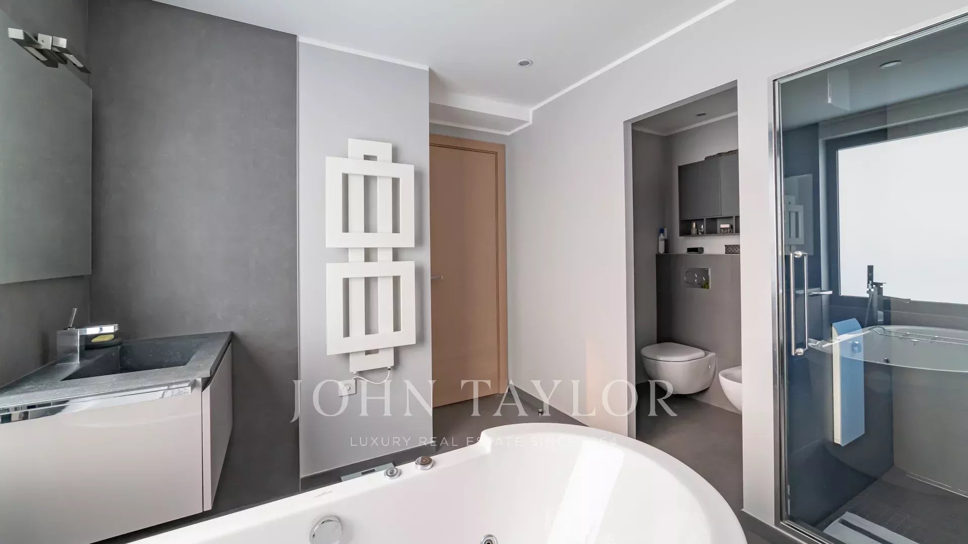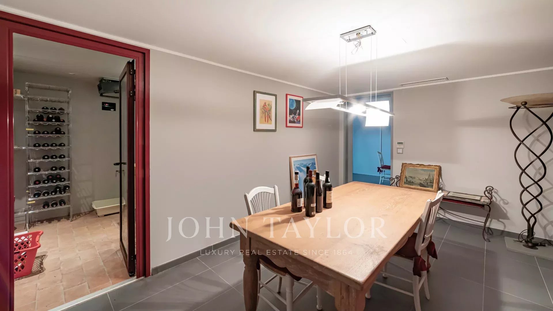 The garden level opens onto a vast entrance that leads to the living areas: a warm and inviting lounge, a dining room shared with a fitted and equipped kitchen and a utility/laundry room. Two en suite bedrooms, including a master with dressing room and bathroom, also occupy this level.